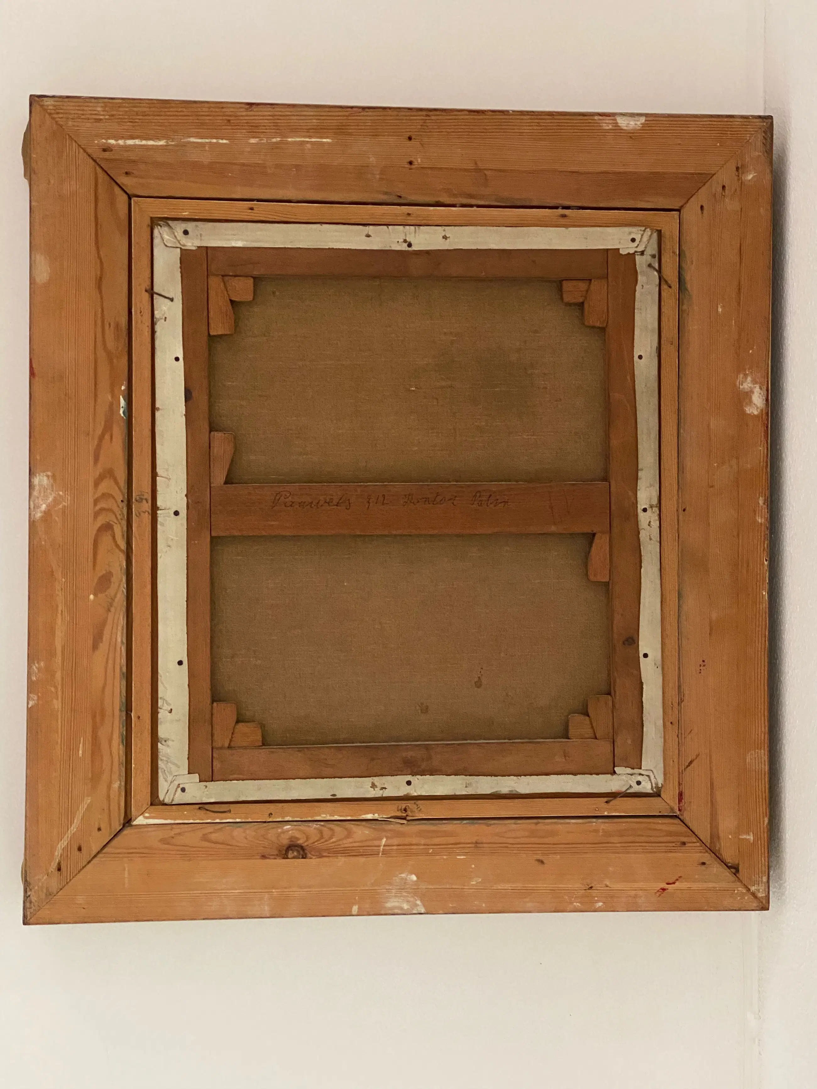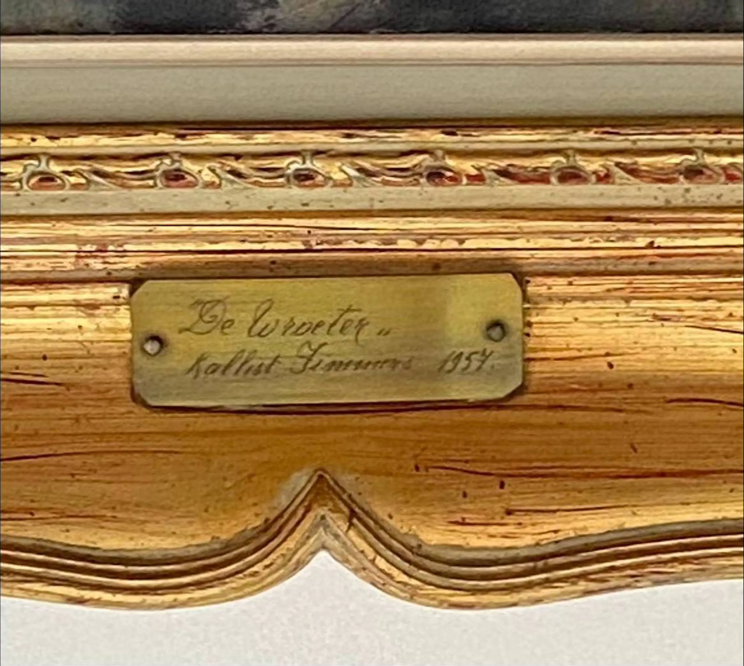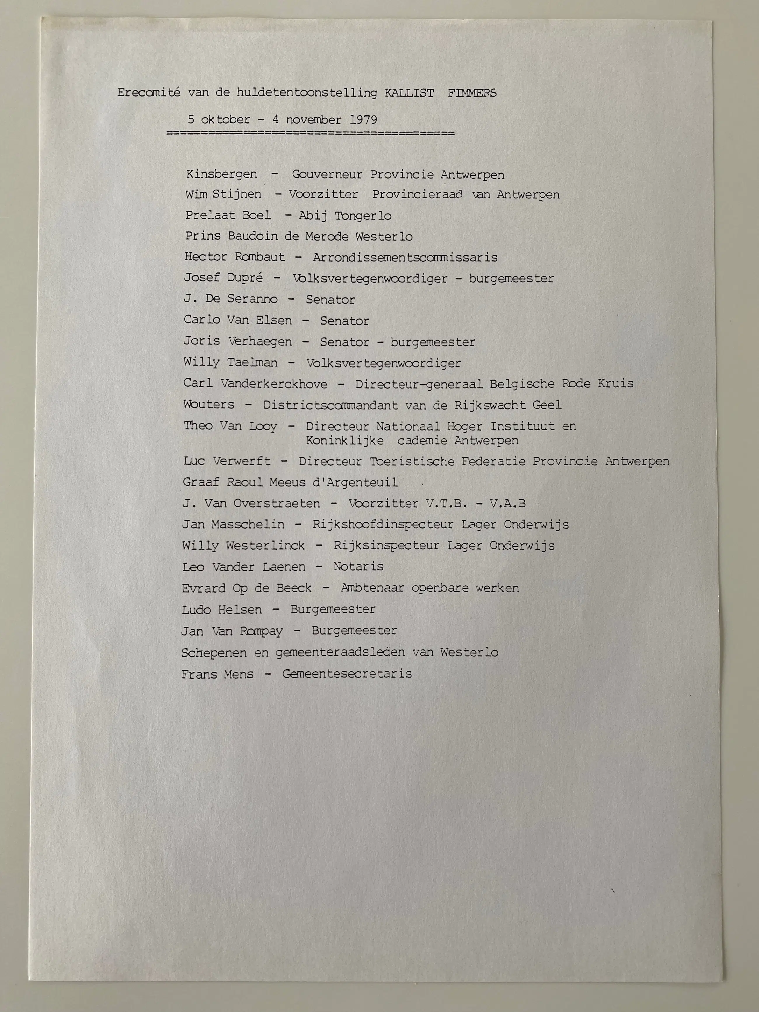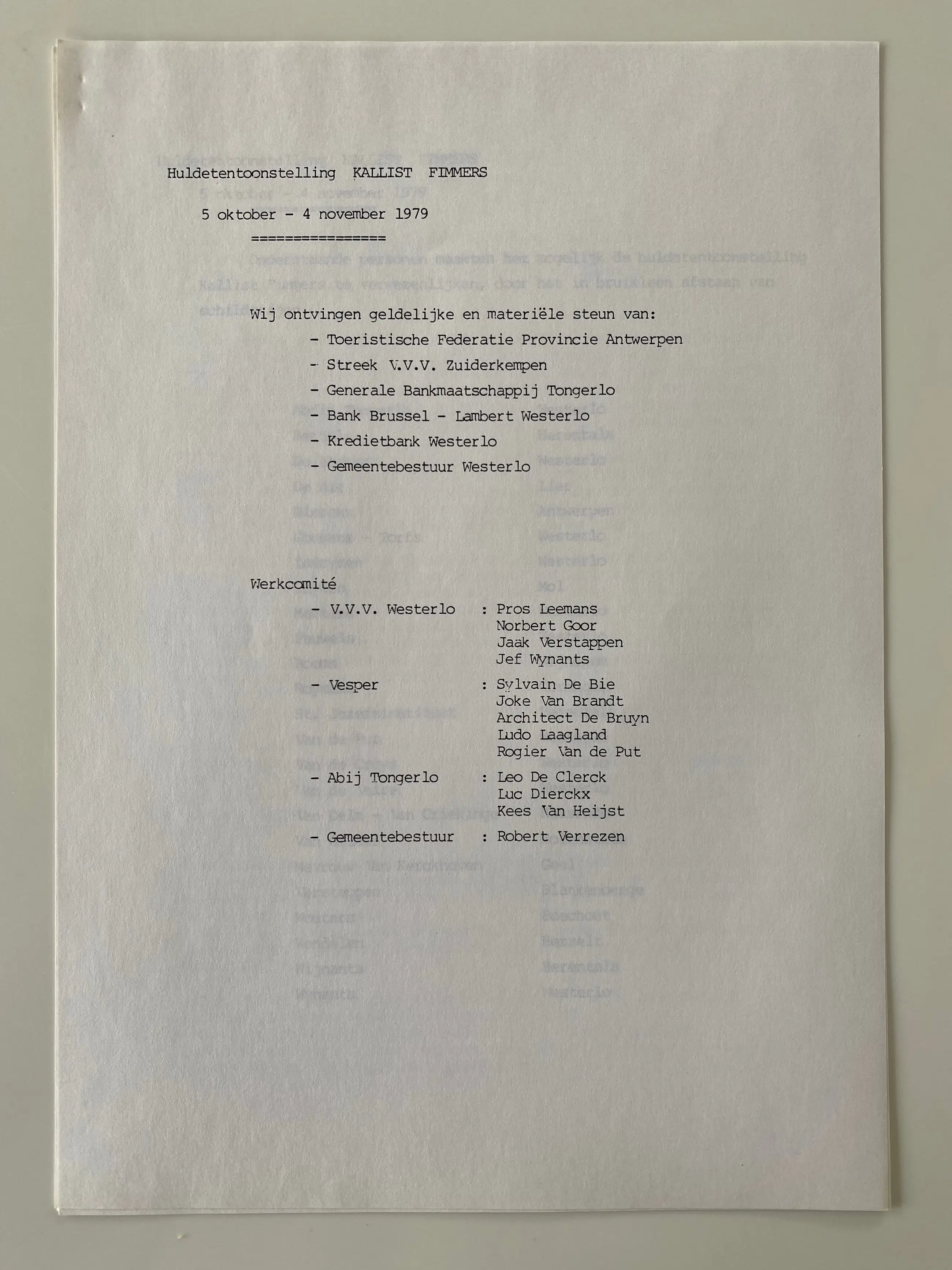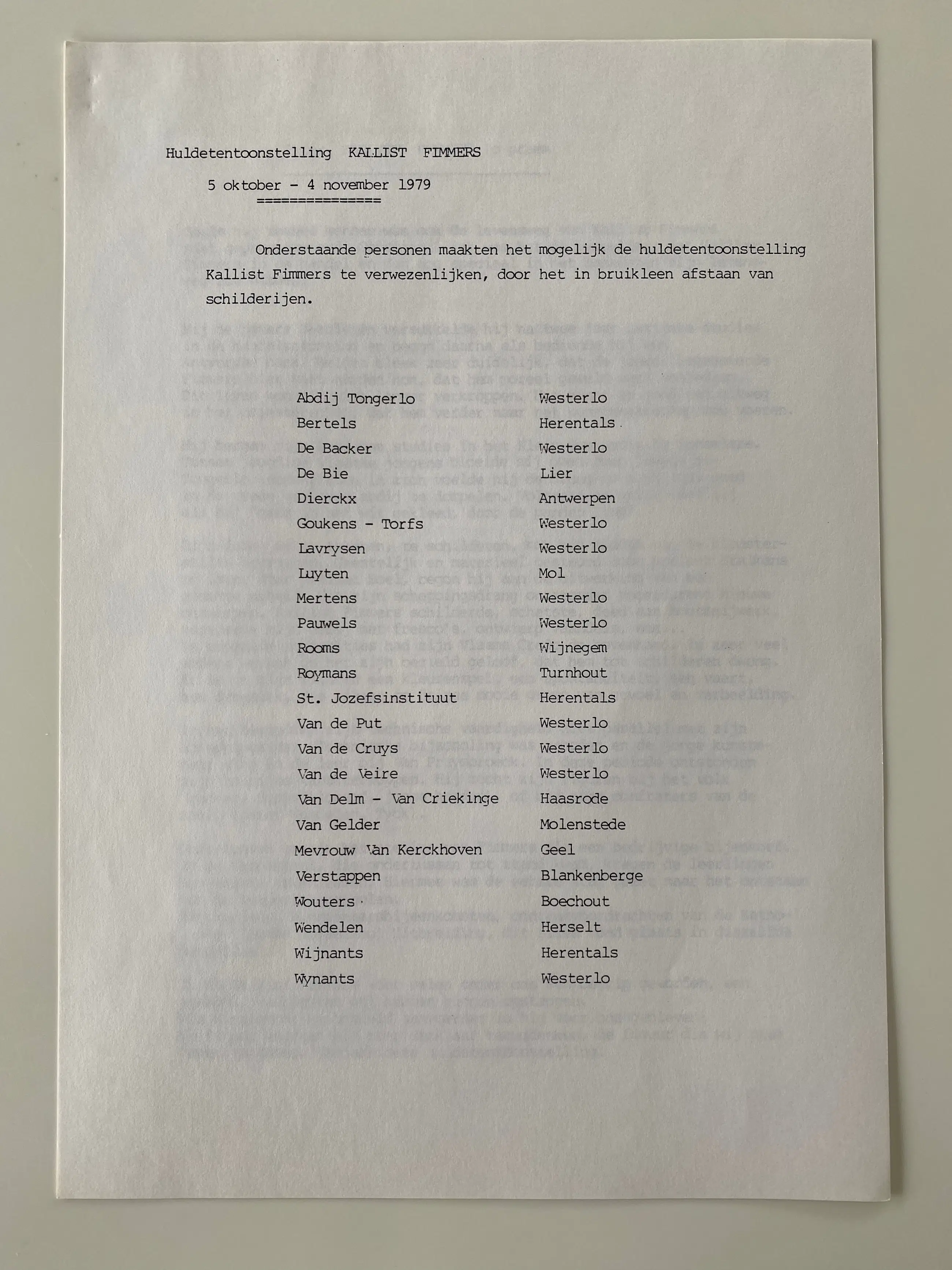 Kallist Fimmers was een Belgische kunstenaar geboren in 1906 en overleden in 1969. In 1979 werd een Huldetentoonsstelling gehouden die gesponsord werd door grote bedrijven zoals Generale Bank, Bank Brussel Lambert, Kredietbank, gemeentebestuur Westerlo en Toeristische Federatie Provincie Antwerpen. Vele kunstverzamelaars hebben werken ter beschikking gesteld om deze tentoonstelling mogelijk te maken, waaronder ook mijn nonkel Gerard Pauwels. Het schilderij is voorzien van een uitgebreide map met omschrijving van de tentoonstelling en 8 copies in A4 formaat van zijn werken.