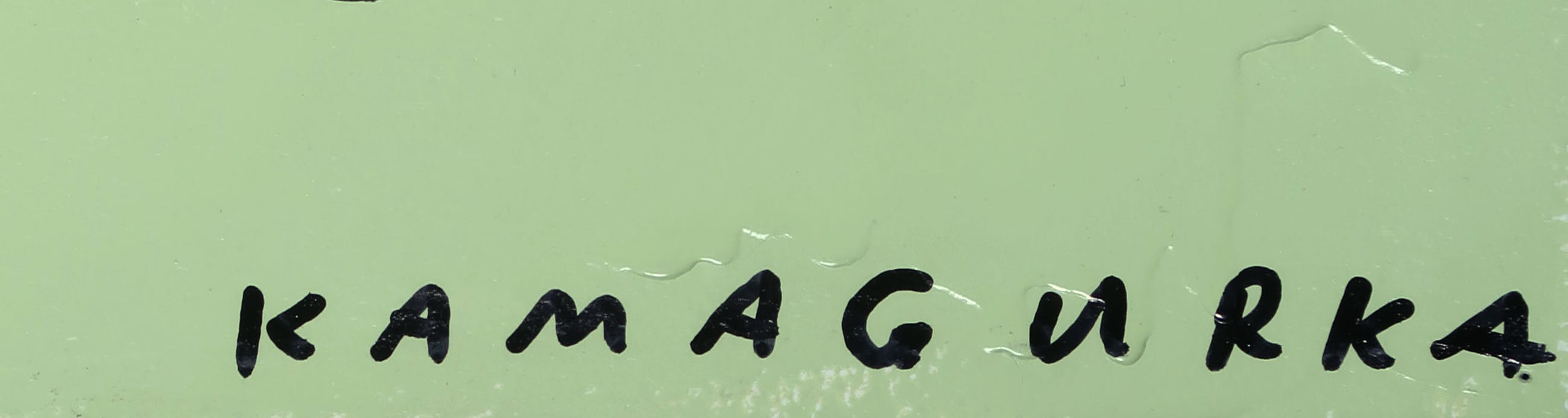 | De hoekjes zijn licht beschadigd. In het beeld tussen de benen van het grote figuur is sprake van een klein stukje verfverlies. Dit is over het geheel niet storend. De achterzijde is wat smoezelig en heeft een vlek. Iedere hoek heeft een punaisegaatje. | |||