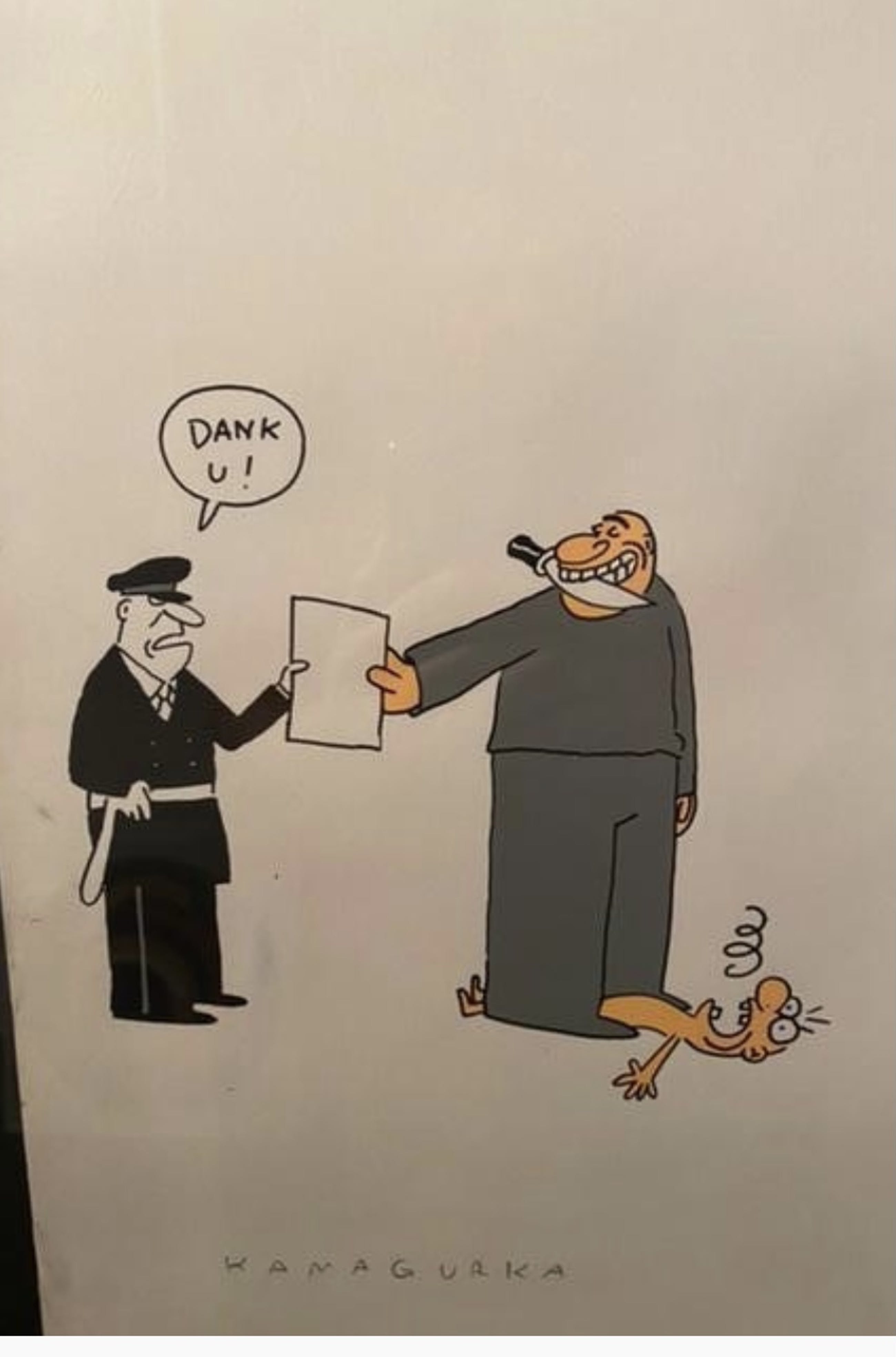 Leuke zeefdruk van de kunstenaar Kamagurka. Het werk stelt een cartoon voor genaamd “Cranes Crest”. De zeefdruk is linksonder met de hand gesigneerd en rechtsonder gedateerd en genummerd op 200 exemplaren.