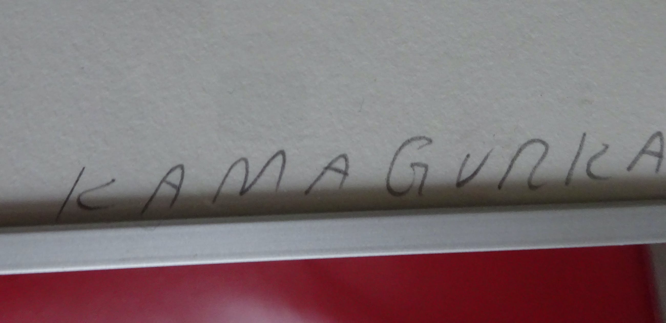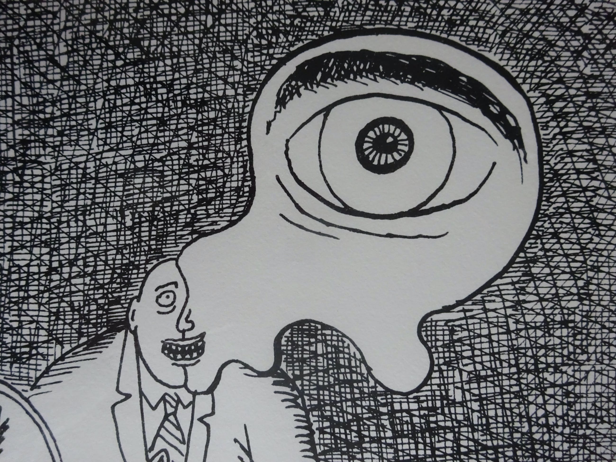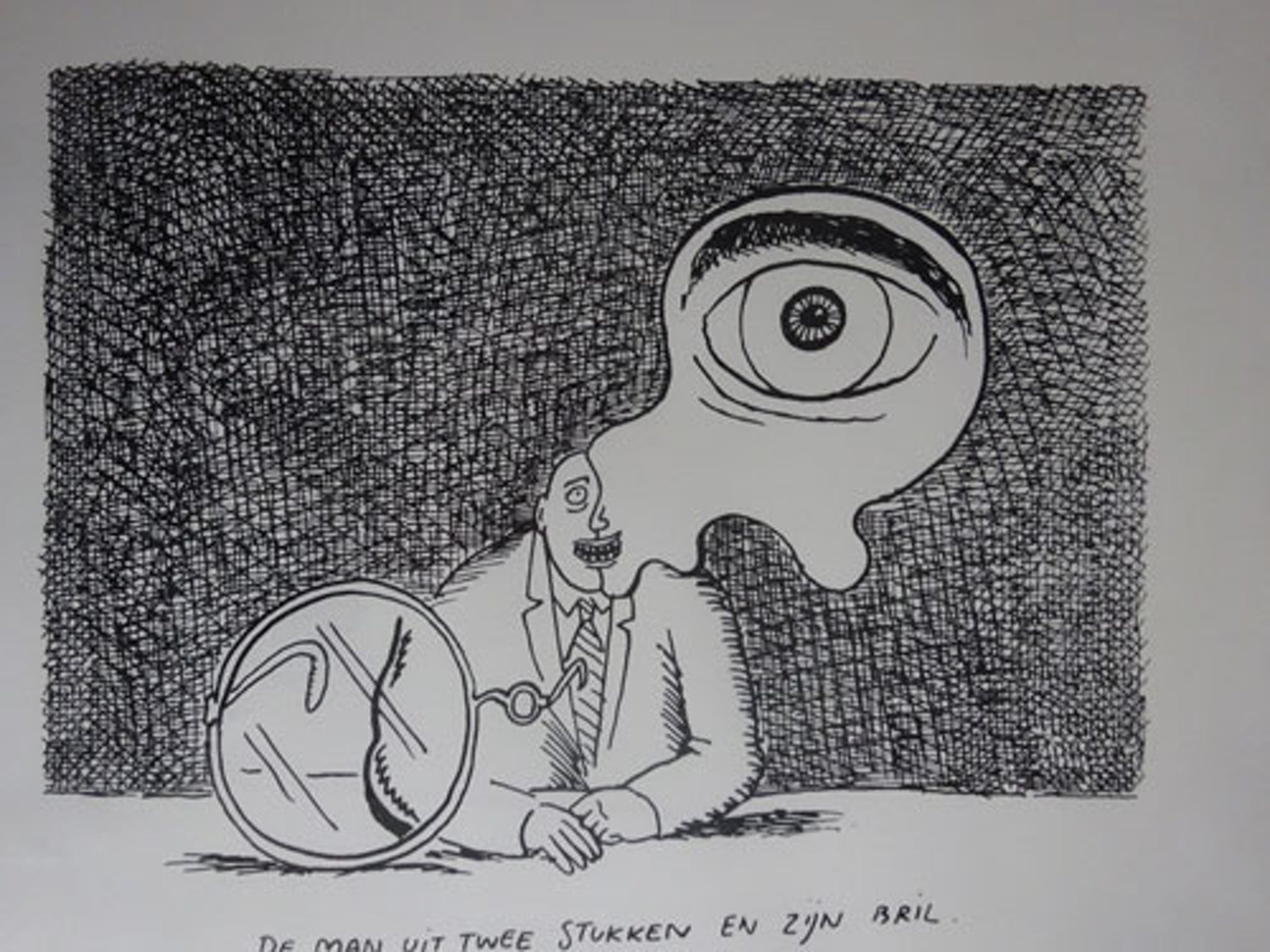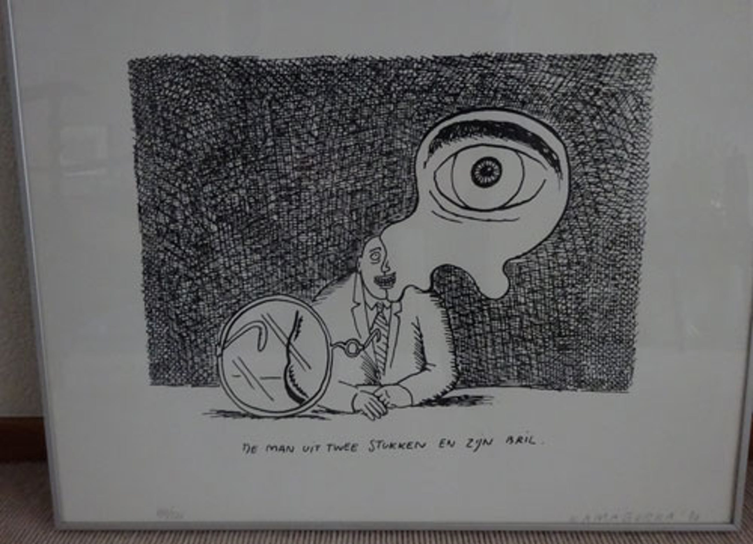 De man uit twee stukken en zijn bril Beeldend kunstenaar: Kamagurka 1956 Afmeting: 50 x 40 cm Techniek: zeefdruk Oplage: 184/200 Signatuur: gesigneerd met potlood ro Jaar: 1990 Conditie: goede staat- Barth lijst.