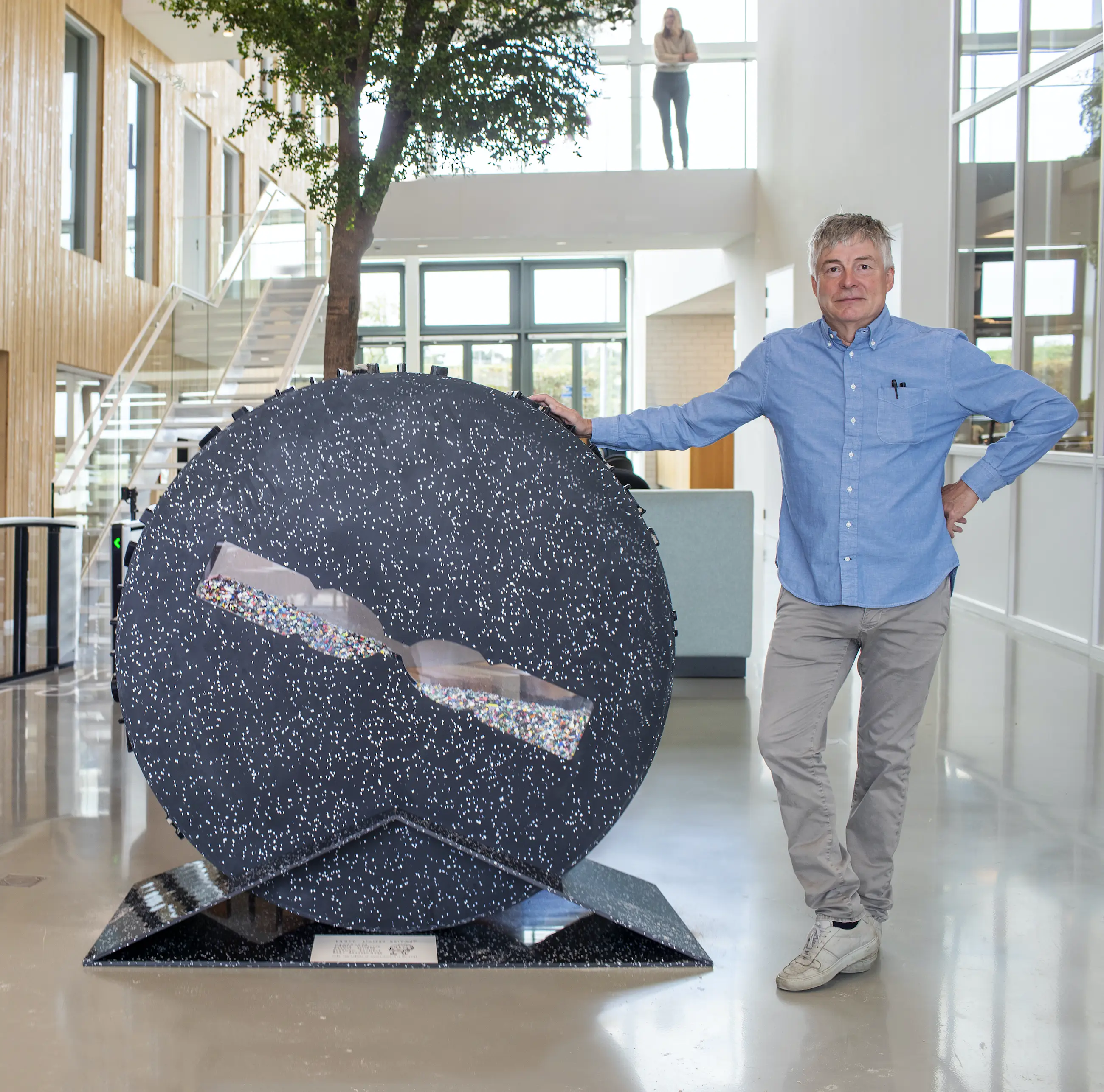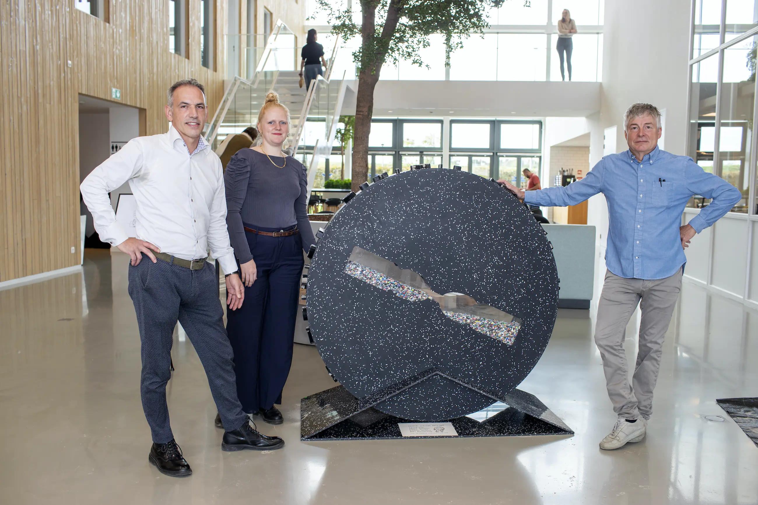 Het kunstwerk is een wiel met daarin een zandloper van flessen: een verwijzing naar ‘time is running'. De zandloper is gevuld met gerecycleerde plastic korrels die bij het vallen het geluid van de zee nabootsen. Het is ook een levensgrote stempel waarmee de tekst ‘earth limited edition’ kan worden afgedrukt op het zand. Net zoals onze grote voetafdruk is deze afdruk een bewustwording dat we maar 1 planeet hebben waar we zorg voor moeten dragen. Het wiel refereert daarnaast ook naar de 1e uitvinding van de mens. En hiermee gaan we terug naar het begin, een mogelijkheid om opnieuw te beginnen. Bekijk ook het filmpje: https://www.youtube.com/watch?v=ynlXhDrv8zU&t=11s µ