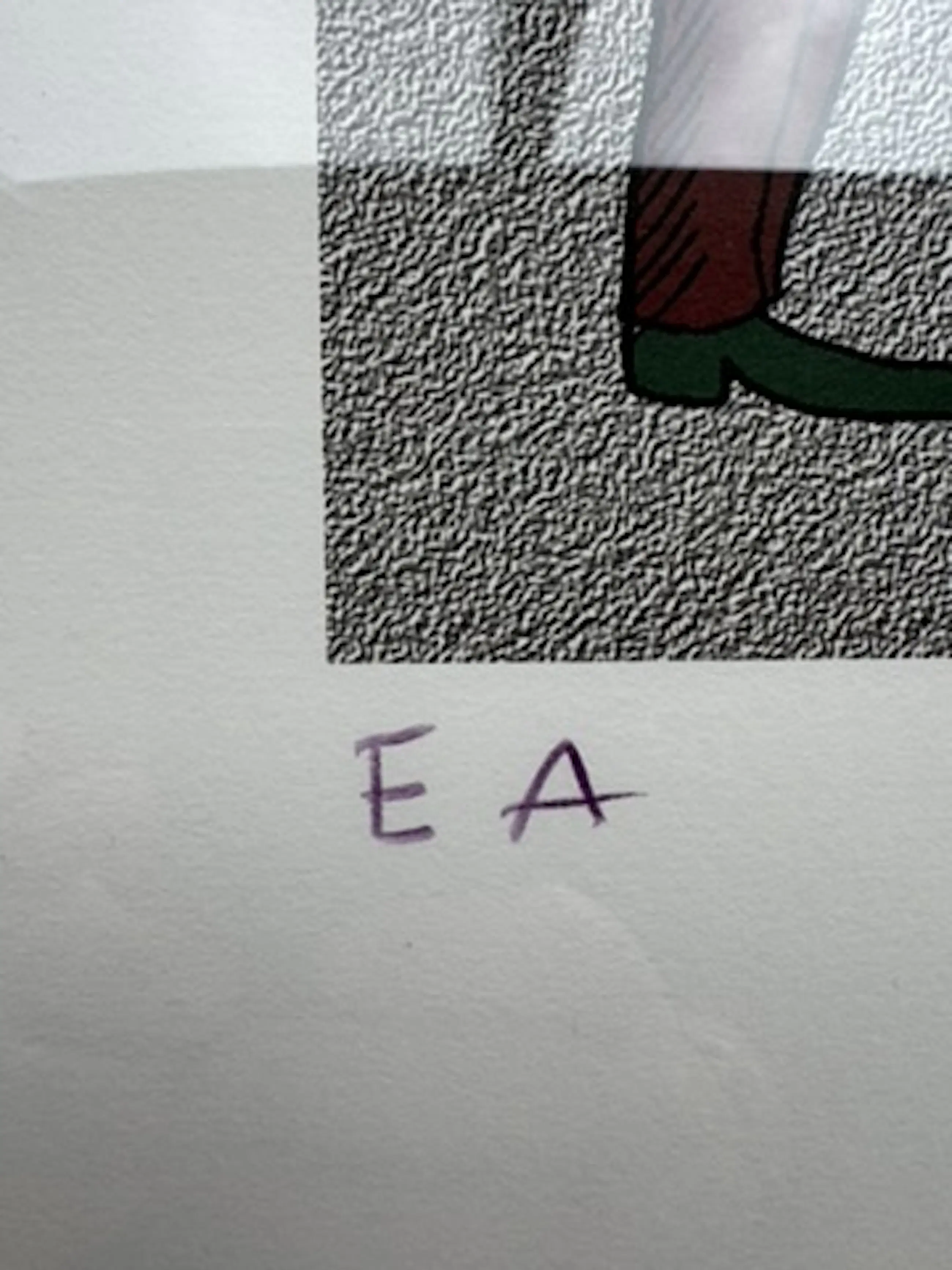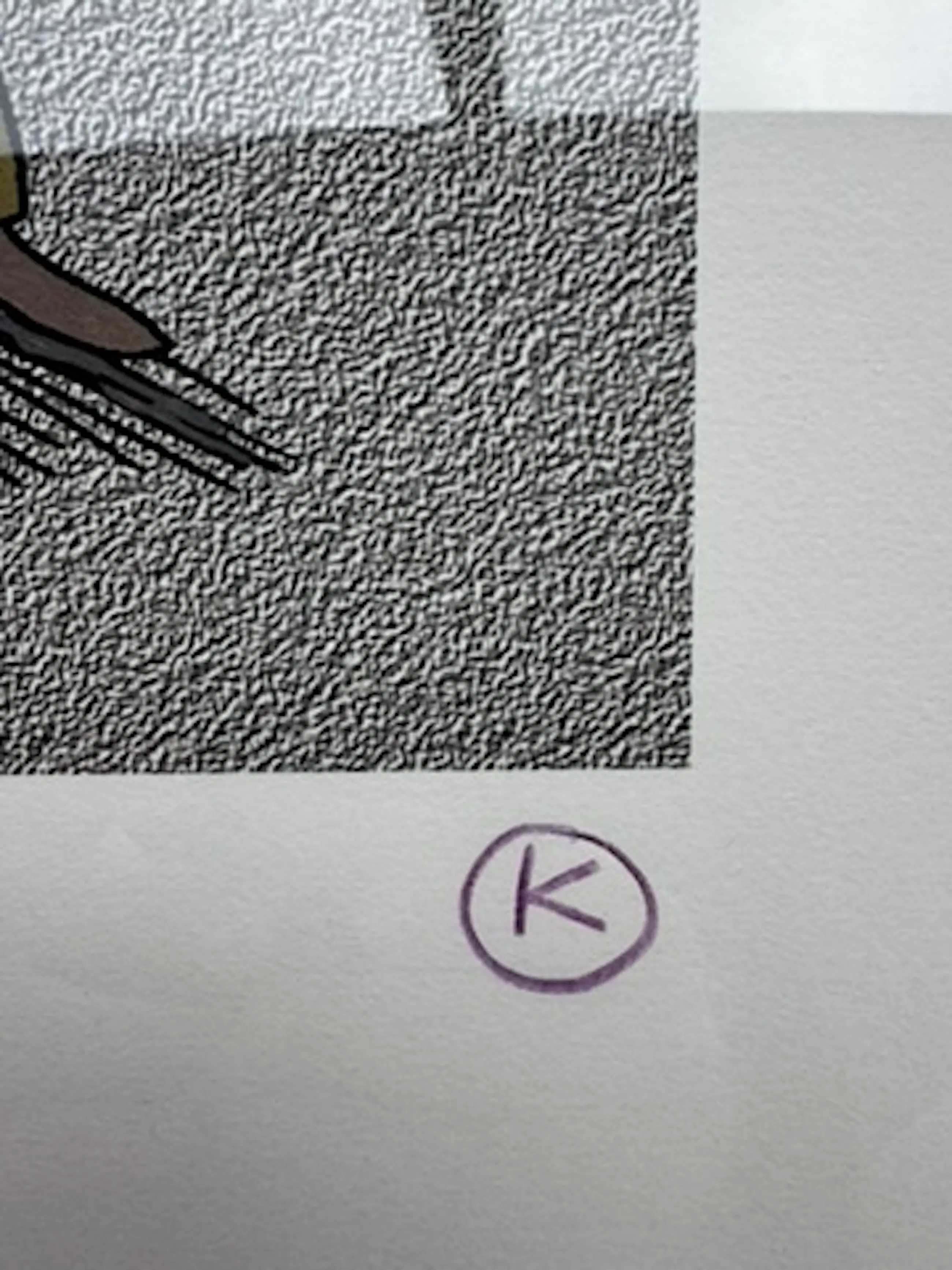 Aangeboden: een gesigneerde prent van Kamagurka (Luc Zeebroek, 1956), uitgevoerd in kleur en voorzien van aanduiding EA (Épreuve d’Artiste) en gesigneerd met het kenmerkende omcirkelde “K”.