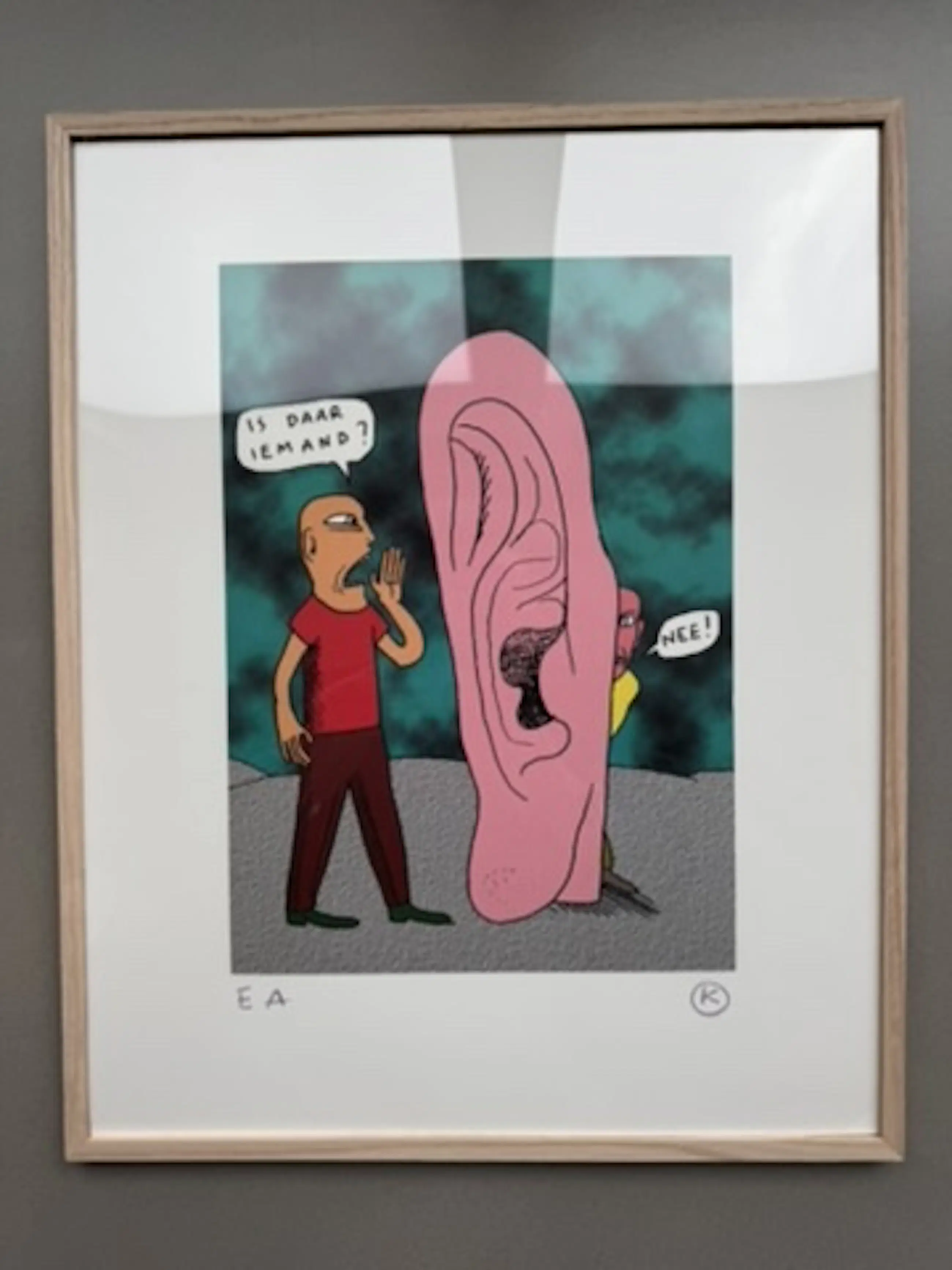 Het werk toont een typische absurdistische scène: een figuur die roept “Is daar iemand?” in een gigantisch oor, terwijl aan de andere zijde droog wordt geantwoord: “Nee!”. De humor is direct, vervreemdend en filosofisch tegelijk – een subtiel spel met communicatie, eenzaamheid en absurditeit.
