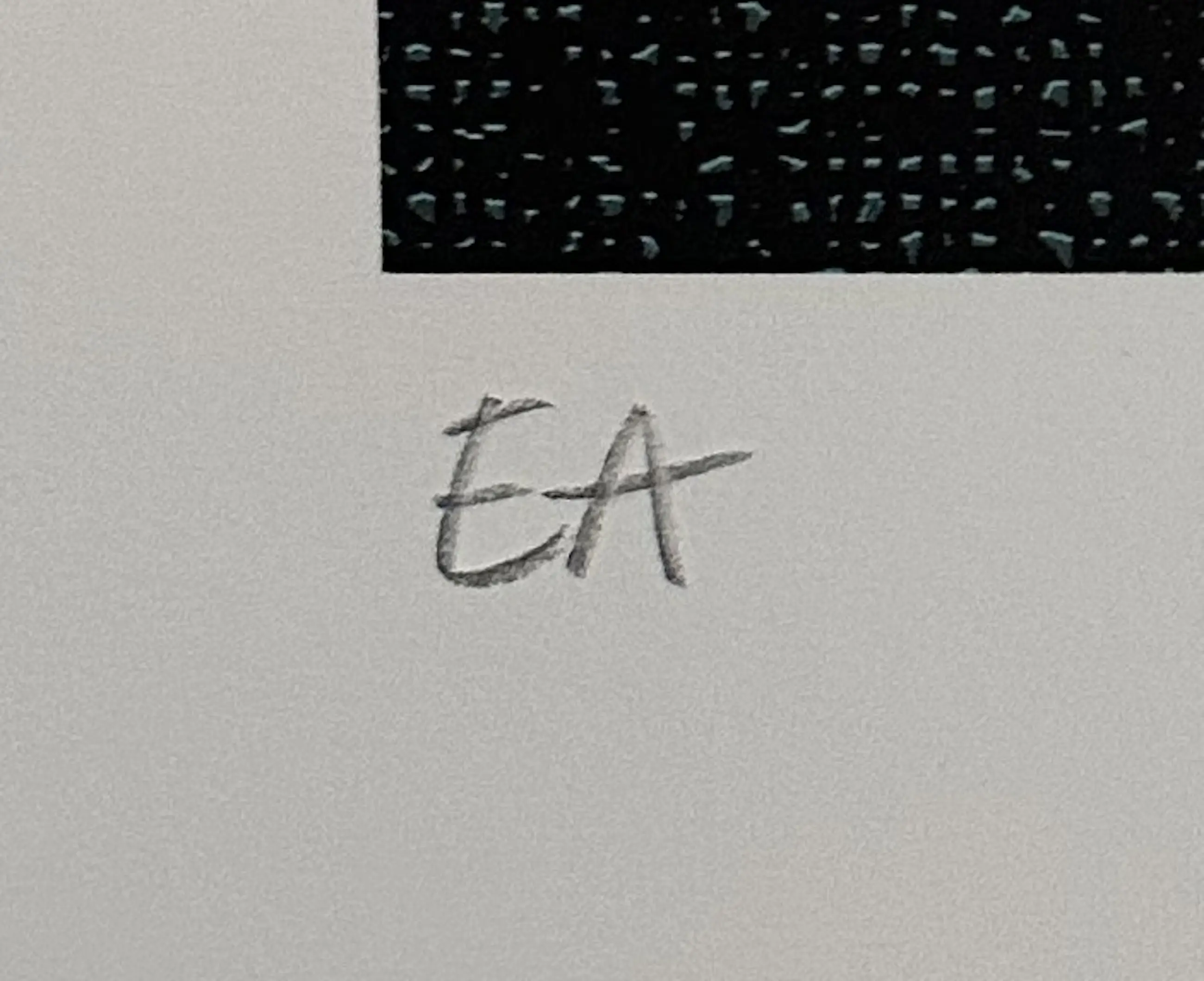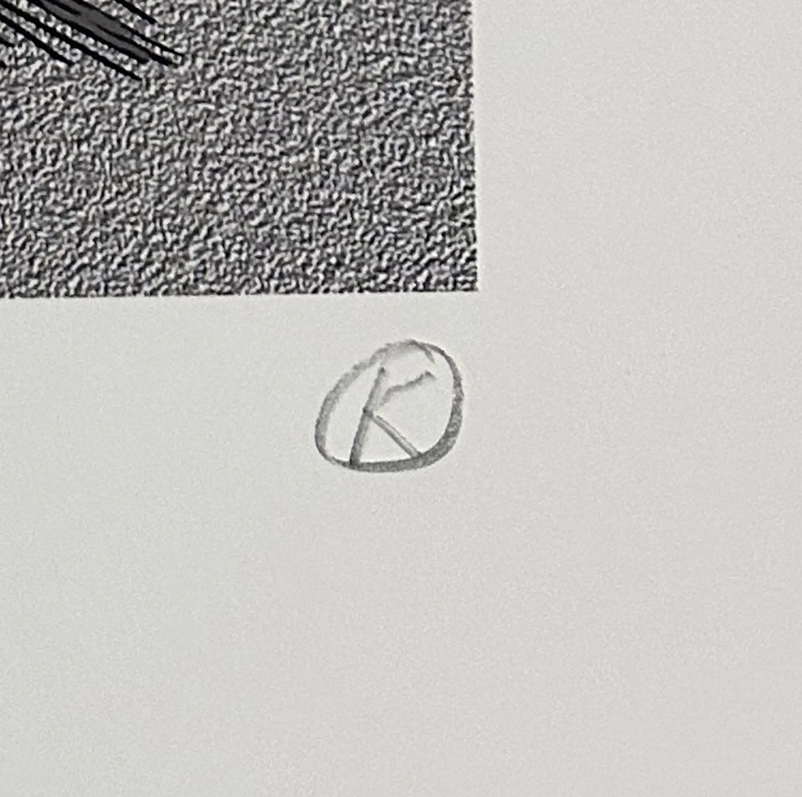 Zeefdruk van Kamagurka met man met groot mondoor en een oog, absurdistisch. Een exemplaar uit de EA zeefdrukken oplage van Kamagurka zelf.