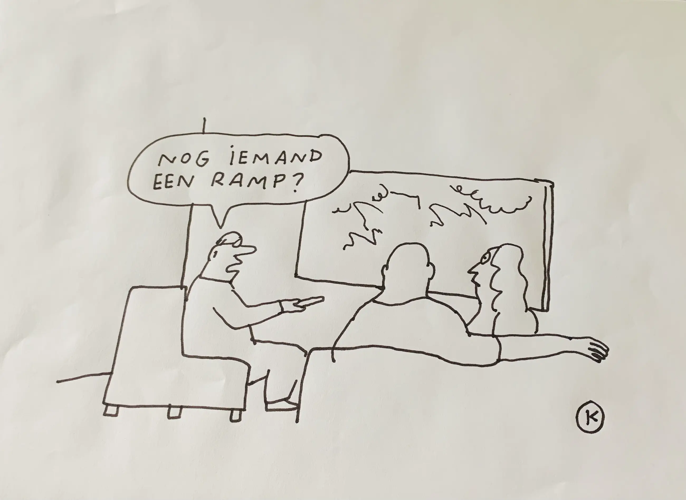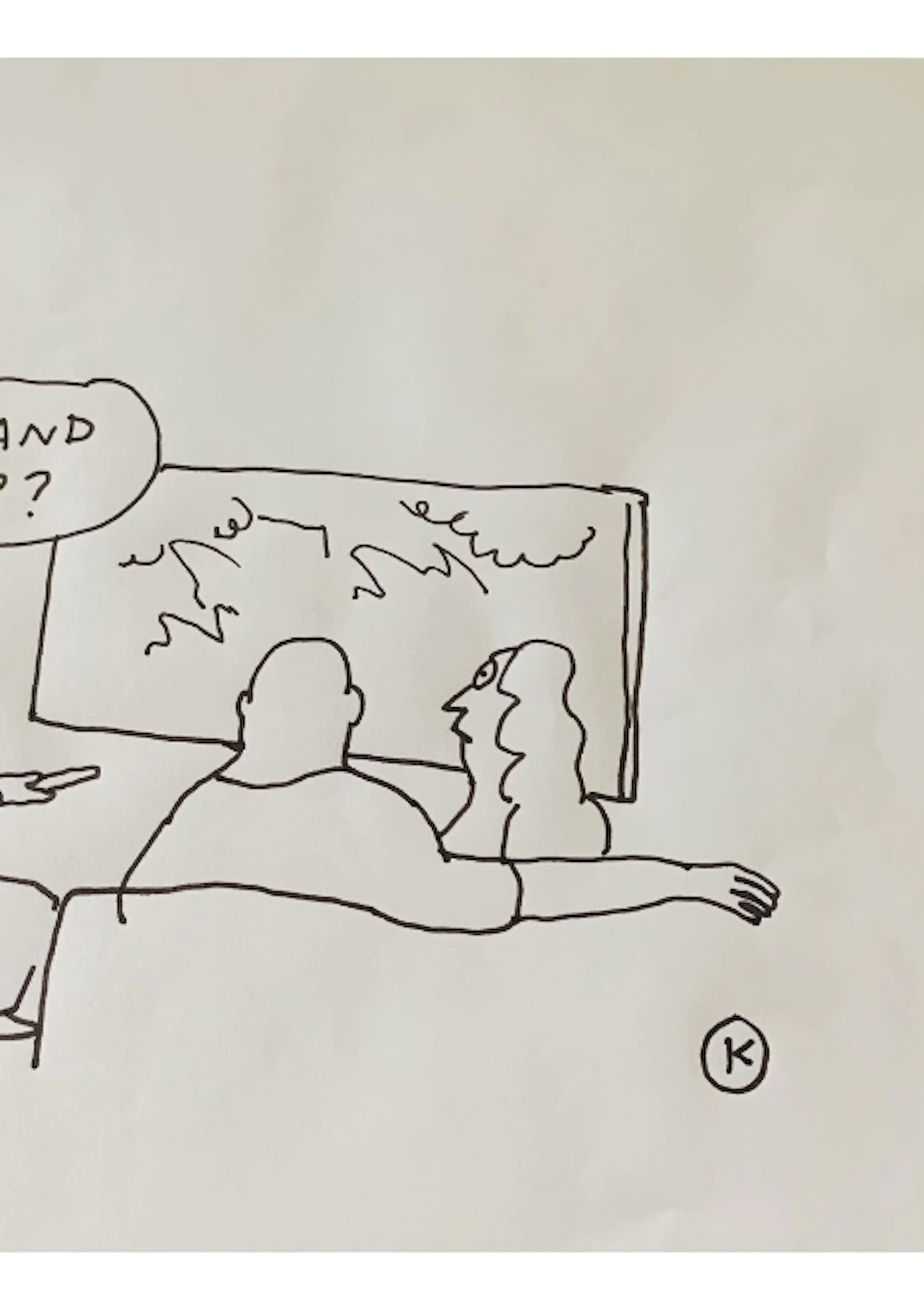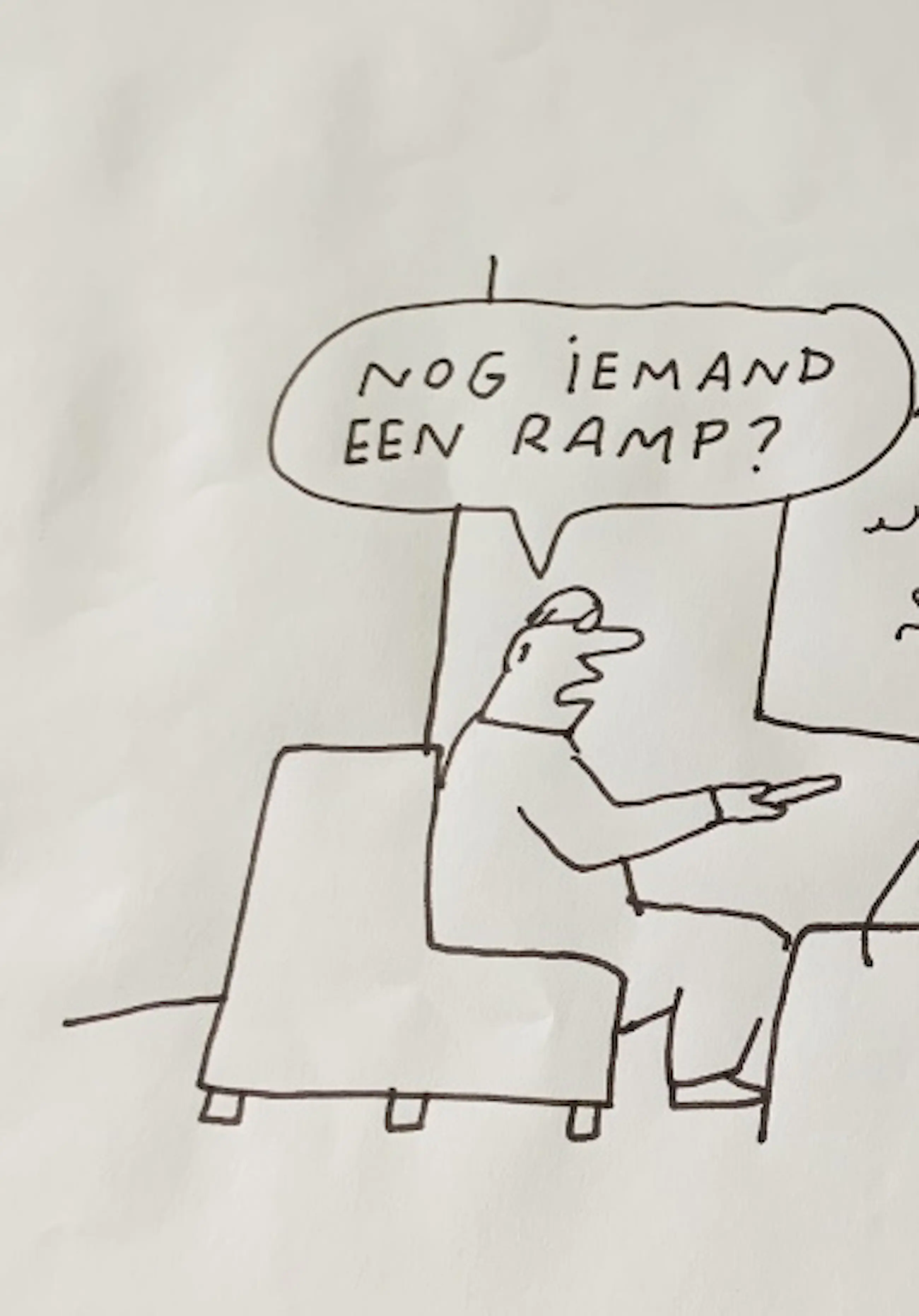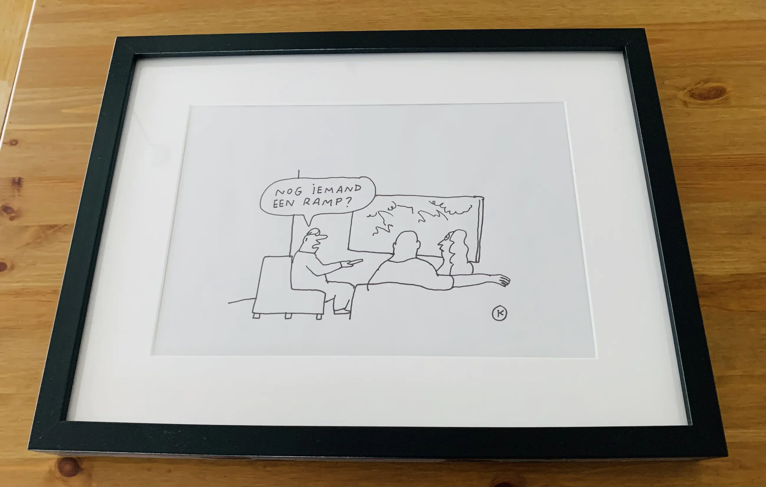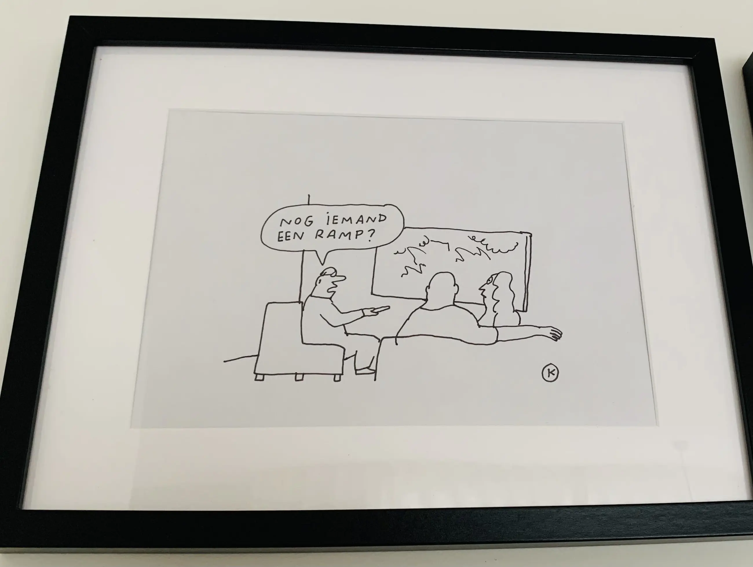 Mooie cartoon van Kamagurka In zwarte inkt Op glad manga papier Ingelijst in zwarte kader met paspartout Zeer goede staat!! Handgesigneerd onderaan de tekening
