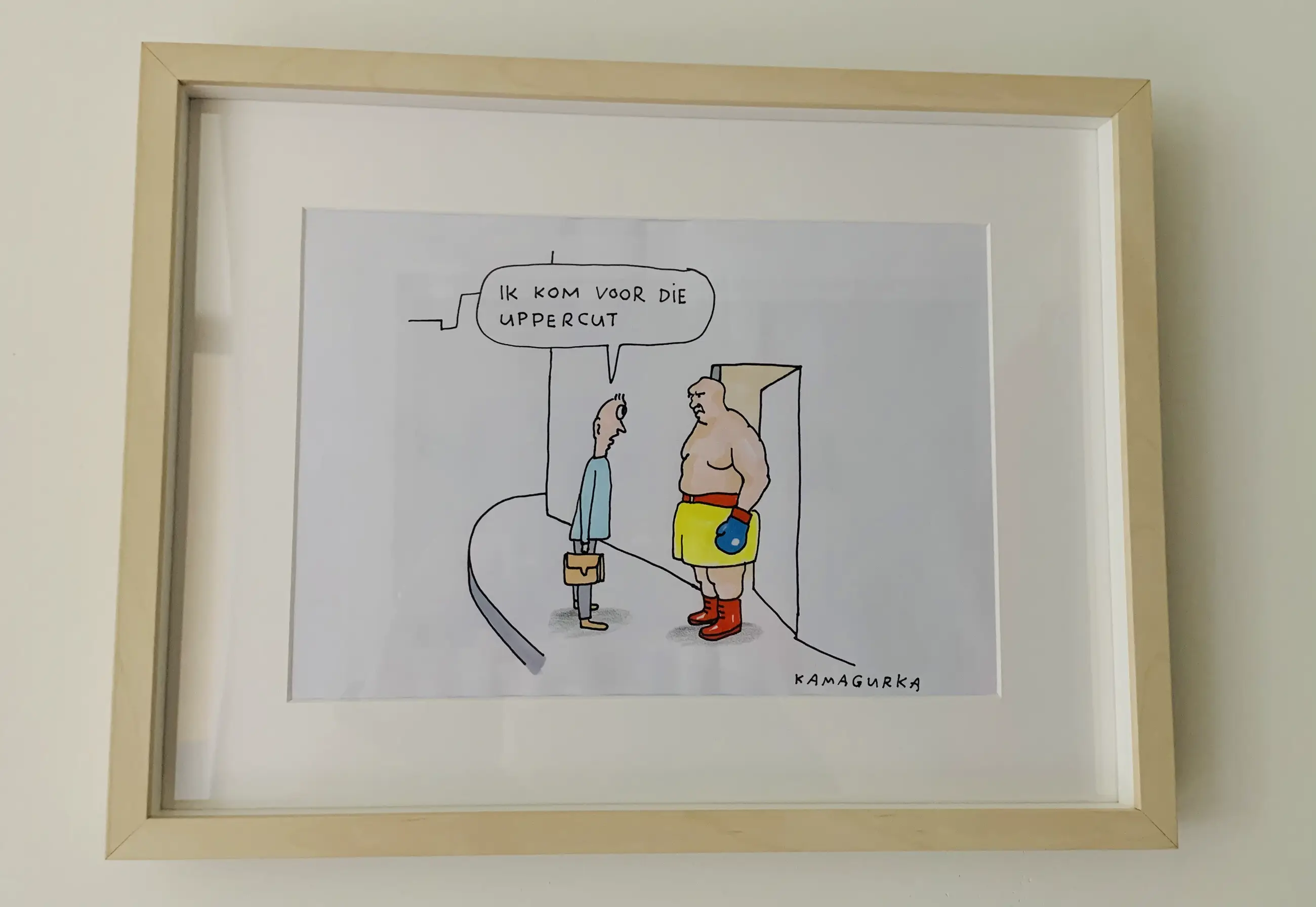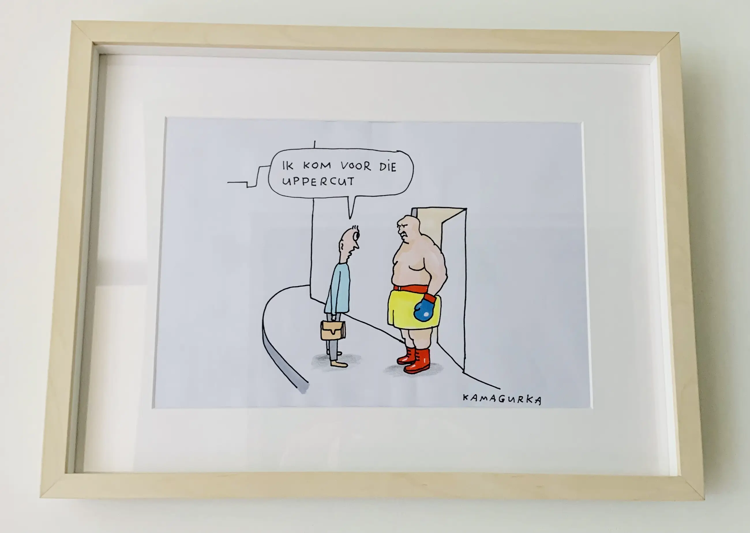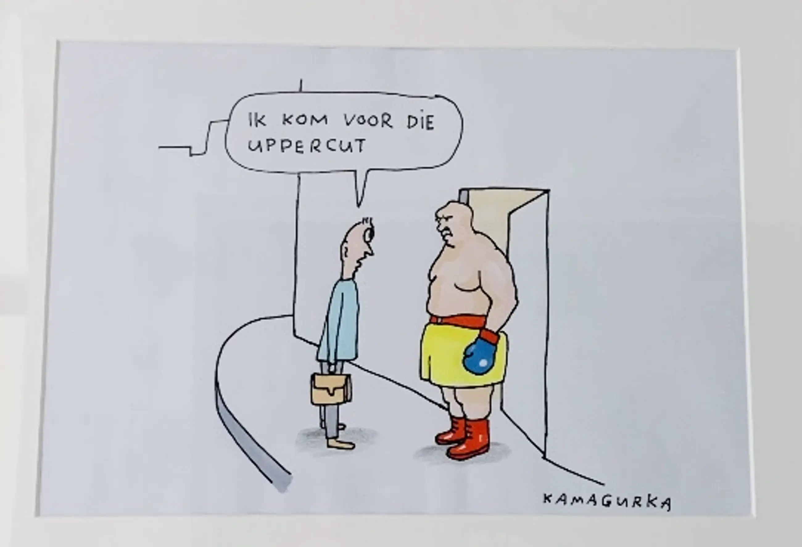 Prachtige tekening van Kamagurka Ingeframed in kader met paspartout Op manga papier In inkt, potlood en kleurstiften Onderaan tekening gesigneerd door Kamagurka Nieuwstaat!!!
