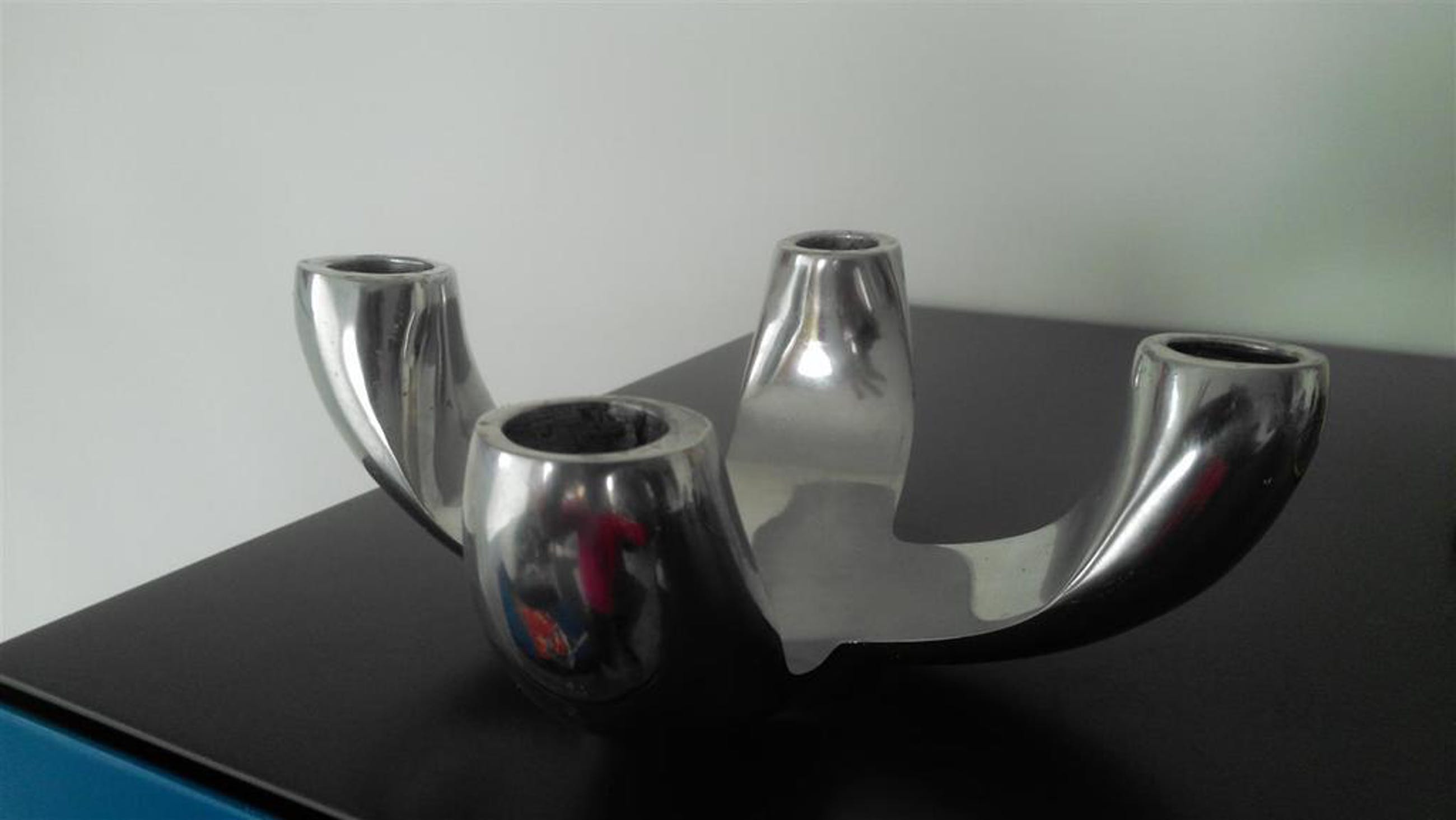 Vierarmige kandelaar zonder kaarzen al een designobject van gepolijst aluminium