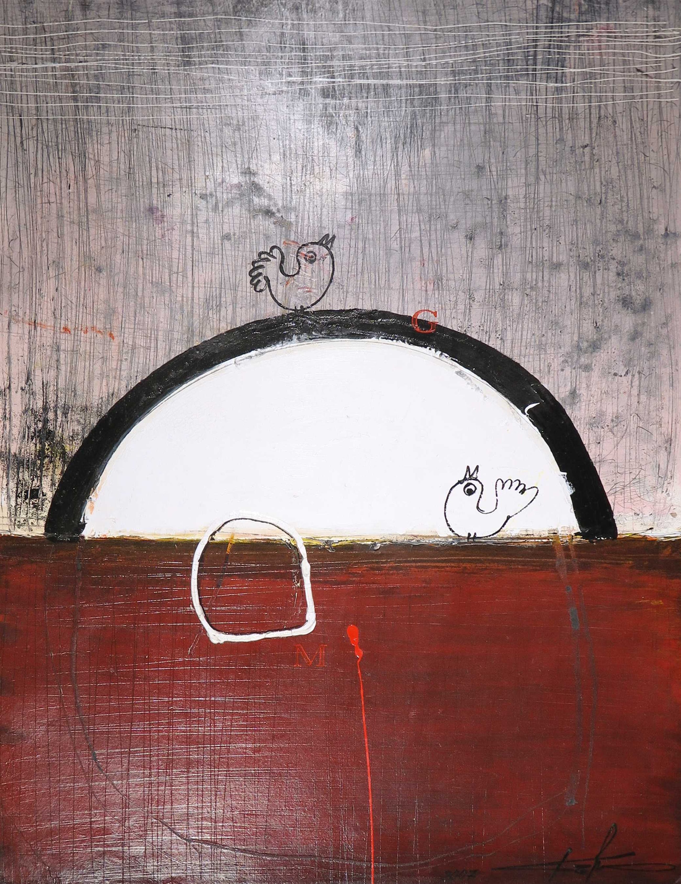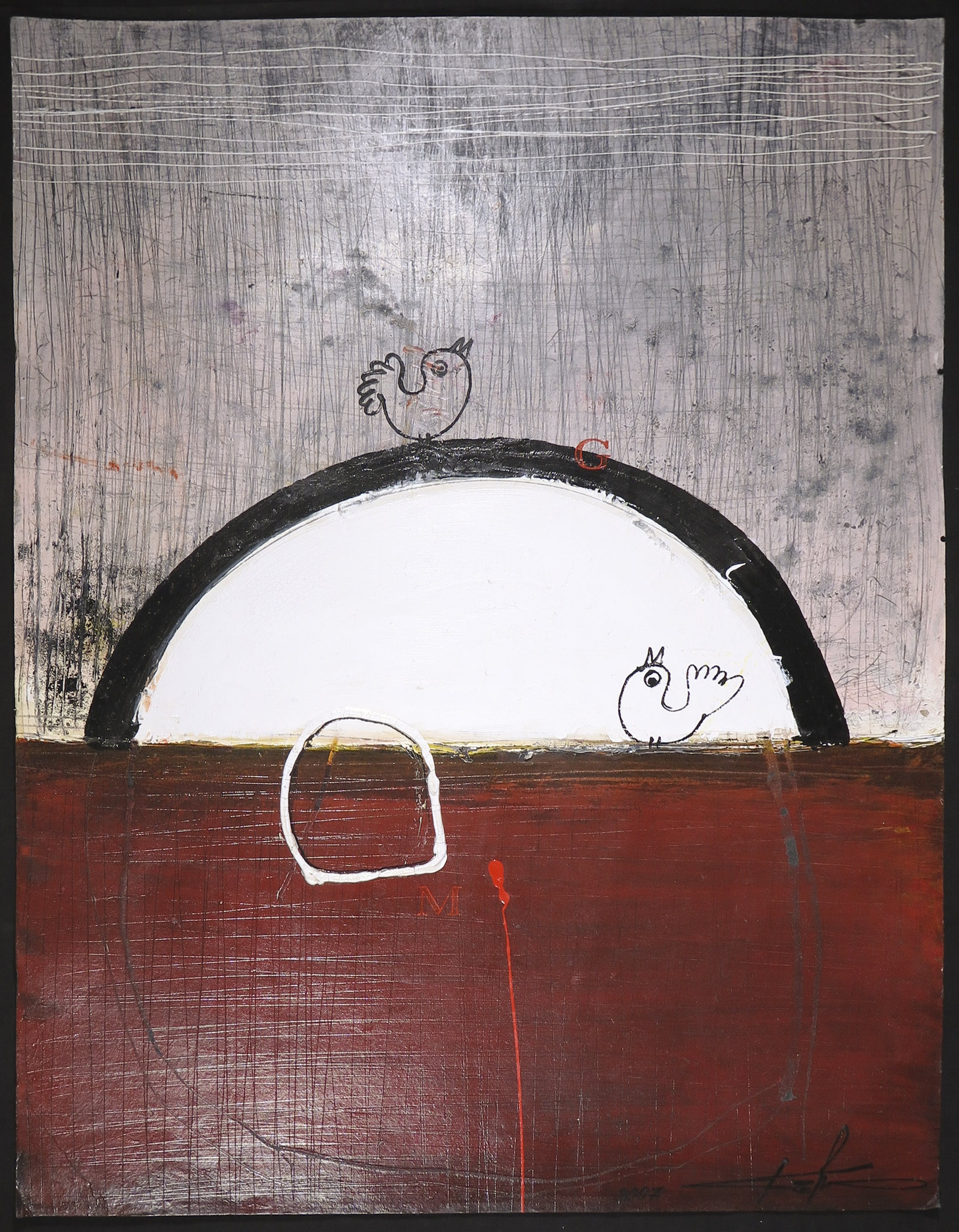 | Wat lichte beschadigingen in het beeld en langs de randen en hoekjes. Vouw in de hoek linksonder. Wat lichte craquelé in middenpartij (witte deel) | |