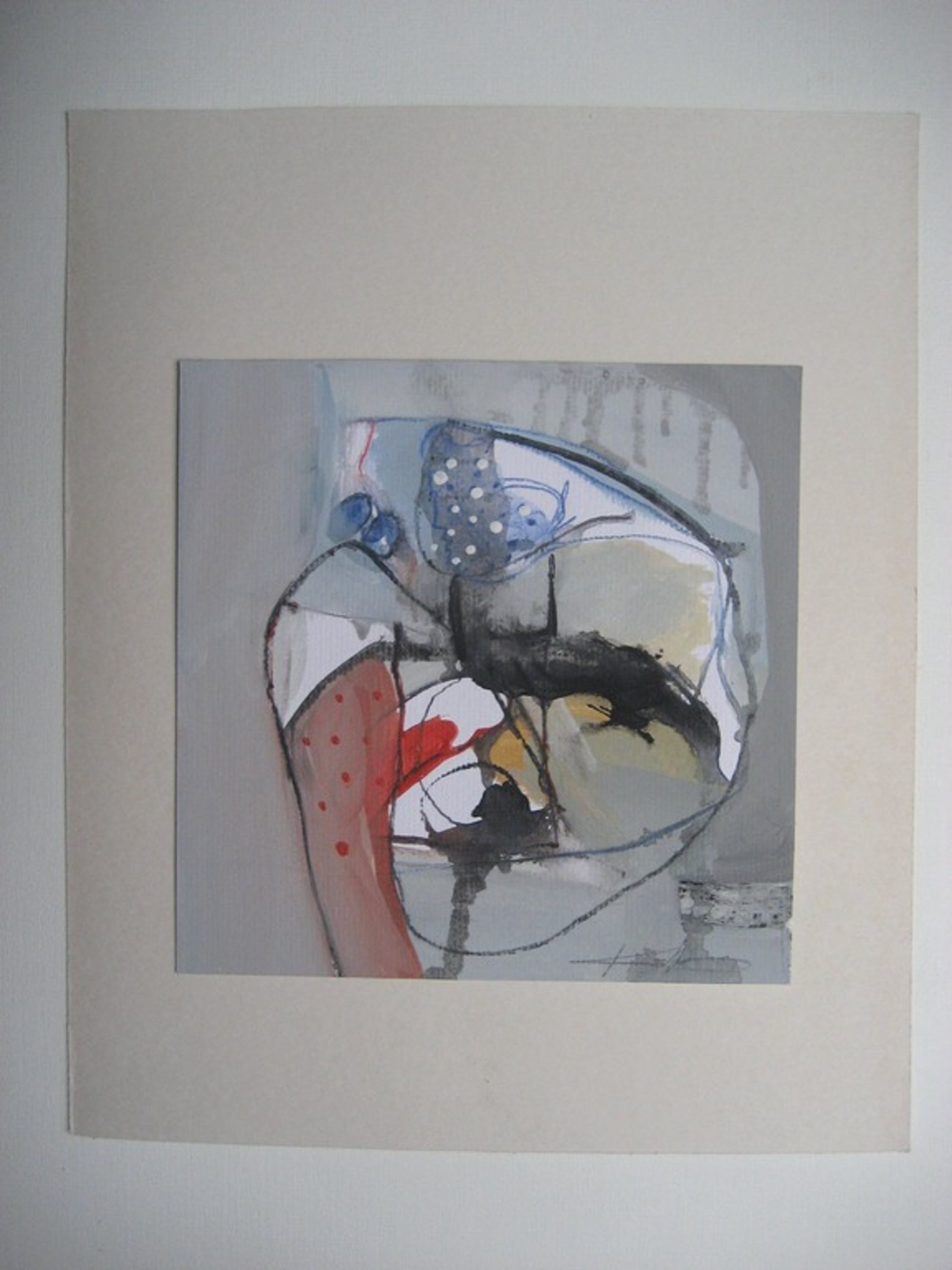 Kancho Kanev geboren 1957 in Bulgarije.Woont en werkt in Den Haag.Bijna cobra-achtig werkje in gemengde techniek/gouache en krijt(?),op papier gemonteerd op licht karton. De maten zijn 20-20 cm(blad met de afbeelding) en 35-25 cm( karton)..Rechts onder gesigneerd.In zeer goede conditie.