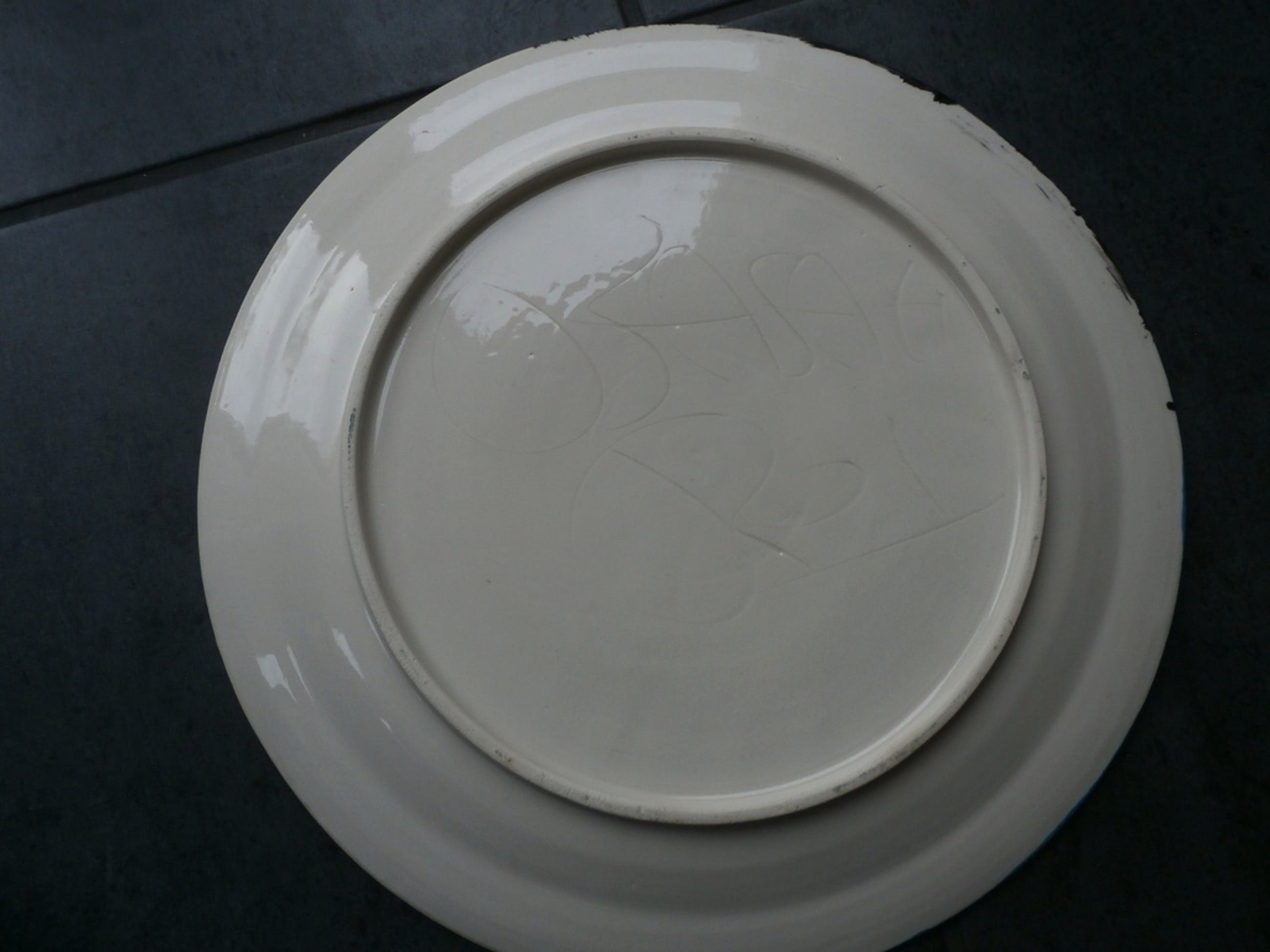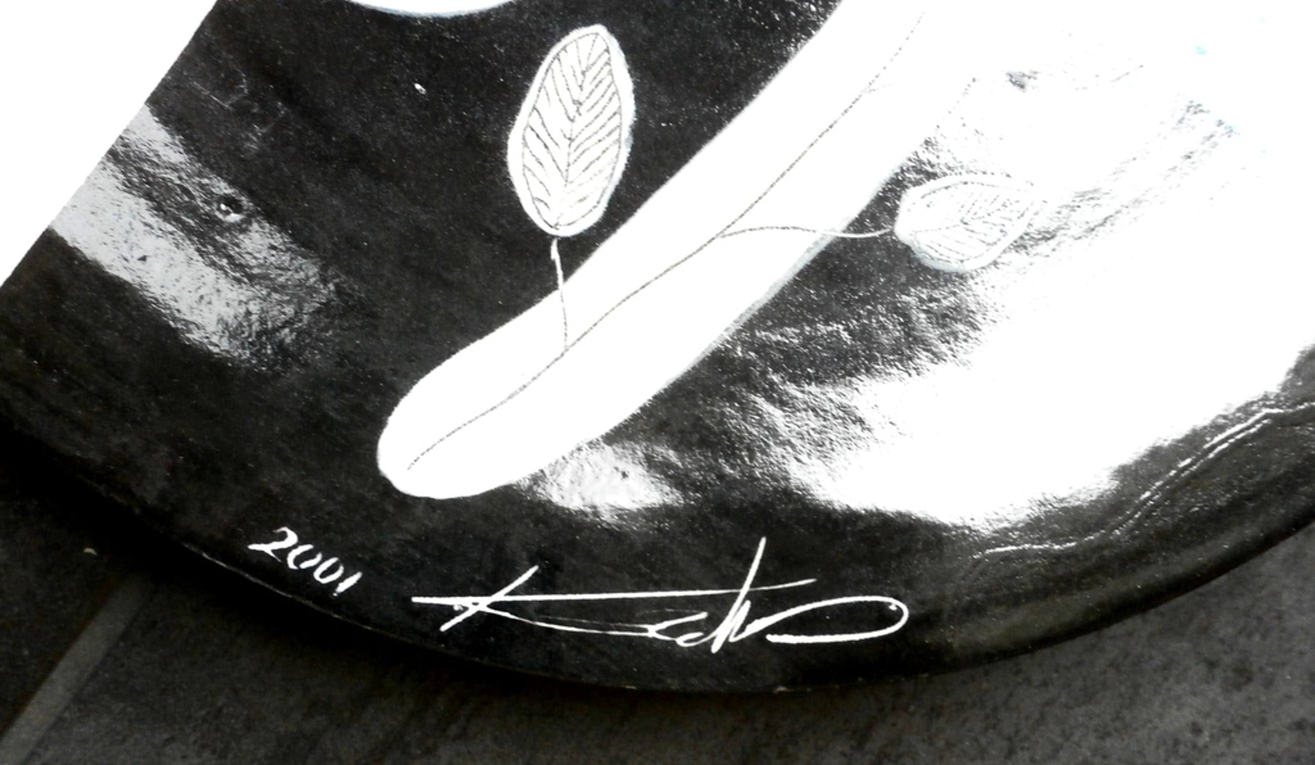 Keramiek bord van Kantcho Kanev uit 2001. Diameter: 32 cm. Gesigneerd op de voorzijde in het zwarte gedeelte en op de achterzijde in het witte middengedeelte van het bord.