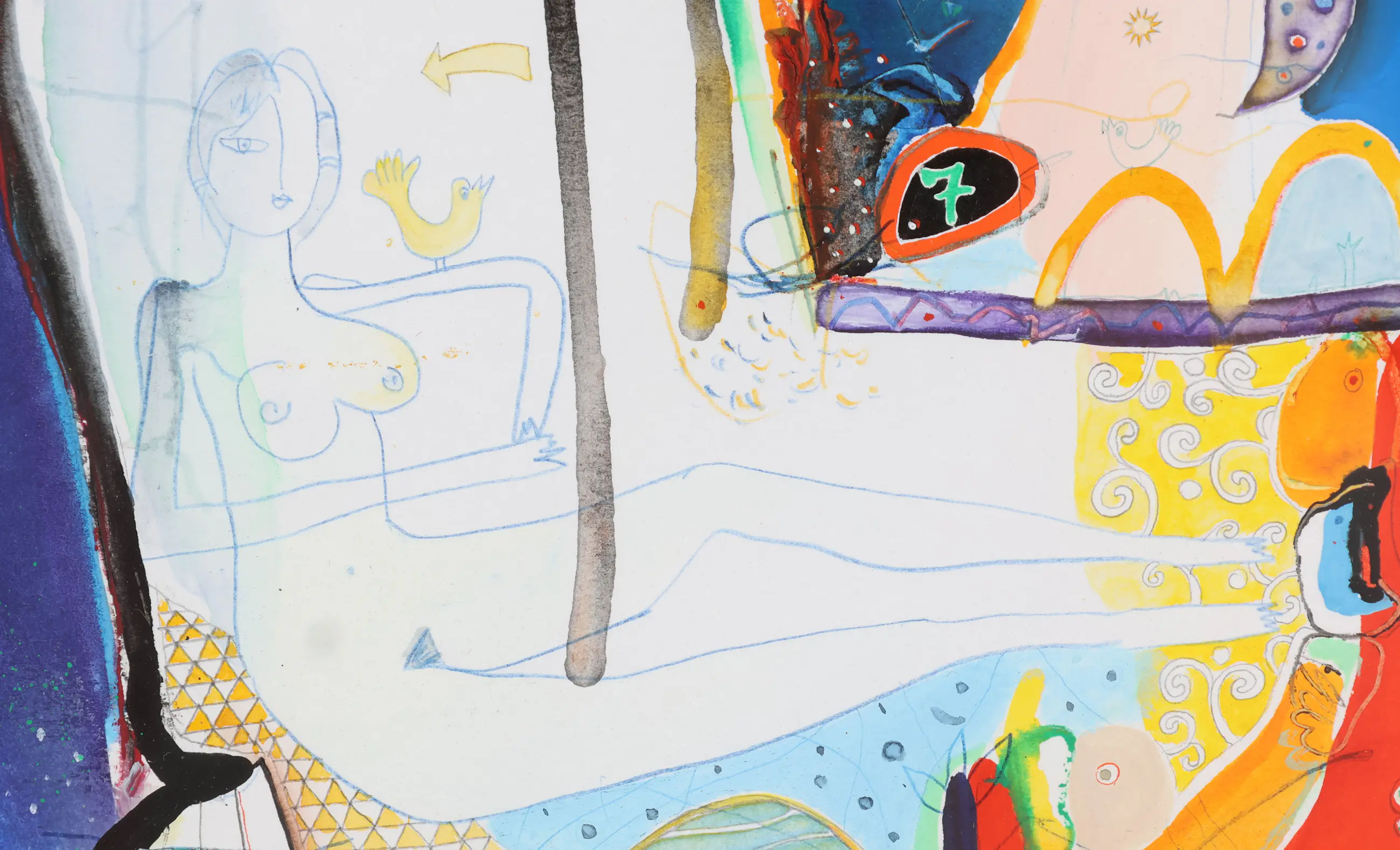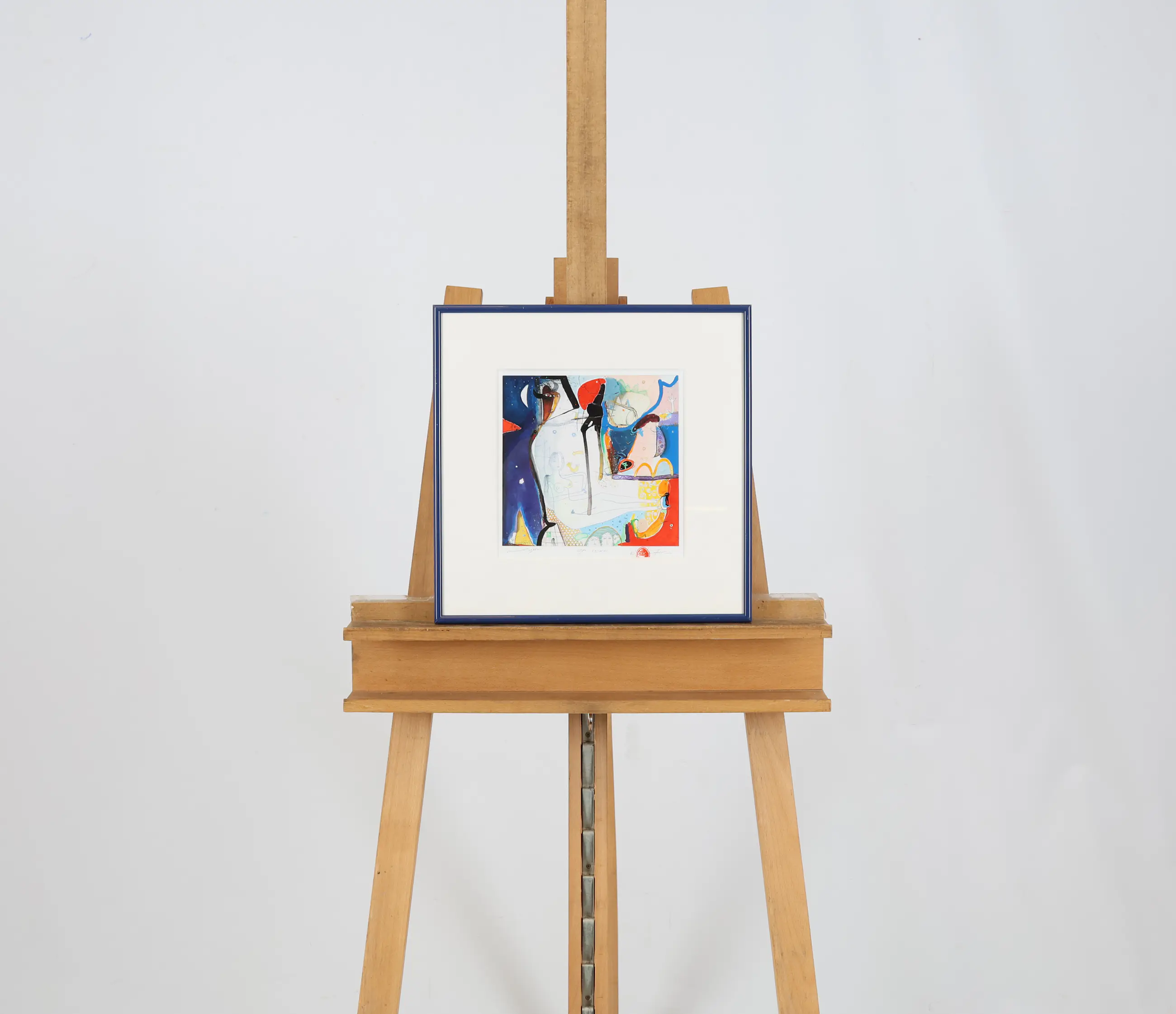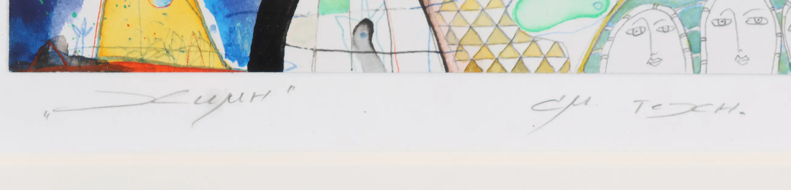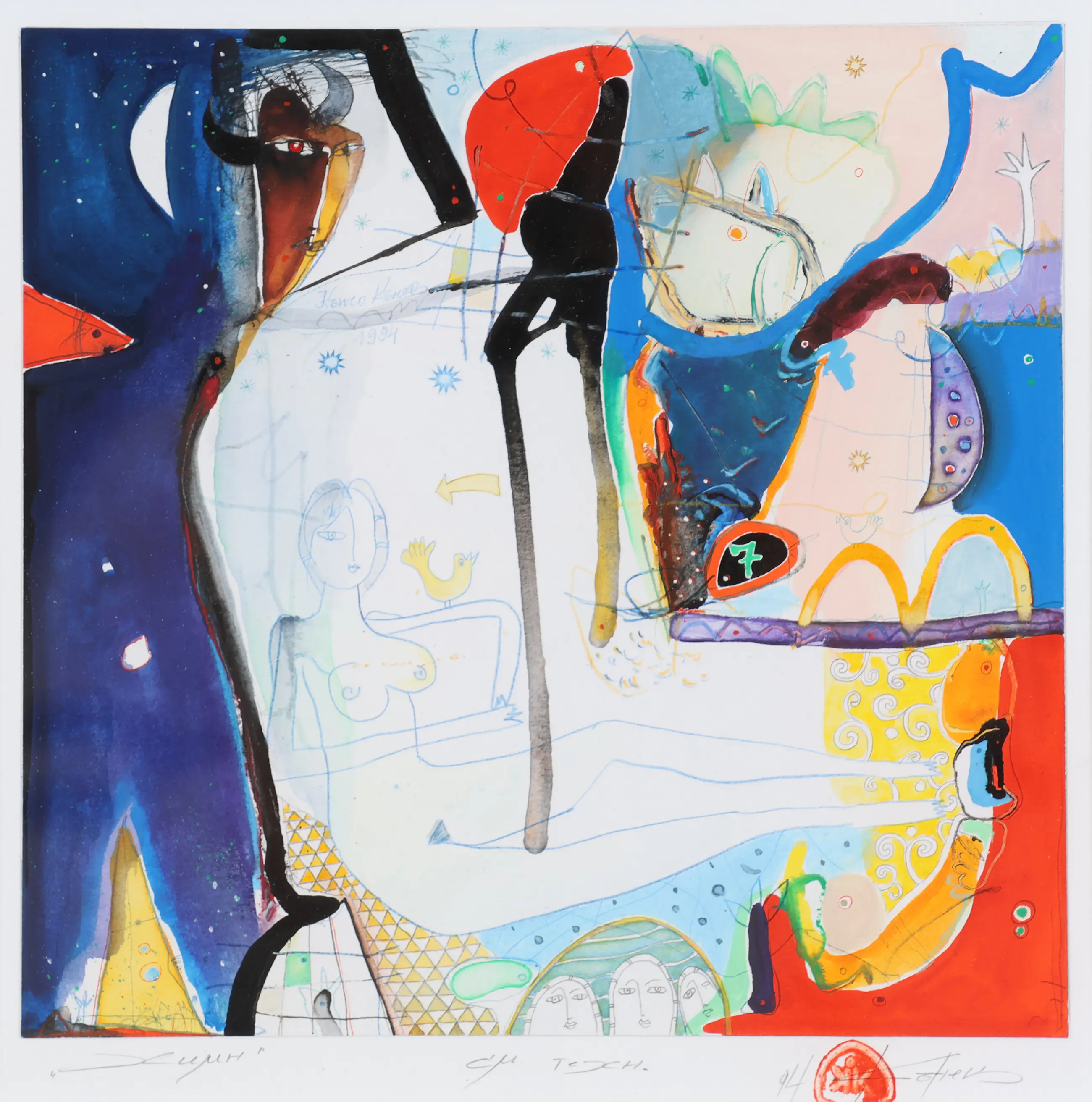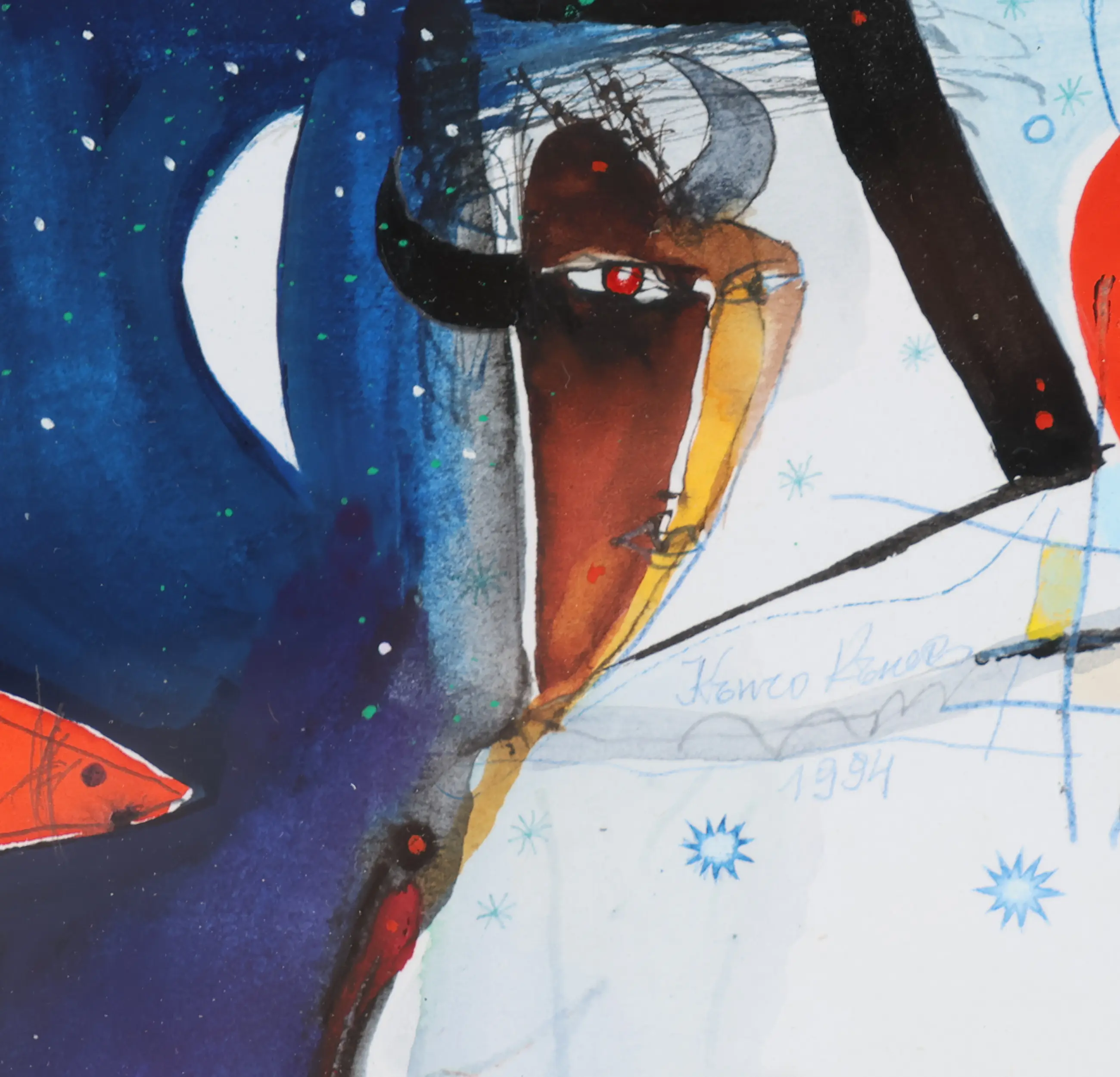 In dit werk is van alles te ontdekken: een vrouwfiguur in het midden, omgeven door geometrische vormen die de kijker op verschillende manieren kan interpreteren. Het is een typisch werk van Kantcho Kanev (1957, Obretenik, Bulgarije), bekend om zijn expressieve en kleurrijke schilderstijl.