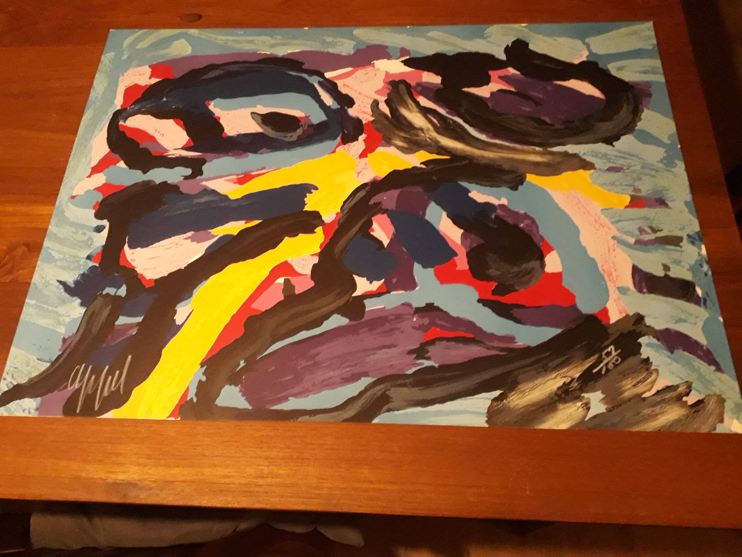 Fraaie in werkelijke nieuwstaat verkeerde zeefdruk van Appel:3 faces into clouds Oplage nummer 57/160 Nog nooit ingelijst geweest,uiteraard hand gesigneerd en genummerd,heeft altijd plat een een lade gelegen. Wordt aangetekend/verzekerd verzonden plat verpakt niet opgerold dus