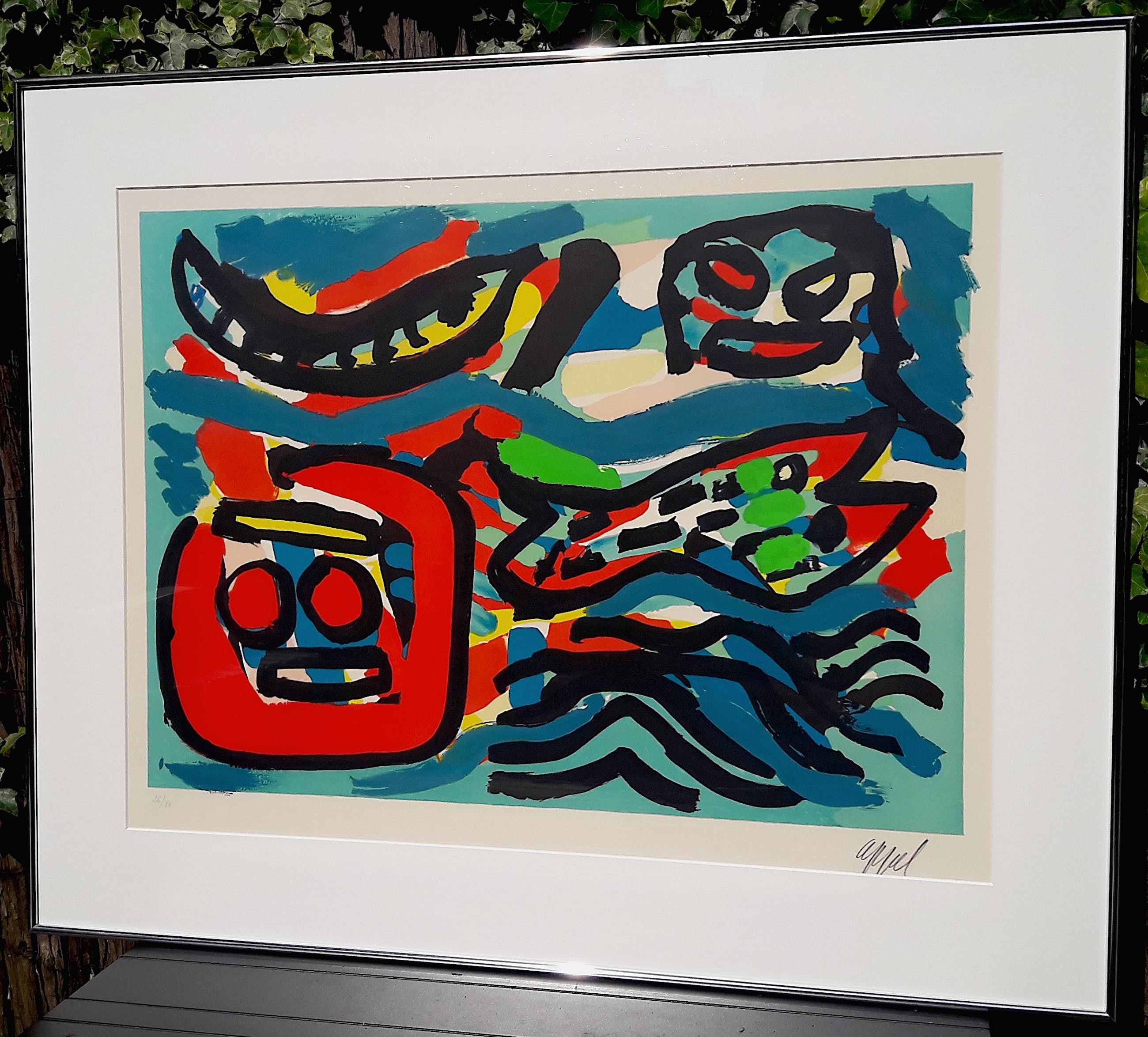 Mooi, karakteristiek werk van Karel Appel uit 1987. Litho op Arches papier, met potlood gesigneerd en genummerd (26/85). In strakke, aluminium lijst, achter glas en met smetteloos, zuurvrij passe-partout. In uitstekende conditie.