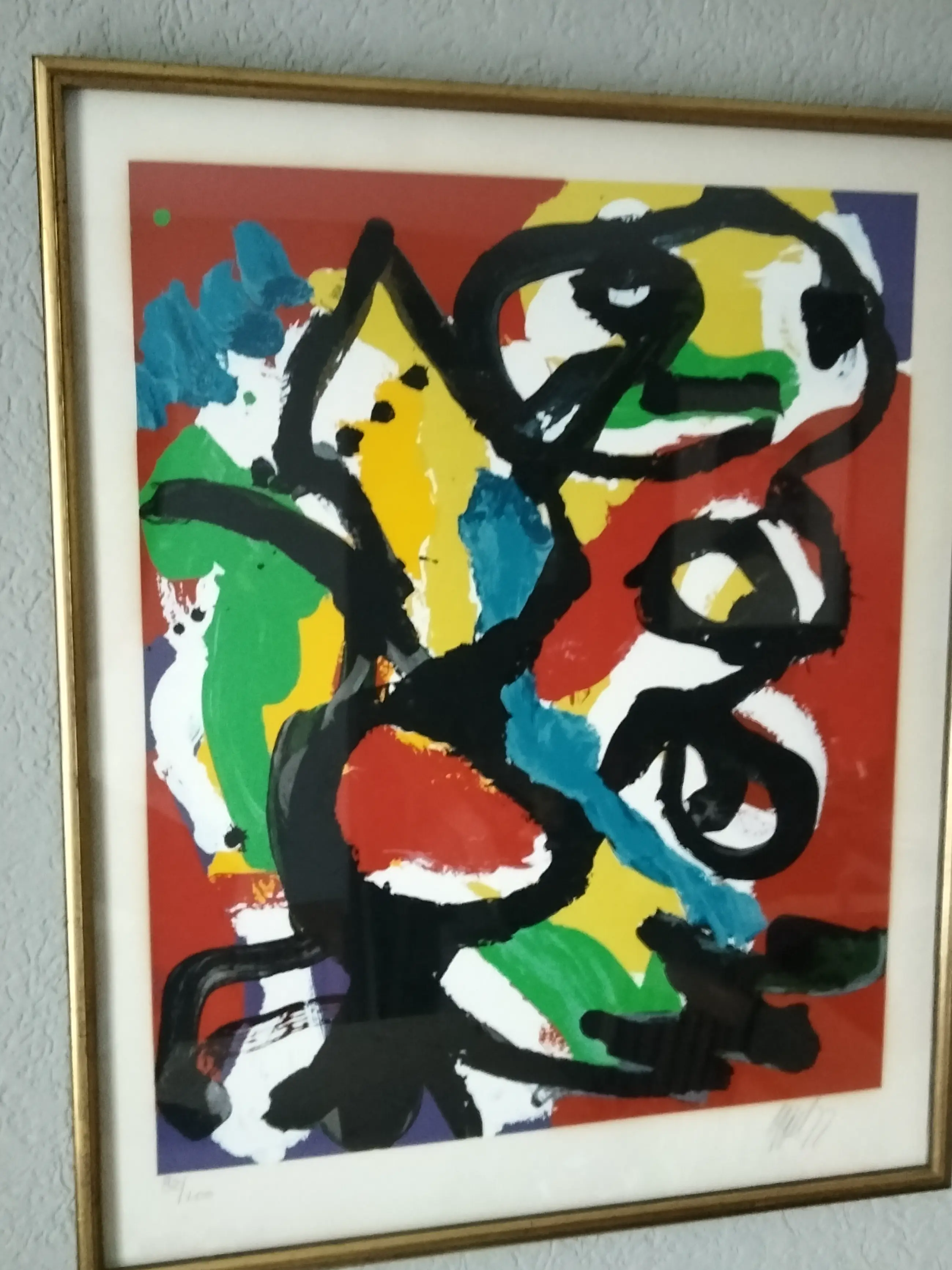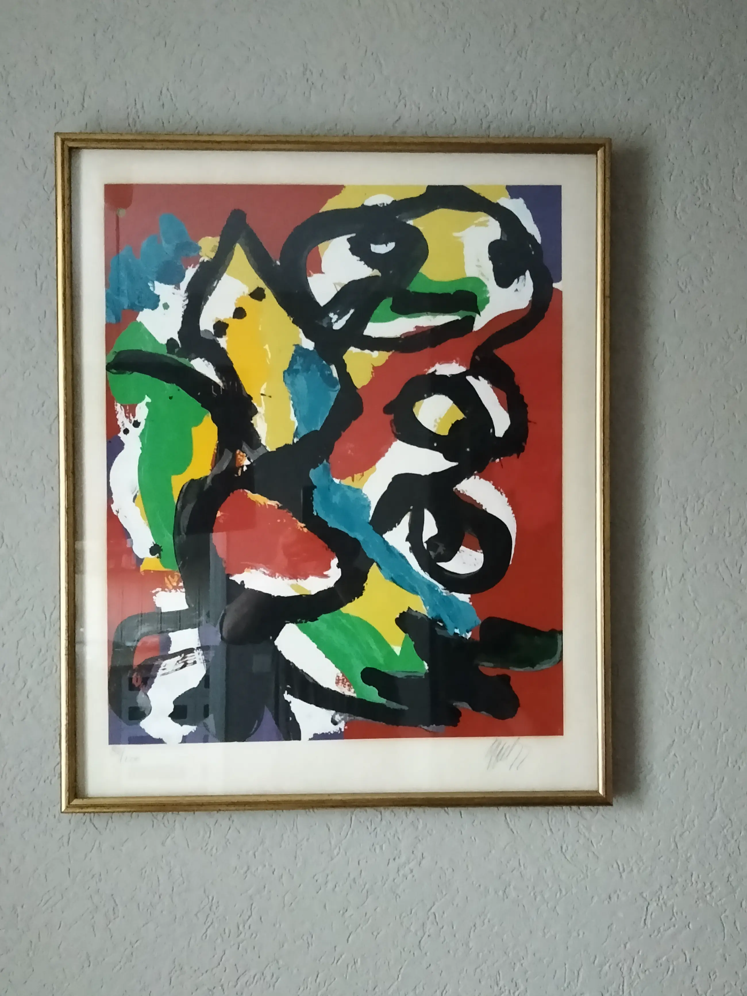 Zeer mooie zeefdruk van Karel appel uit 1977 Mooi en strak ingelijst , ophangklaar kan zo aan de muur Oplage nummer 82/100 uiteraard potlood gesigneerd gedateerd en genummerd door karel appel