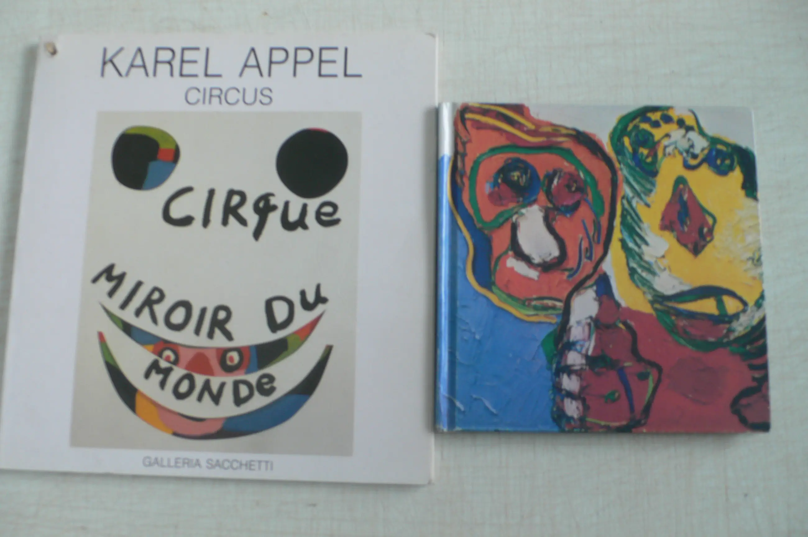 Twee fraaie uitgaven van Karel Appel, waaronder Karel Appel Cirque Miroir du Monde (sofdtcover). Uitgave met de prachgtige circus-serie van de kunstenaar. Exemplaar van galerie Reflex - uit de collectie van deze Amsterdamse galeriehouder - met een gaatje bovenin rechts, waardoor een touwtje werd gehaald, om te voorkomen dat het boekje per ongeluk zou worden meegenomen. Bovendien staan de prijzen (in guldens) naast de afbeeldingen en enkele stickertjes naast de toen verkochte werken.