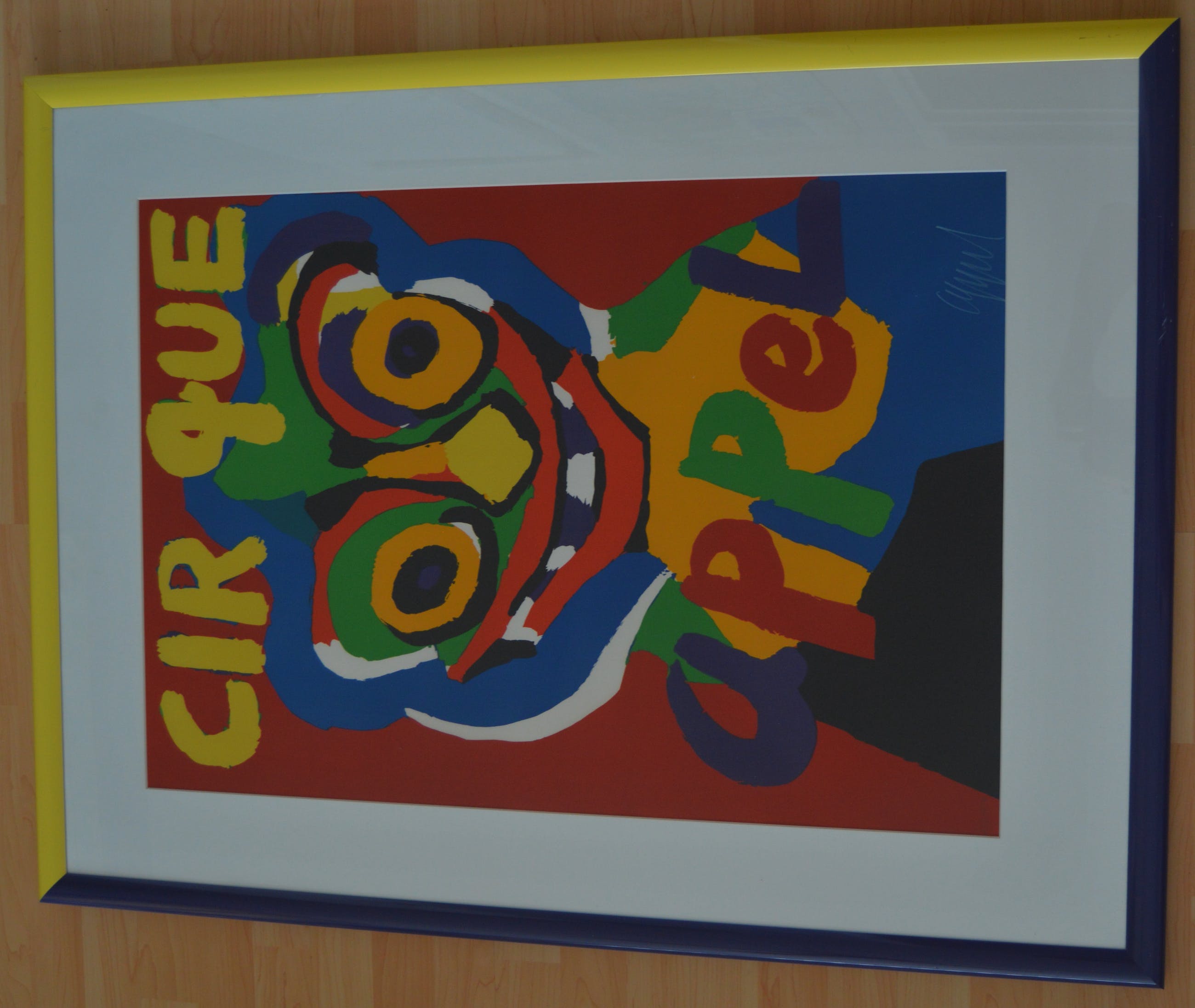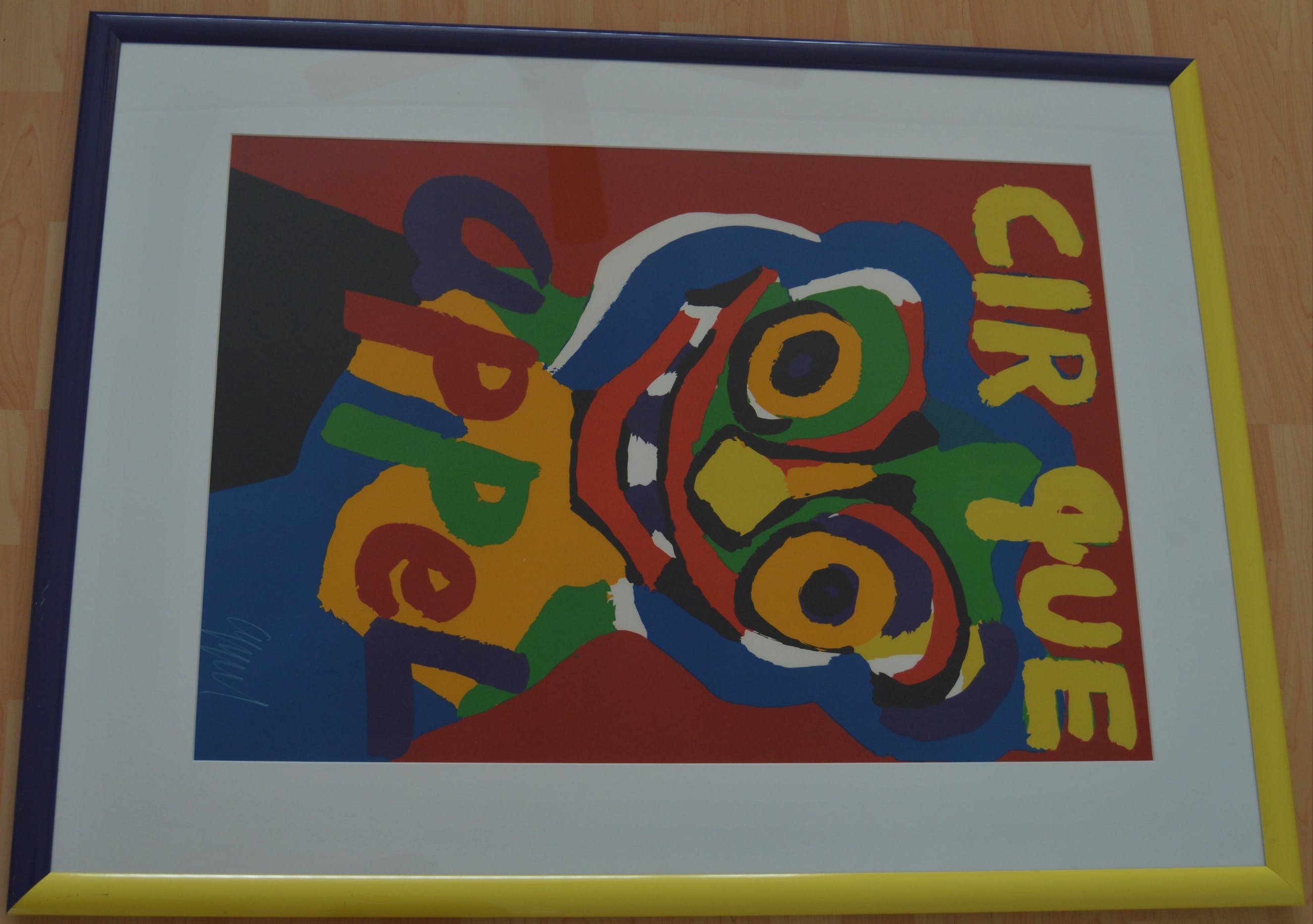 Prachtig ingelijste zeefdruk door Karel Appel. Mooie kleuren dus niet in de zon gehangen oid. Het werk zit achter glas. Gesigneerd en genummerd. Gezien de afmetingen van het glas is ophalen de enige optie. Verzenden kan door een koerier.