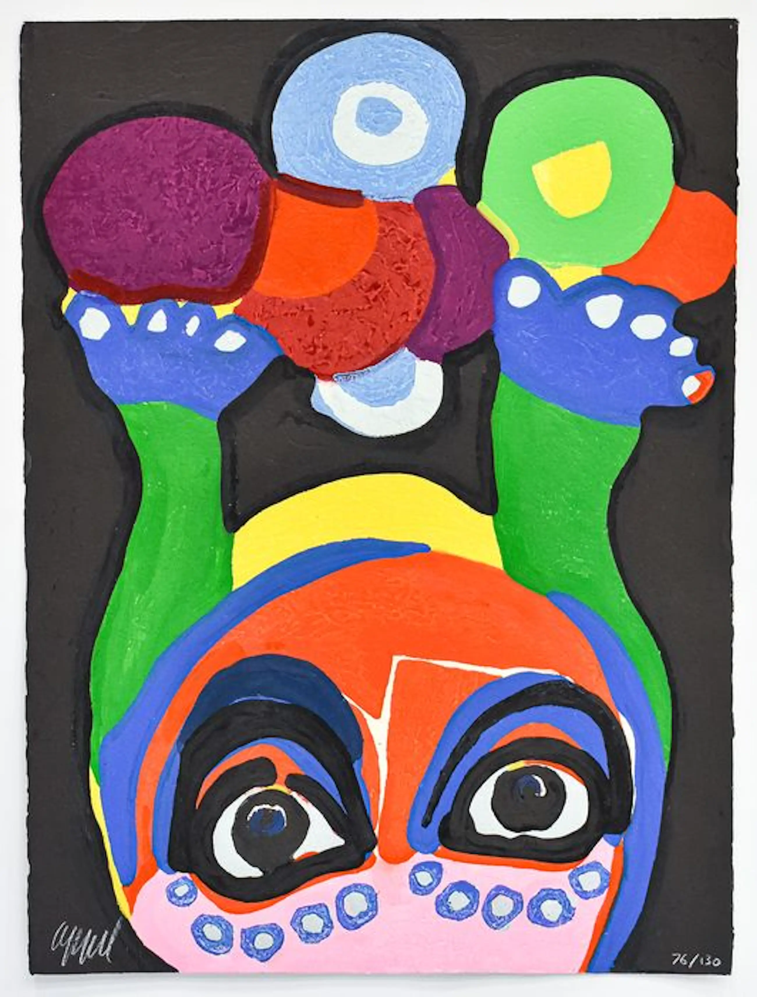 Schitterende houtsnede van Karel Appel uit de beroemde Circusserie. Deze werken worden door veel kenners beschouwd als het mooiste grafiek dat Appel ooit maakte. Uiteraard gesigneerd door Karel Appel. Prachtig reliëf in het werk.