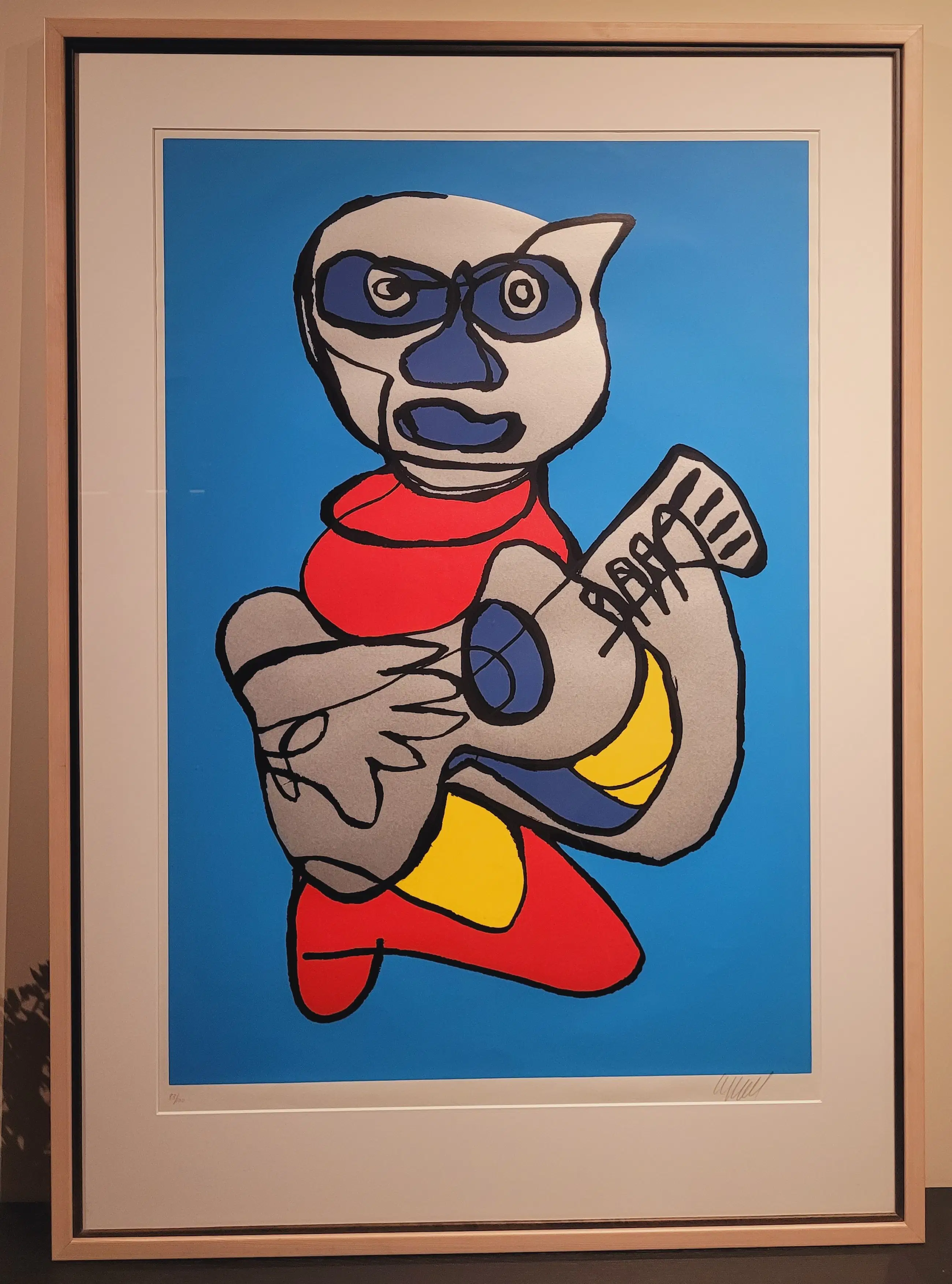 Krachtige, energieke zeefdruk met Appels kenmerkende dikke contourlijnen, vereenvoudigde vormen en kleur als pure energie. De intens blauwe achtergrond laat de rode en gele accenten extra fel uitkomen. Het beeld draait rond de overdreven grote handen: tegelijk gebaar en ritme, waardoor het werk veel beweging en spontaniteit krijgt.
