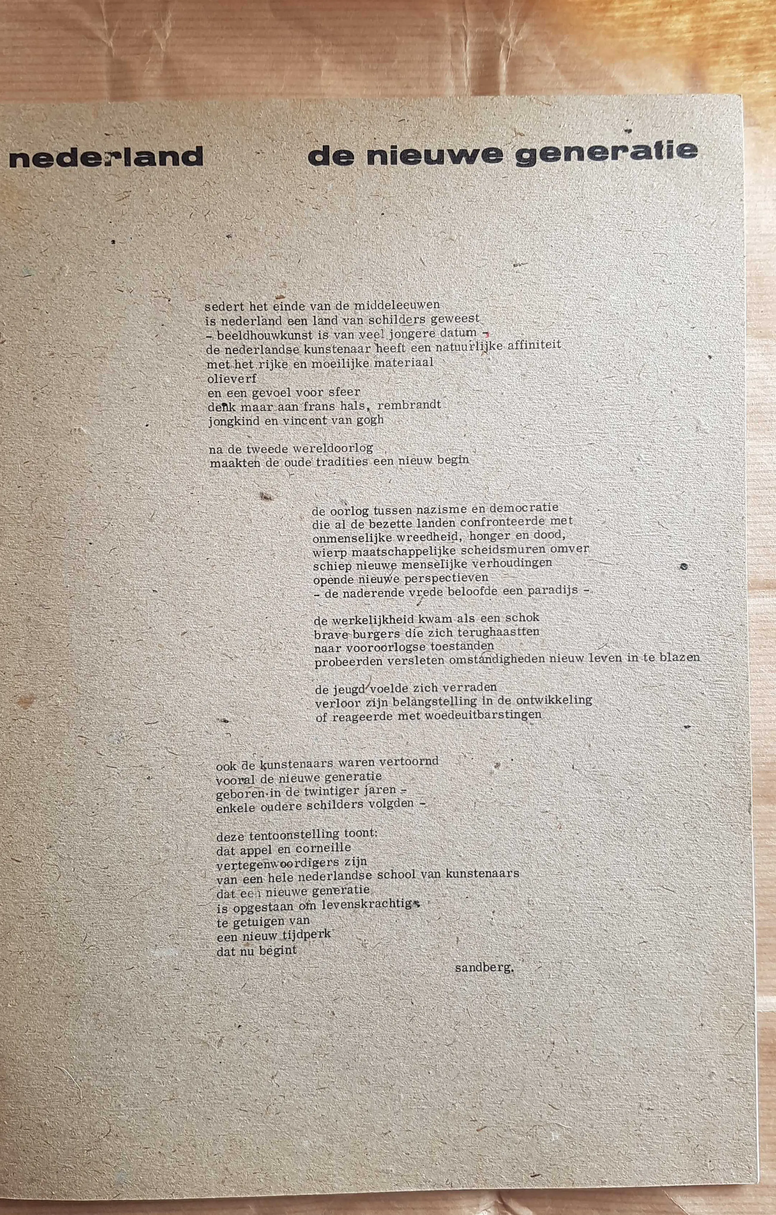 1. nederland de nieuwe generatie; “deze verzameling is bijeengebracht door dr. w. sandberg (….) en wordt getoond in het curaçaos museum, willemstad, curaçao; januari 1965.