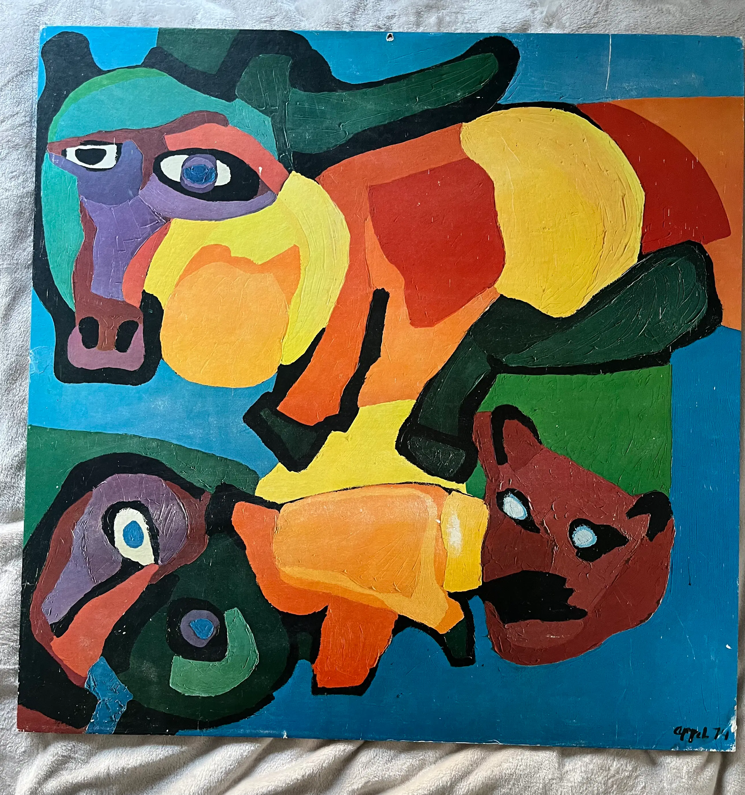 Zeefdruk van Karel Appel uit 1974, getiteld De gedresseerde circuskloe met dansende kat. Het werk is gesigneerd in potlood “Appel ’74” en genummerd “9.” (oplage niet vermeld op het blad). De zeefdruk werd gedrukt door Boom-Ruygrok B.V. Op de achterzijde bevinden zich titel- en productielabels. Het werk heeft een groot formaat van 150 × 150 cm en wordt oningelijst aangeboden. Het vertoont lichte leeftijdsgerelateerde gebruikssporen. Een expressieve grafische print van een van de belangrijkste vertegenwoordigers van de COBRA-beweging.