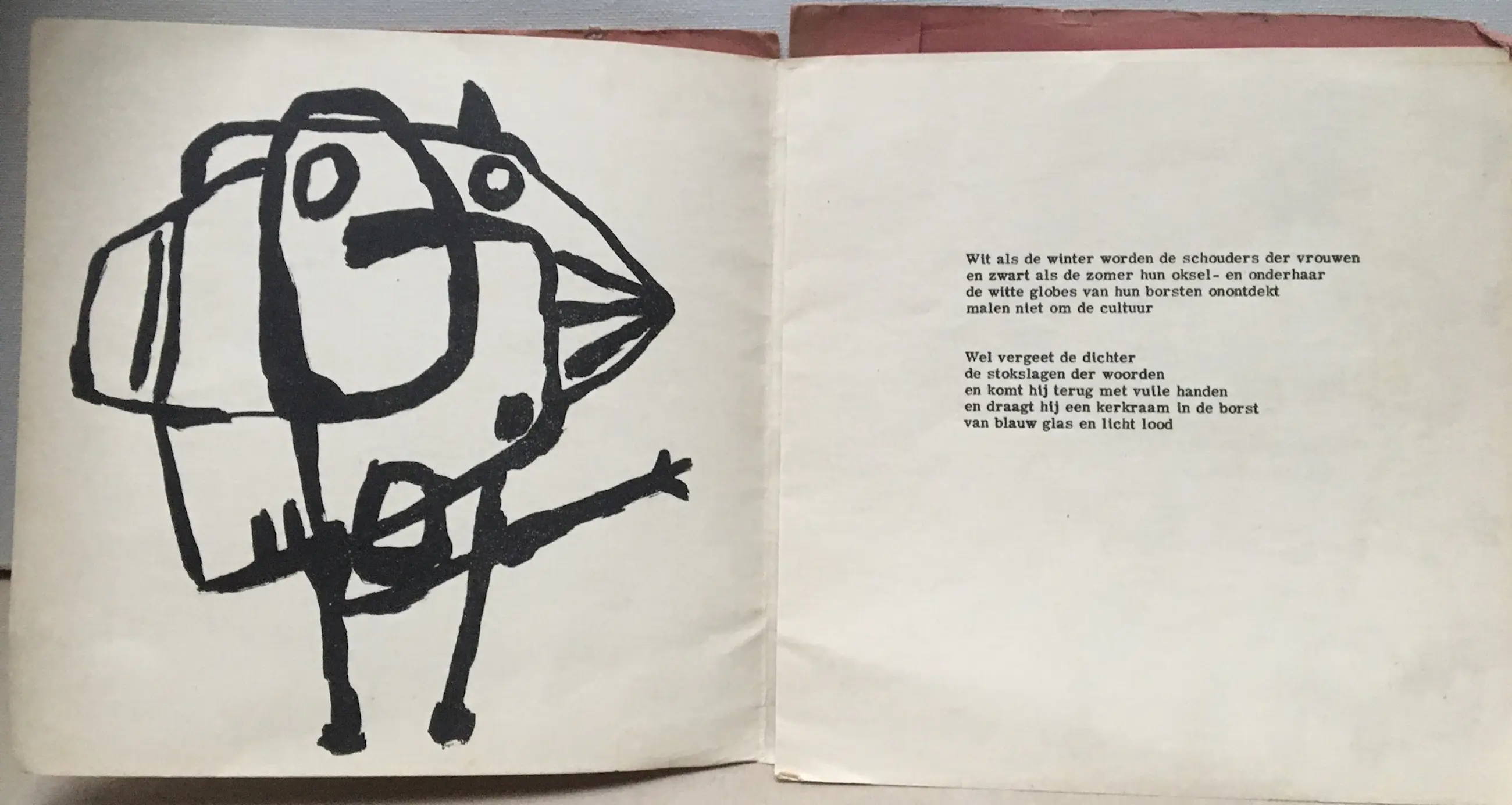 Een boekje door Karel Appel en Hans Andreus. De Omslag is beschadigd ,de voorkant is los van de achterkant geraakt. Het boekje bestaat uit drie dubbelvellen die in elkaar gevouwen zijn. Daar is geen schade aan. Het zijn teksten van Hans Andreus en tekeningen van Karel Appel. in totaal zijn er 100 boekjes dit is boekje 62. gemaakt in Parijs Mei 1952