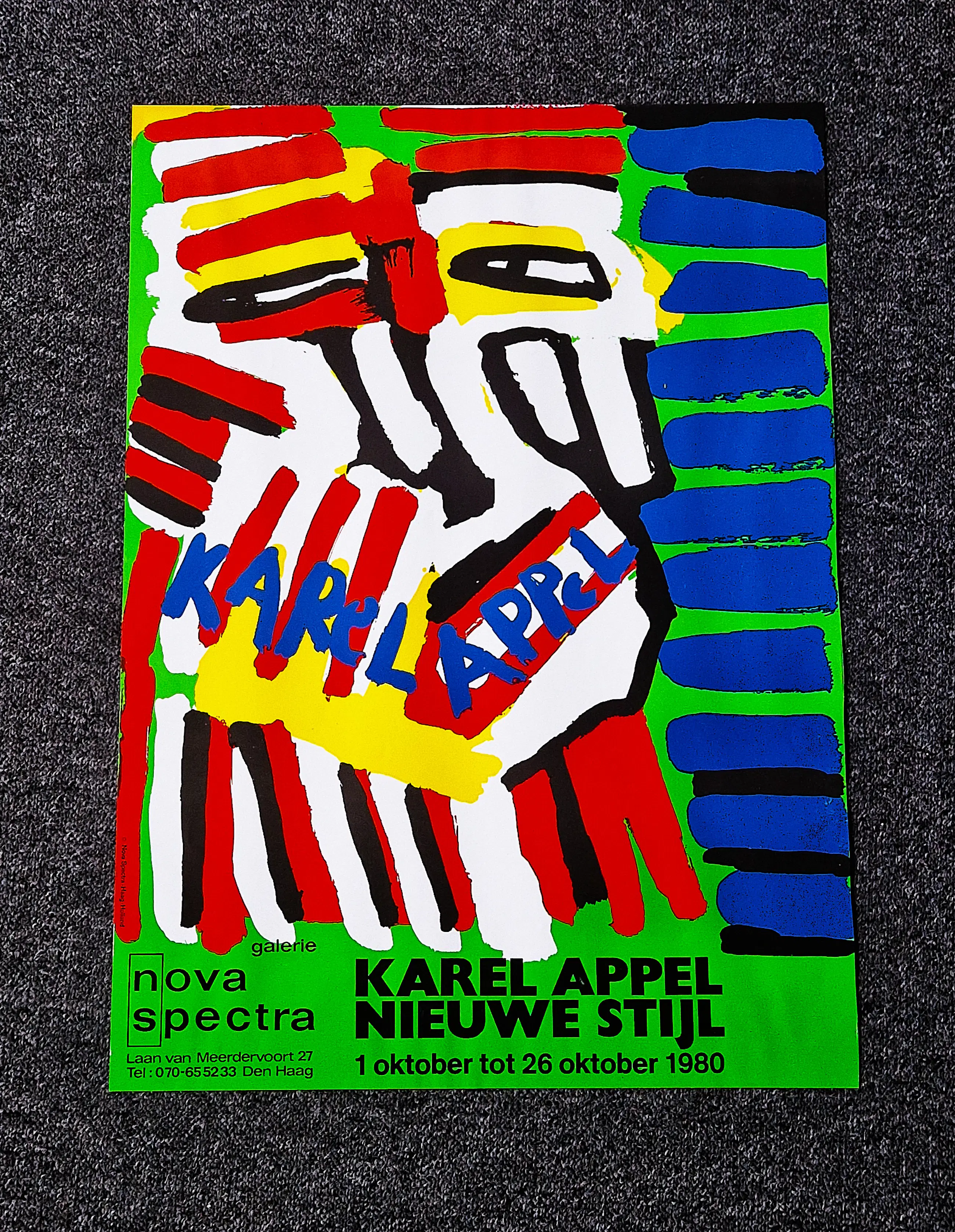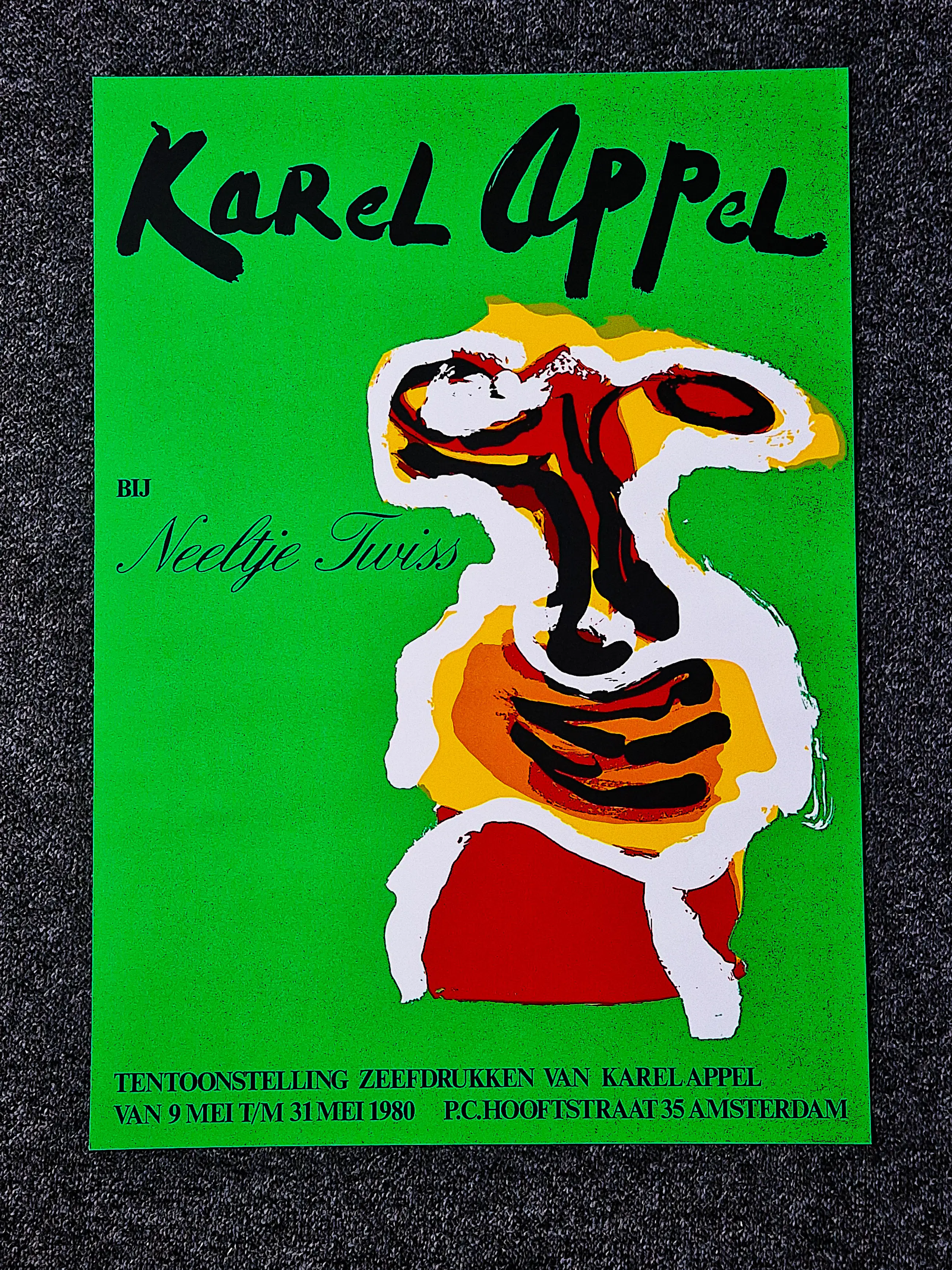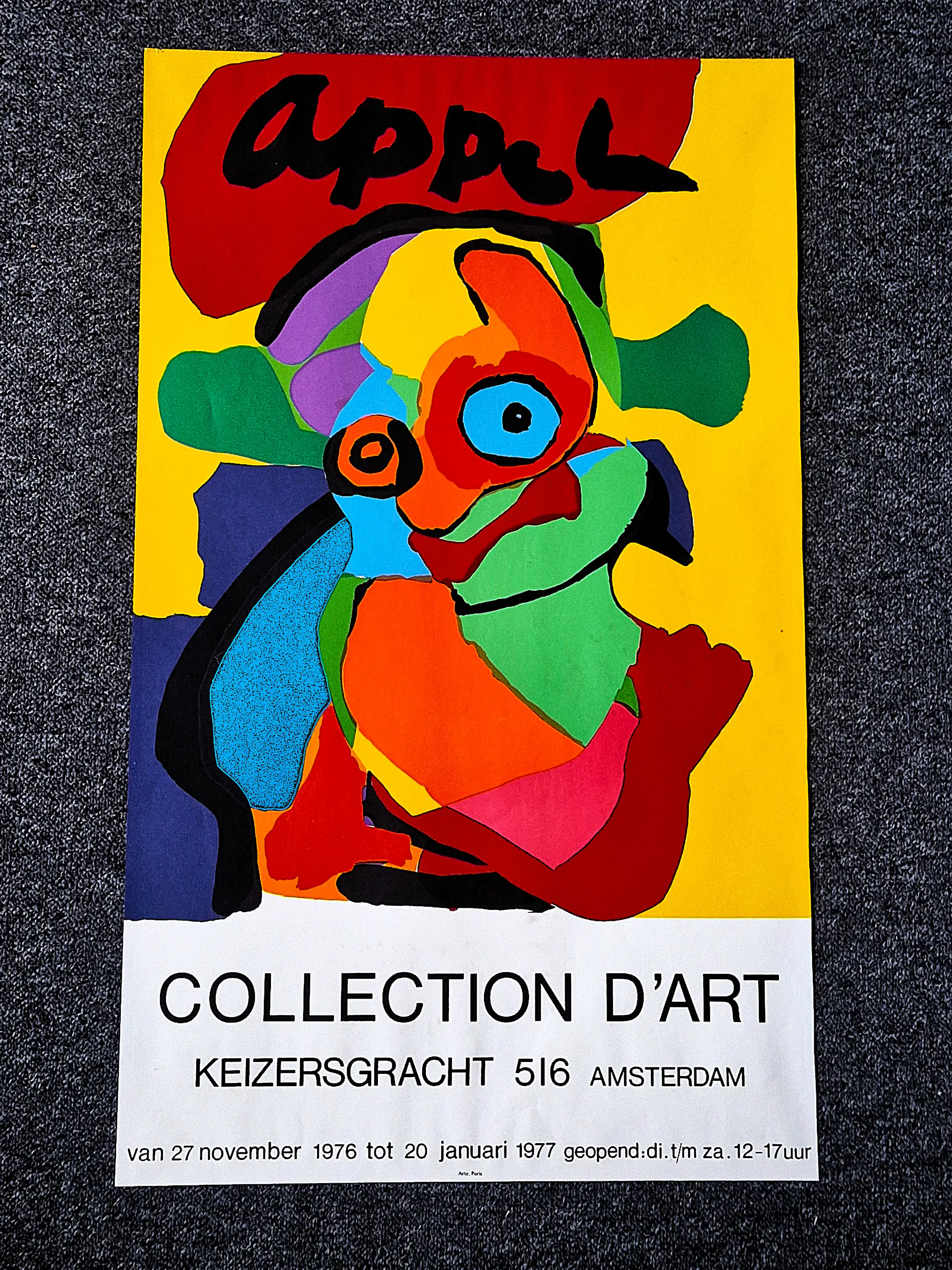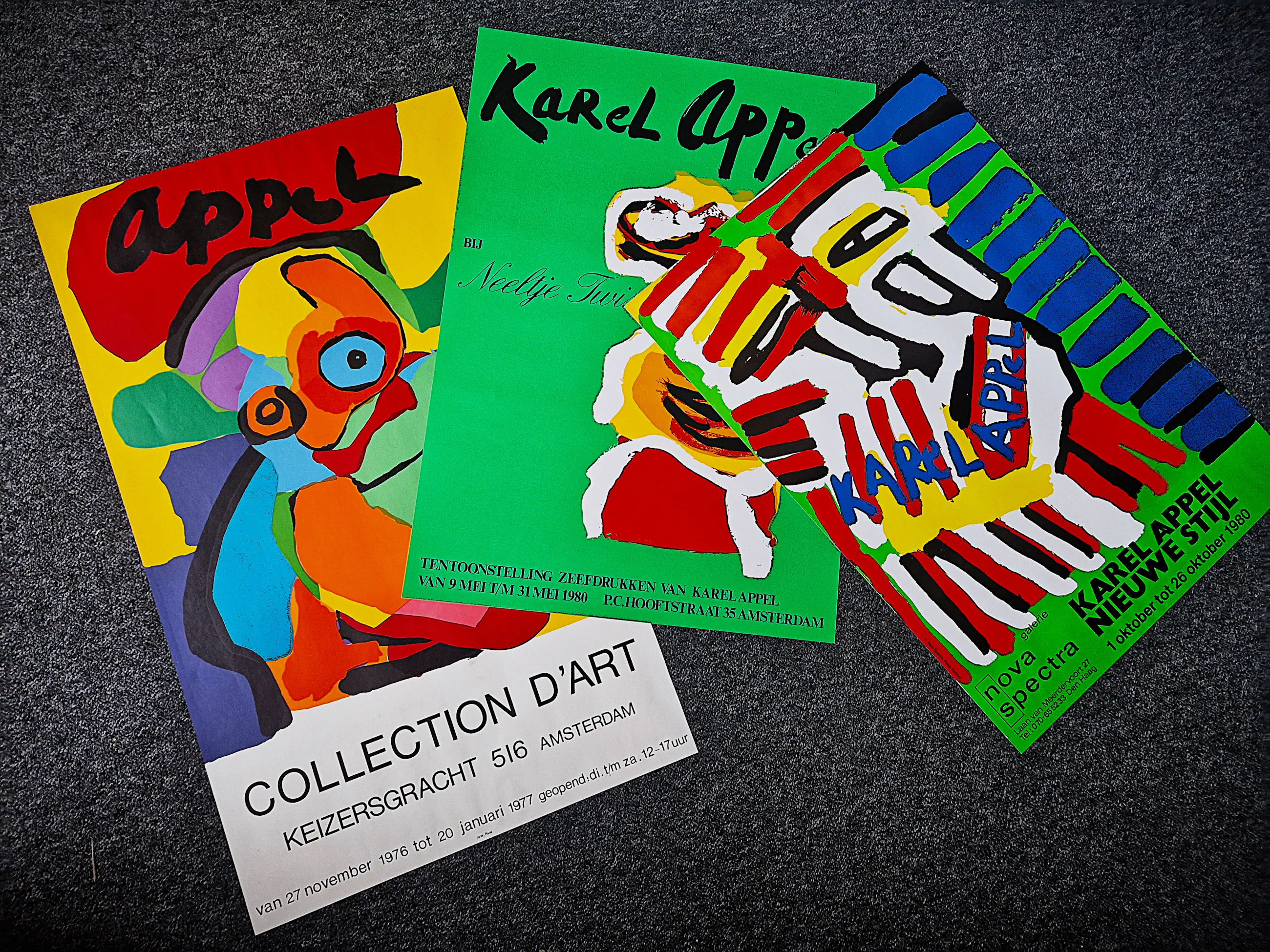 - Drie originele offset kleuren affiches voor zijn exposities bij Collection d'art. Keizersgracht 5/6 Amsterdam." Col. serigr. poster, 86x50,8 cm., Paris, Arte, 1976 (sl. soiled/ foxed). - AND 2 other col. serigr. posters by the same, i.a. "Karel Appel bij Neeltje Twiss" (Amst., 1980).