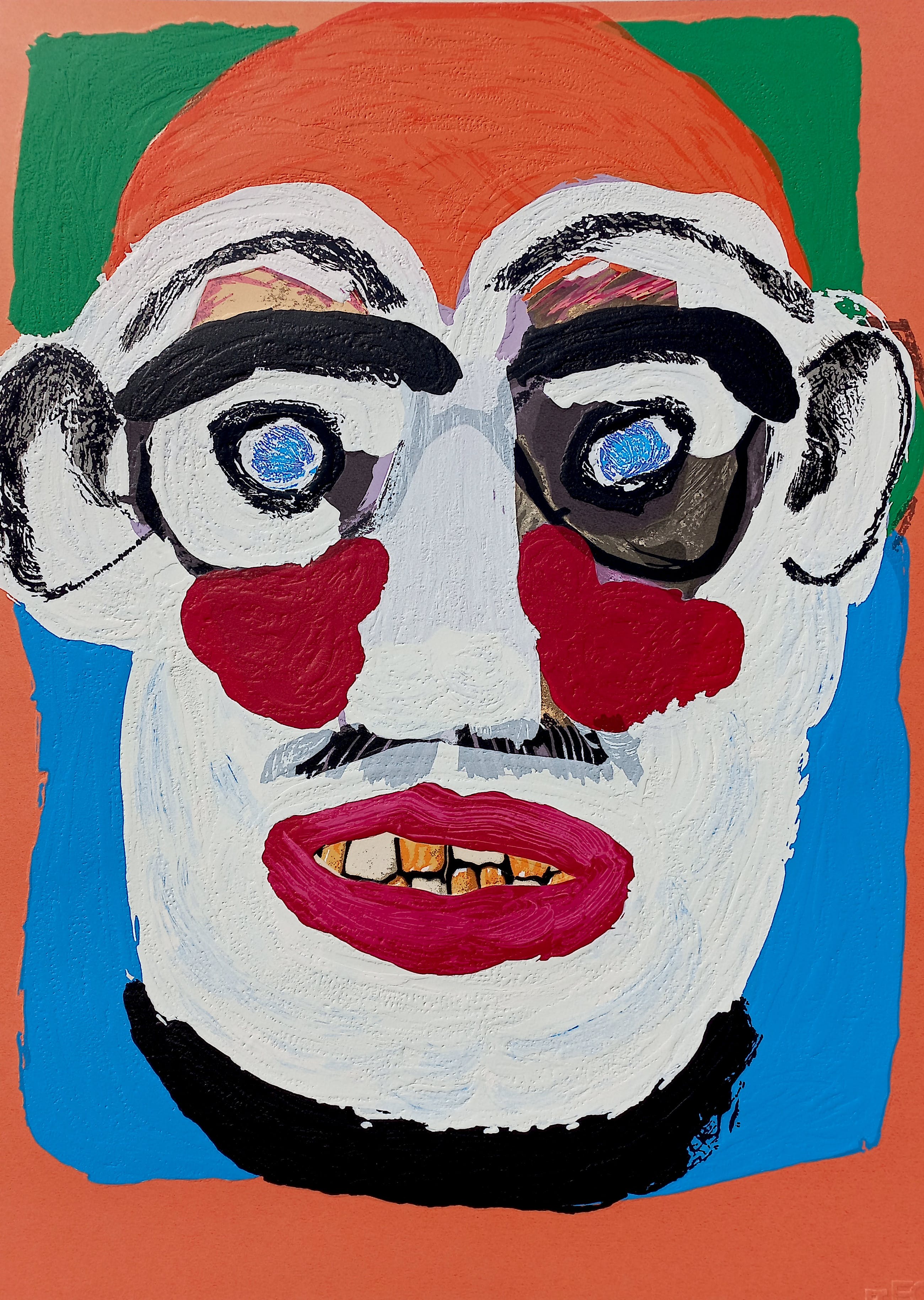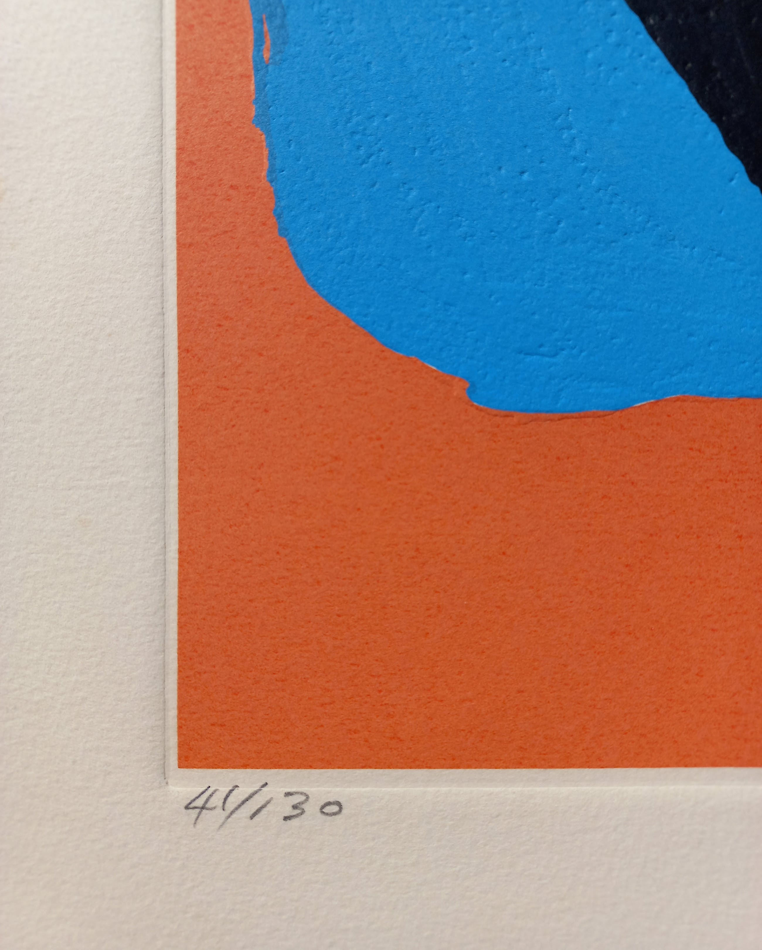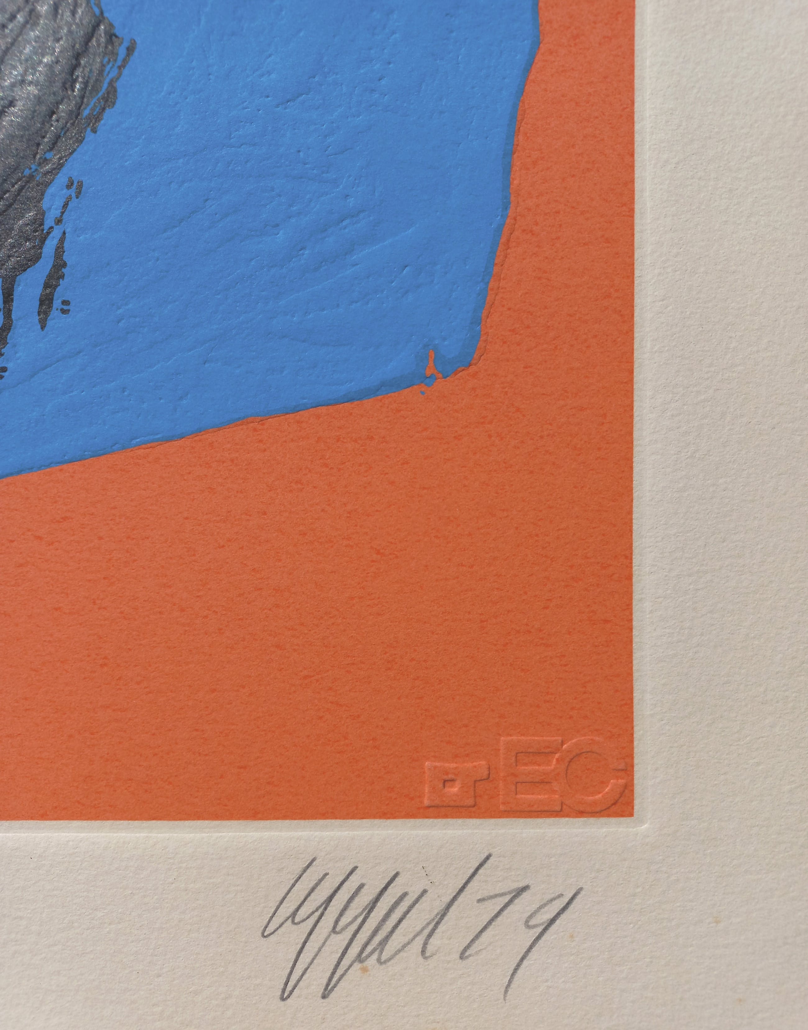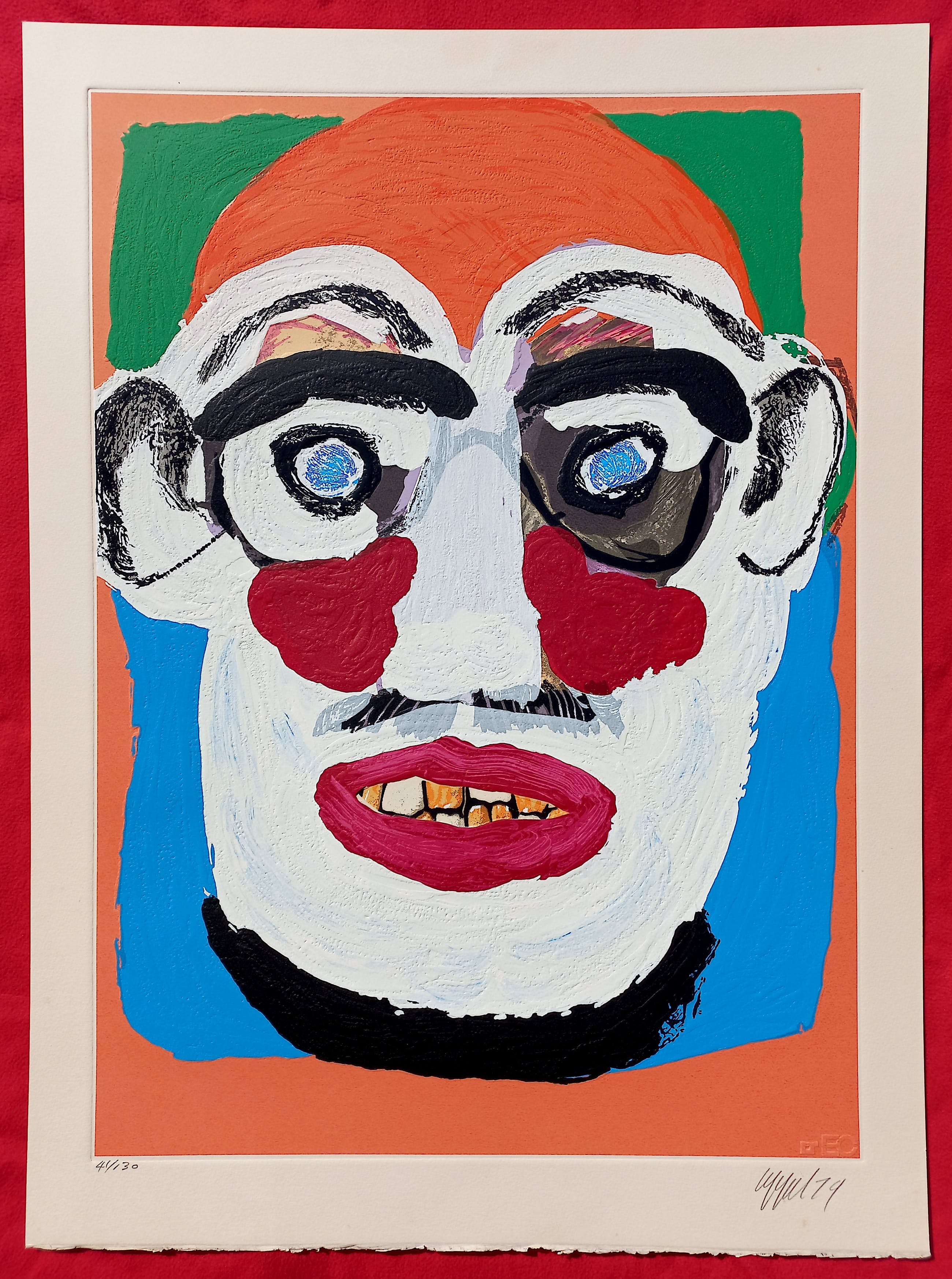 Grote, kleurrijke Appel uit de Bedized Pudding Canadian Suite. Gemengde druktechniek met reliëf op 300 grams Arches papier, met potlood gesigneerd, gedateerd (‘79) en genummerd (41/130) en met blindstempel van de uitgever Editions Canada. In zeer goede conditie; slechts een paar foxing plekjes in de marge die wegvallen bij inlijsting met een passe-partout.