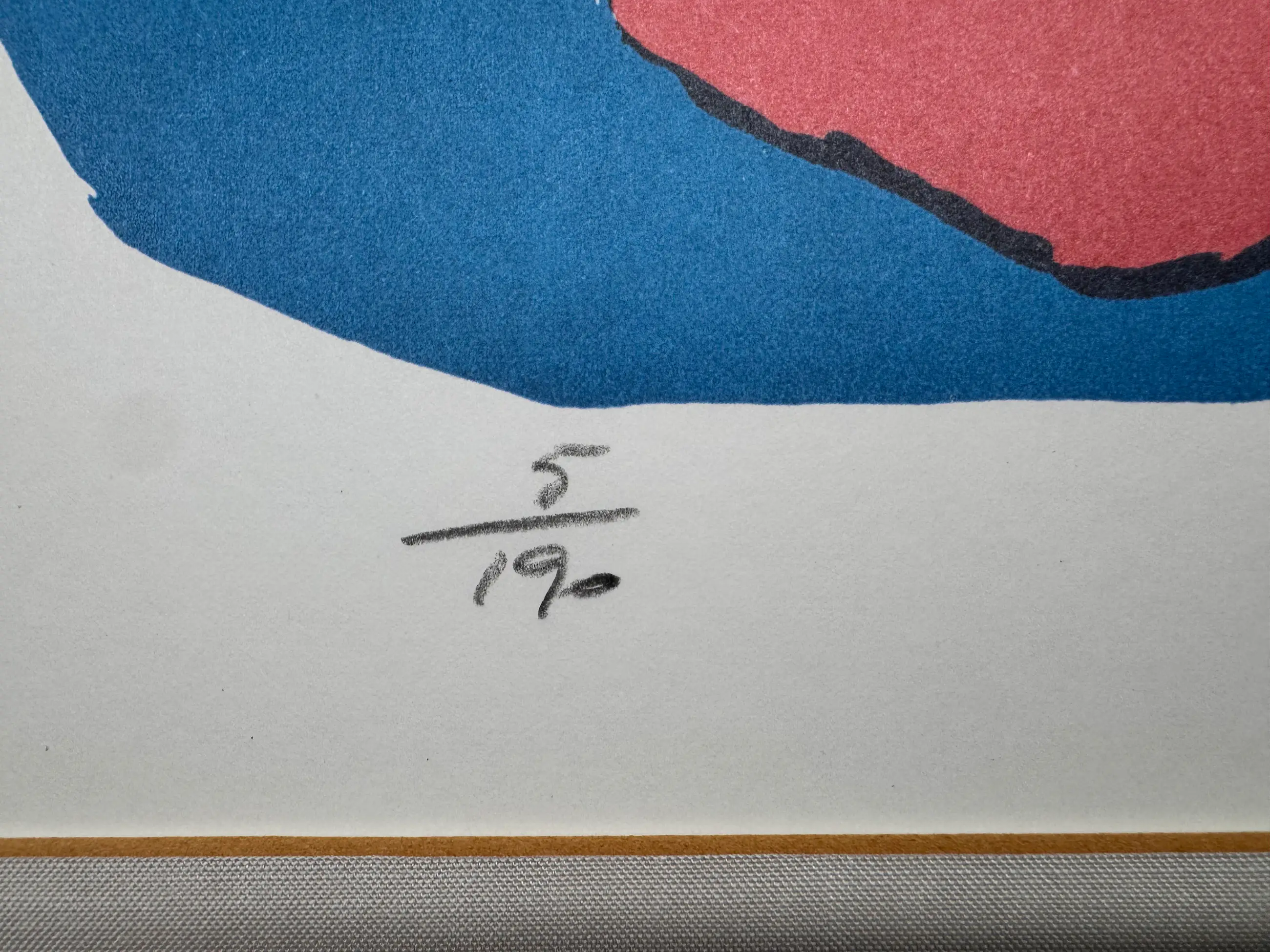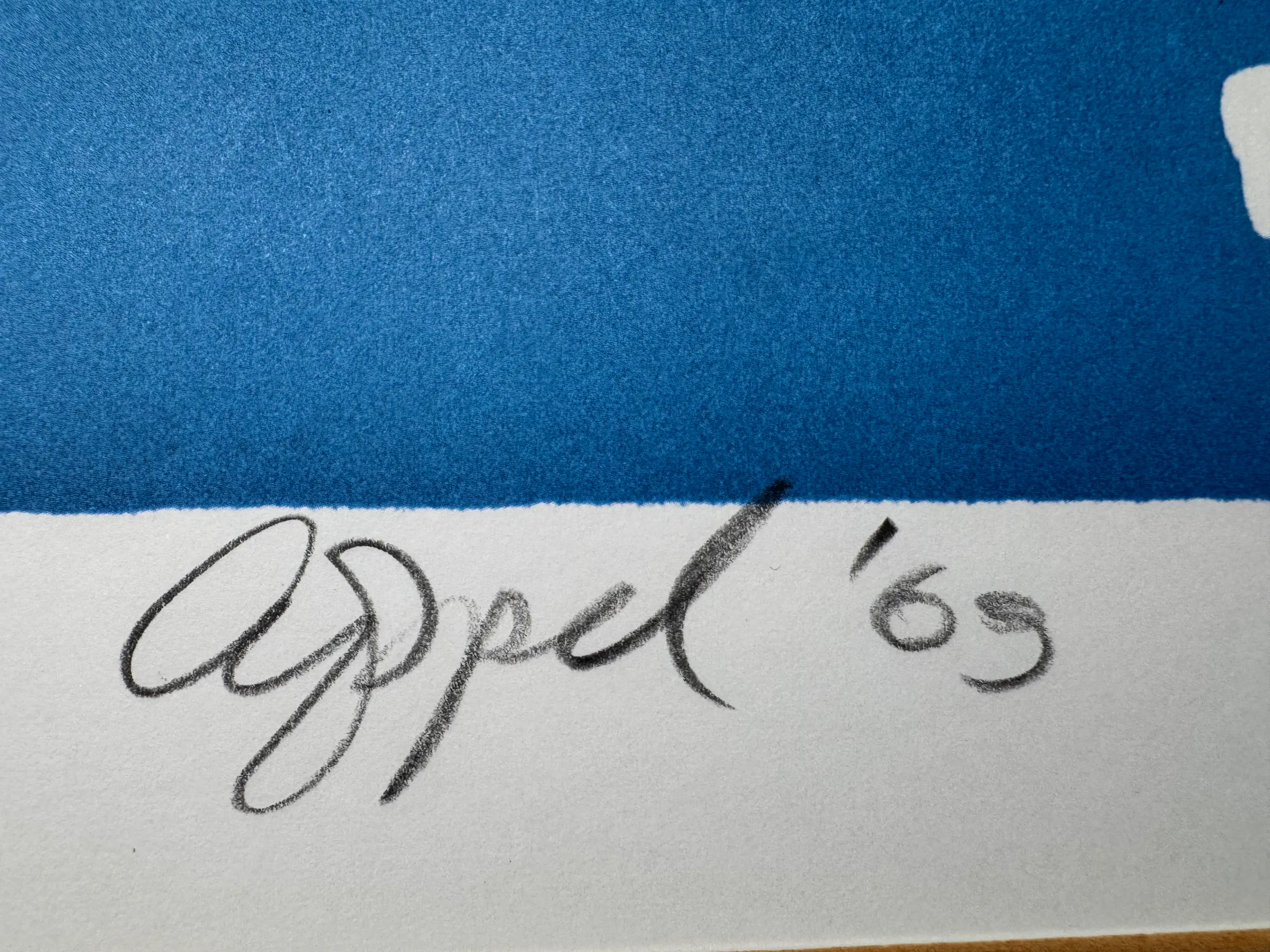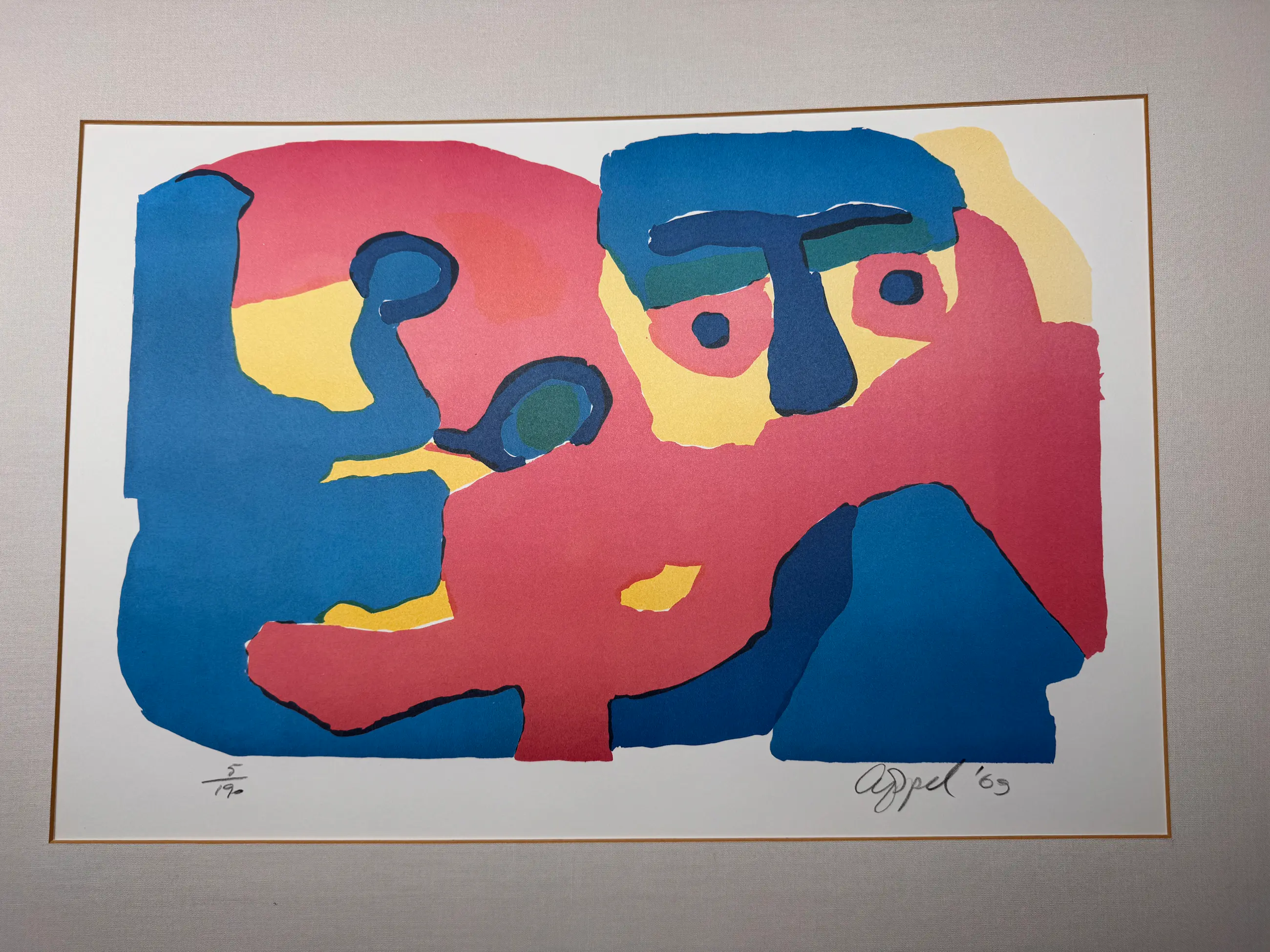 Grafisch werk uit de bekende expressieve stijl van Carel Appel. Het werk toont een karakteristiek maskerachtig gezicht met krachtige kleurvlakken en zwarte contouren.