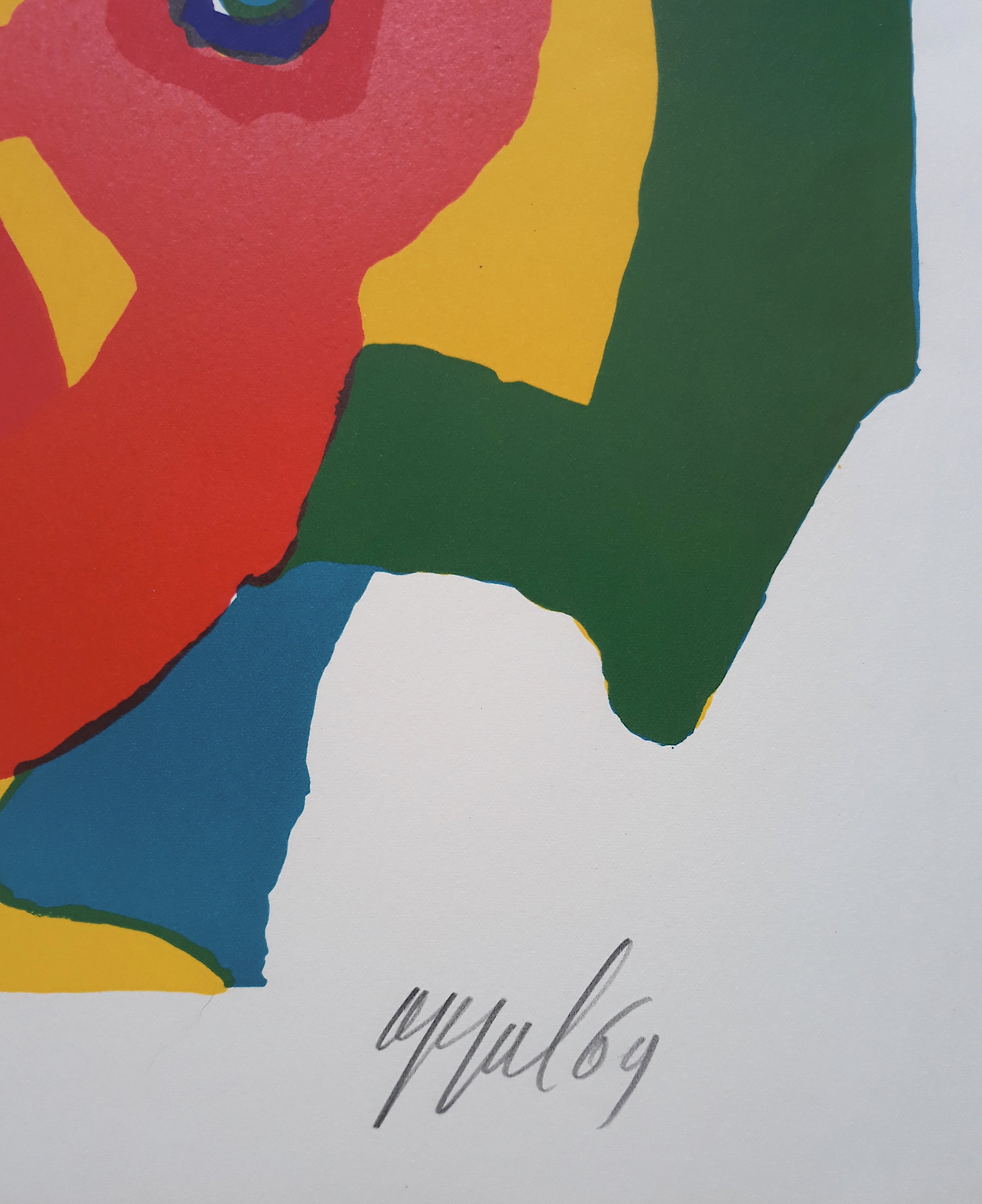 Mooi, karakteristiek werk van Karel Appel, uitgegeven door Prent 190. Zeefdruk op geschept papier, met potlood gesigneerd, gedateerd (‘69) en genummerd (8/190). In uitstekende conditie.