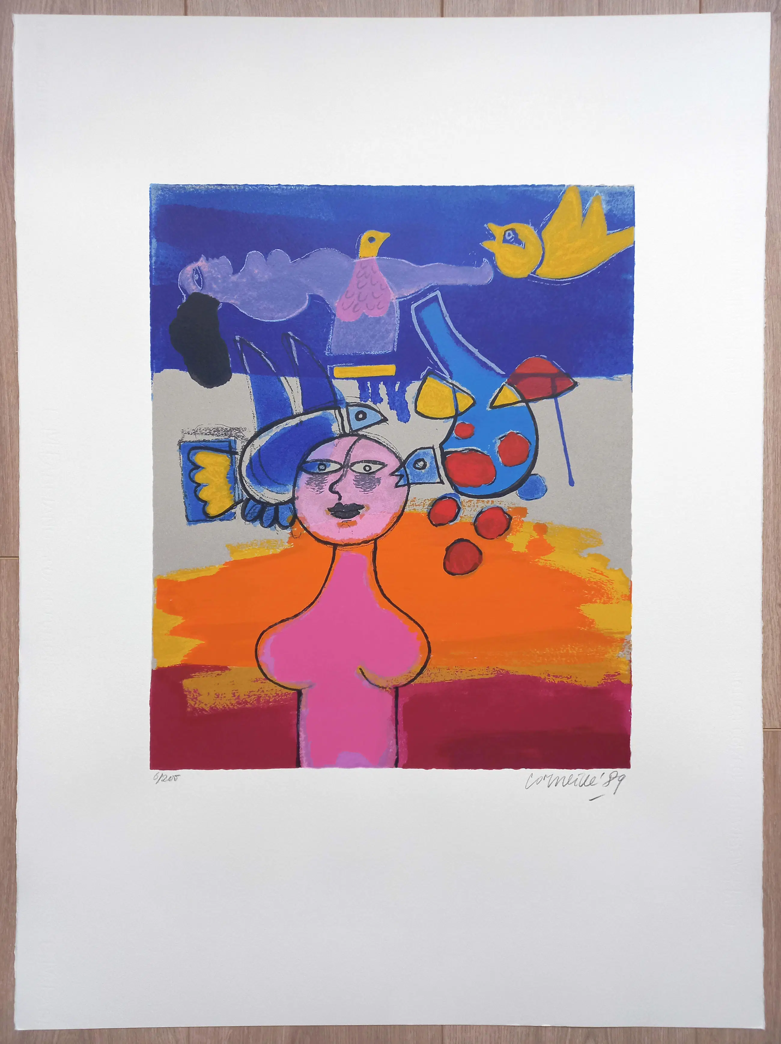 Zeer mooi, dromerig werk uit de serie “Six Reves Peints”, een reeks die Corneille maakte naar werk van de schrijvers/dichters Lewis Carroll, Jorge Luis Borges, Henry Michaux, Antonio Machado, Paul Eluard en Gaston Bachelard. Zeefdruk op 300 grams Fabriano papier, met potlood gesigneerd, gedateerd (‘89) en genummerd (6/200). In mint conditie.