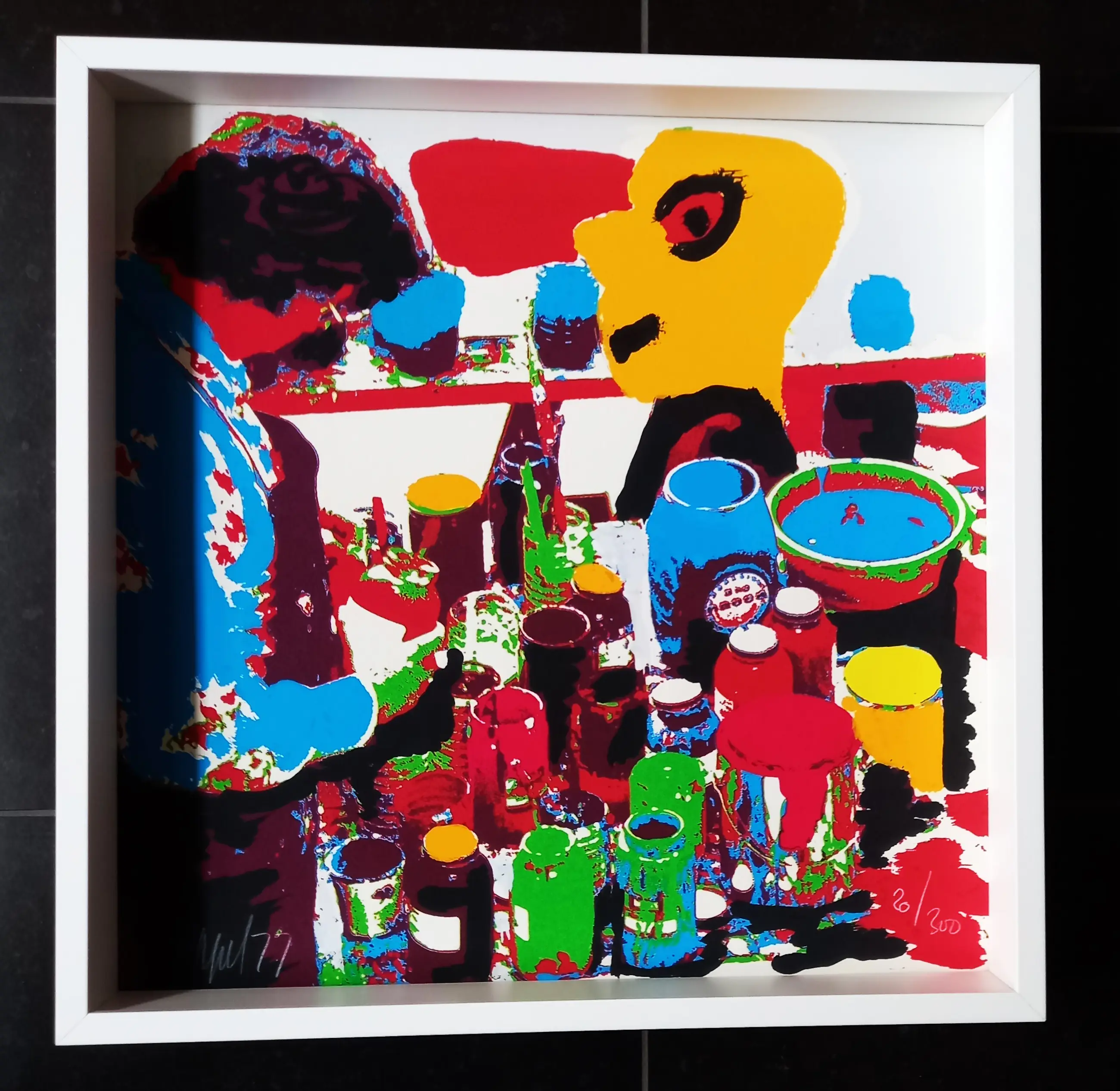 Aflopende zeefdruk van Cobra-kunstenaar Karel Appel. Gesigneerd en genummerd in potlood.