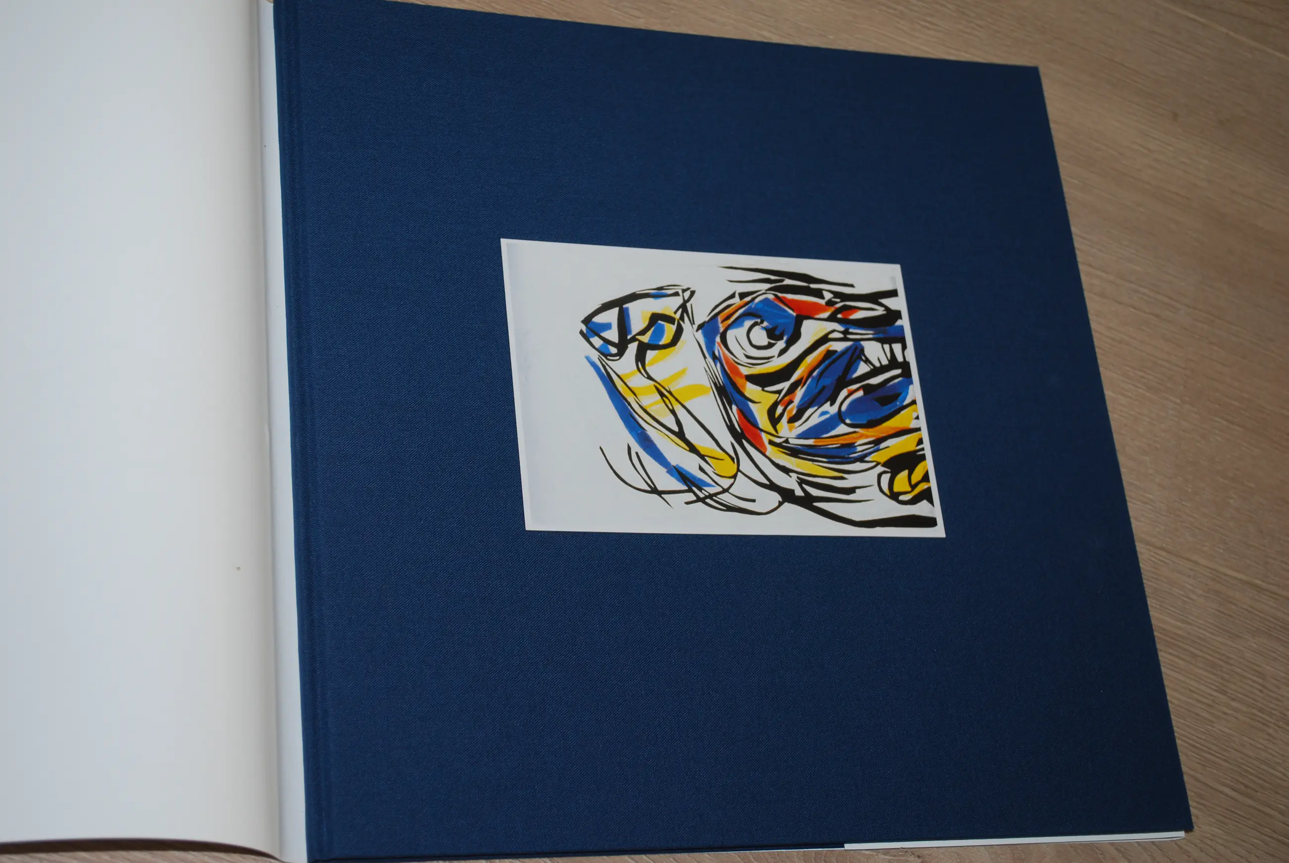 Het hardcoverboek 'glasraam voor de bank' zit in een linnen/kartonnen foedraal.