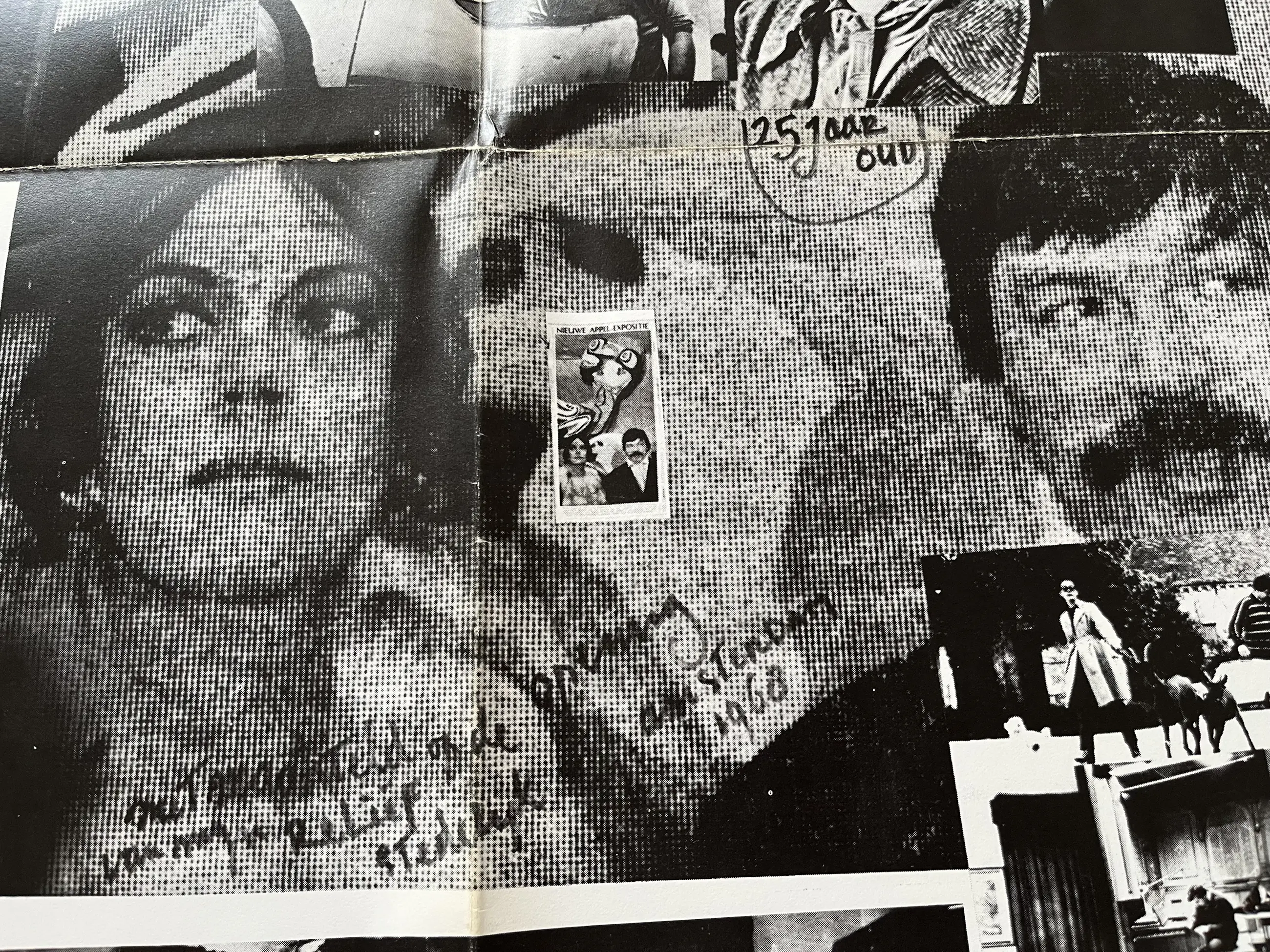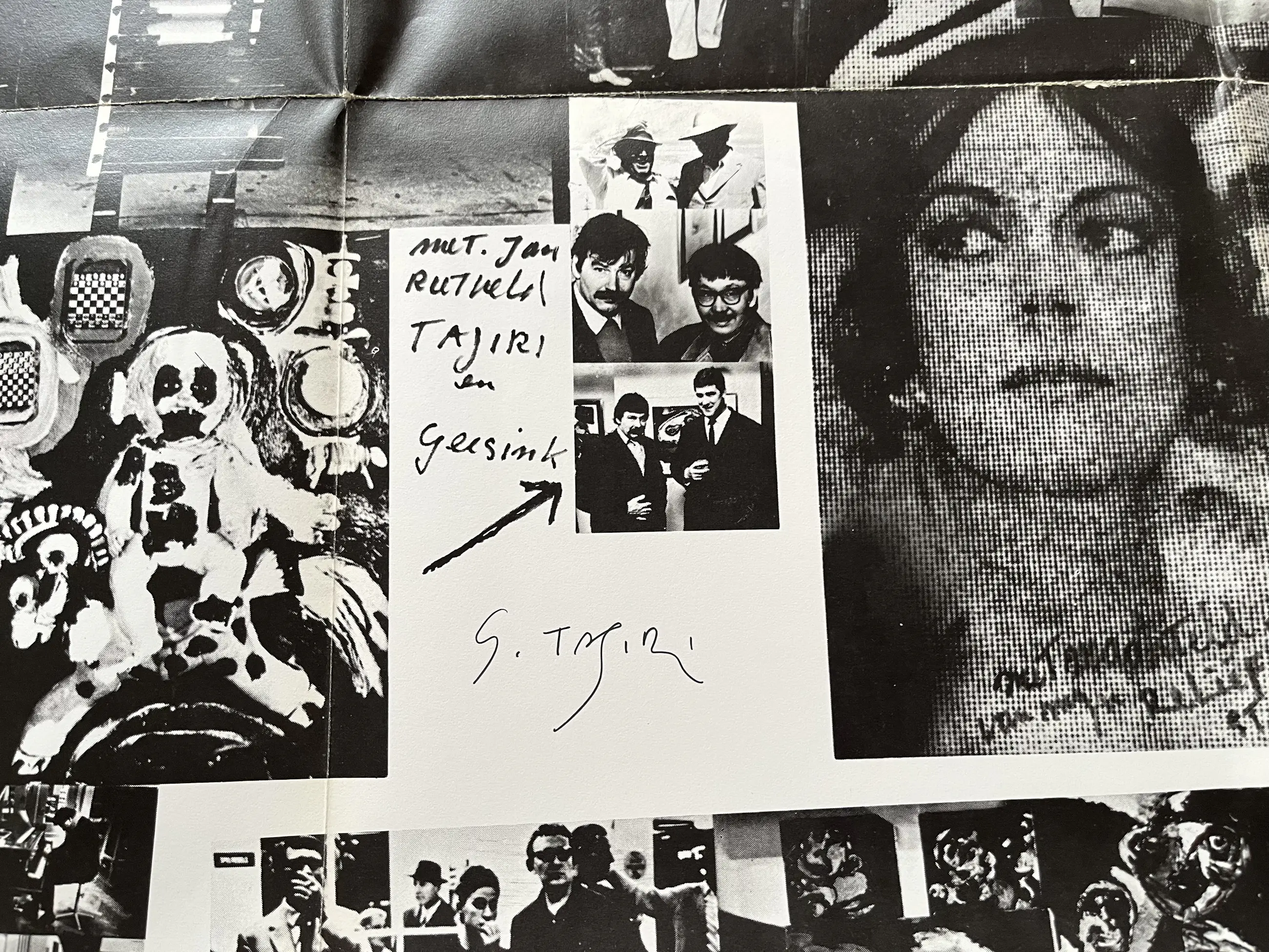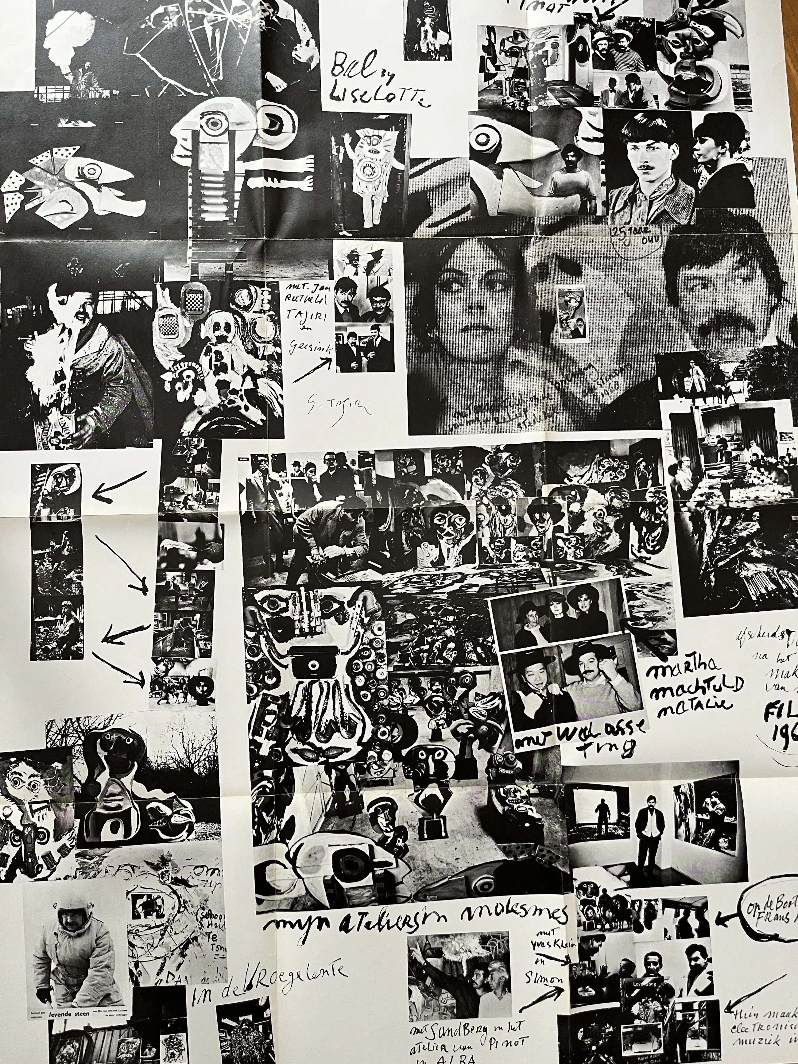 Een grote geprinte fotocollage waarin Karel Appel diverse mensen afbeeld en waarin hij verteld over gebeurtenissen in zijn kunstenaarsbestaan. Het grote blad uit 1969 lag opgevouwen in een doos uit de collectie van mijn overleden vriend. Het blad is, jammer genoeg NIET door Karel Appel gesigneerd, maar door TAJIRI langs een foto, waarop hij is afgebeeld. Over het blad lopen zichtbare rechte vouwen, omdat het blad op die wijze is uitgebracht en bewaard. Afmeting helemaal uitgeklapt 114 x 86 cm. Opgevouwen 29 x 29 cm.