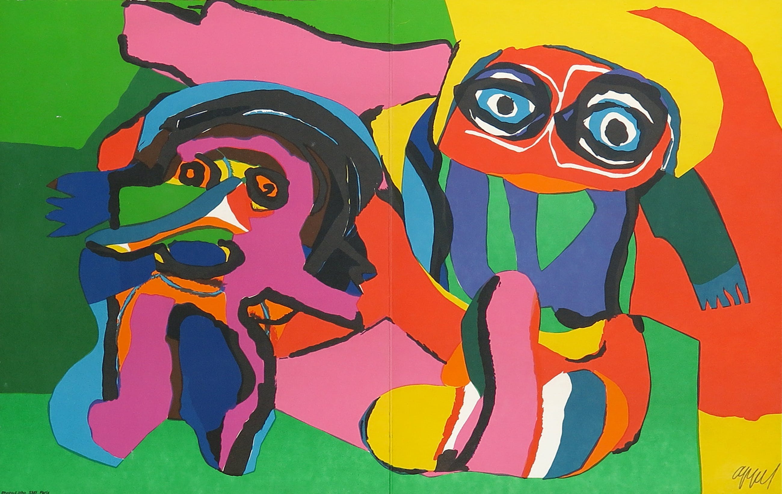 Ingelijste litho van Karel Appel uit de uitgave Ariel 19, uitgebracht door Galerie Ariel te Parijs bij de tentoonstelling Superpositions. De litho is rechtsonder gesigneerd en betreft het middenblad van de uitgave / tentoonstellingscatalogus die in 1971 werd uitgebracht. Dit item is inclusief deze uitgave.