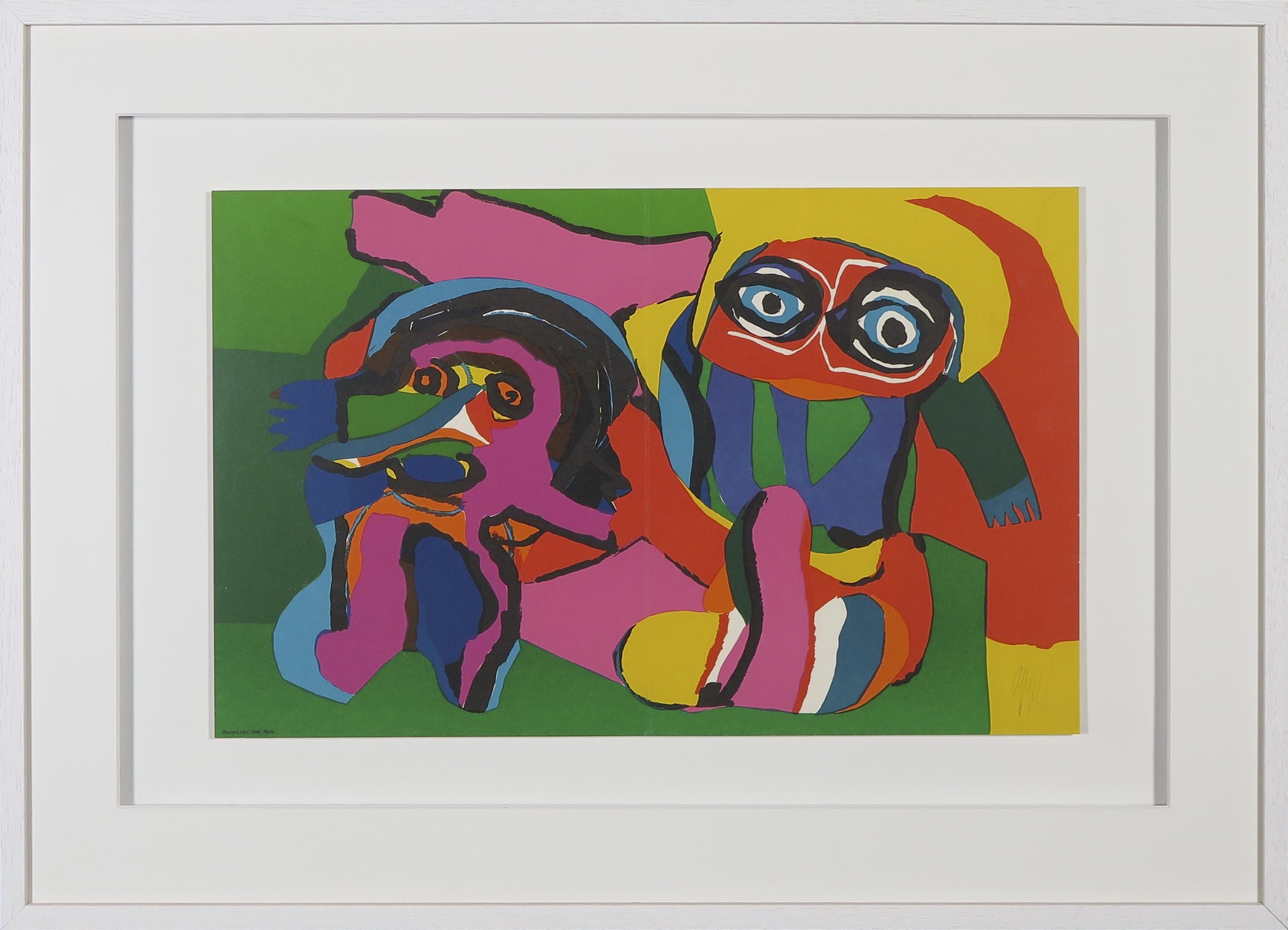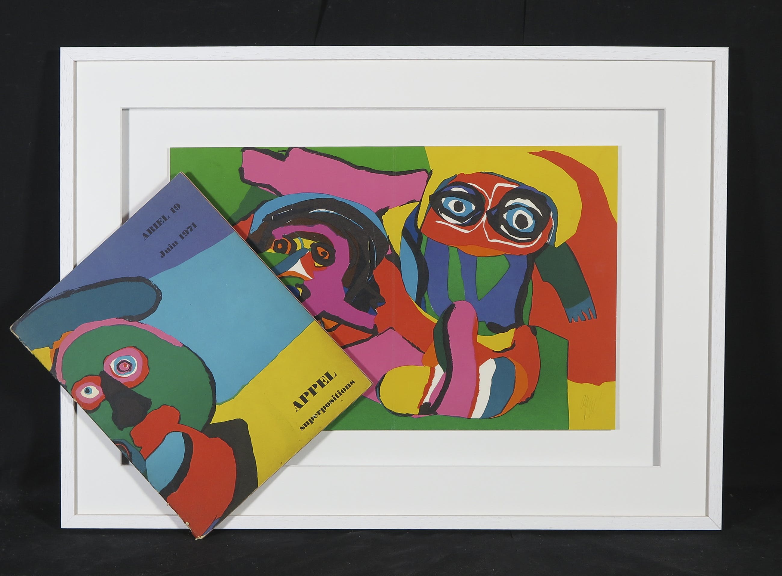 Fraai ingelijste litho van Karel Appel uit de uitgave Ariel 19, uitgebracht door Galerie Ariel te Parijs bij de tentoonstelling Superpositions. De litho is rechtsonder gesigneerd en betreft het middenblad van de uitgave / tentoonstellingscatalogus die in 1971 werd uitgebracht. Dit item is inclusief deze uitgave en met een uitnodigingskaart voor de vernissage van Superpositions.
