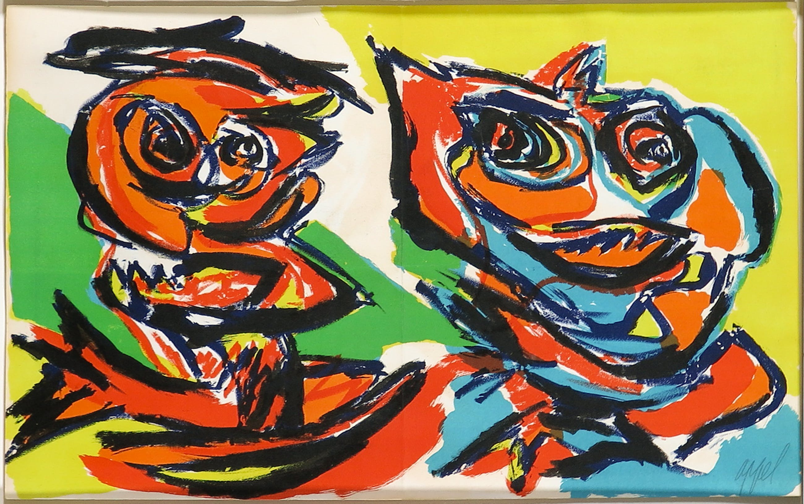 Ingelijste litho van Karel Appel uit de uitgave Ariel 4, uitgebracht door Galerie Ariel te Parijs. De litho is rechtsonder gesigneerd en betreft het middenblad van de uitgave / tentoonstellingscatalogus die in 1966 werd uitgebracht. Dit item is inclusief deze uitgave.