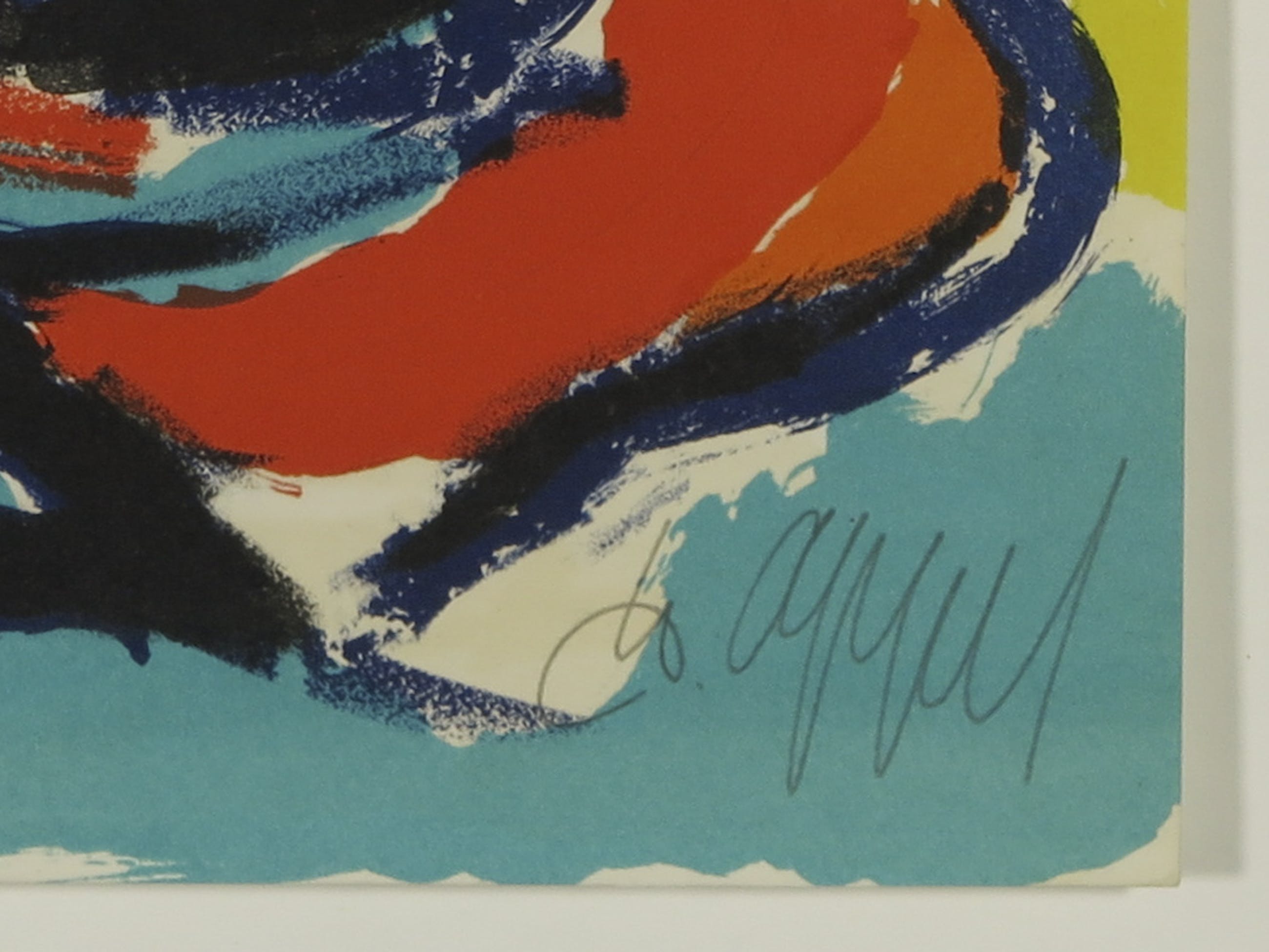 Fraai ingelijste litho van Karel Appel uit de uitgave Ariel 4, uitgebracht door Galerie Ariel te Parijs. De litho is rechtsonder gesigneerd en betreft het middenblad van de uitgave / tentoonstellingscatalogus die in 1966 werd uitgebracht. Dit item is inclusief deze uitgave met daarin nog twee zwart-wit litho's van Karel Appel en een nawoord door Walasse Ting.