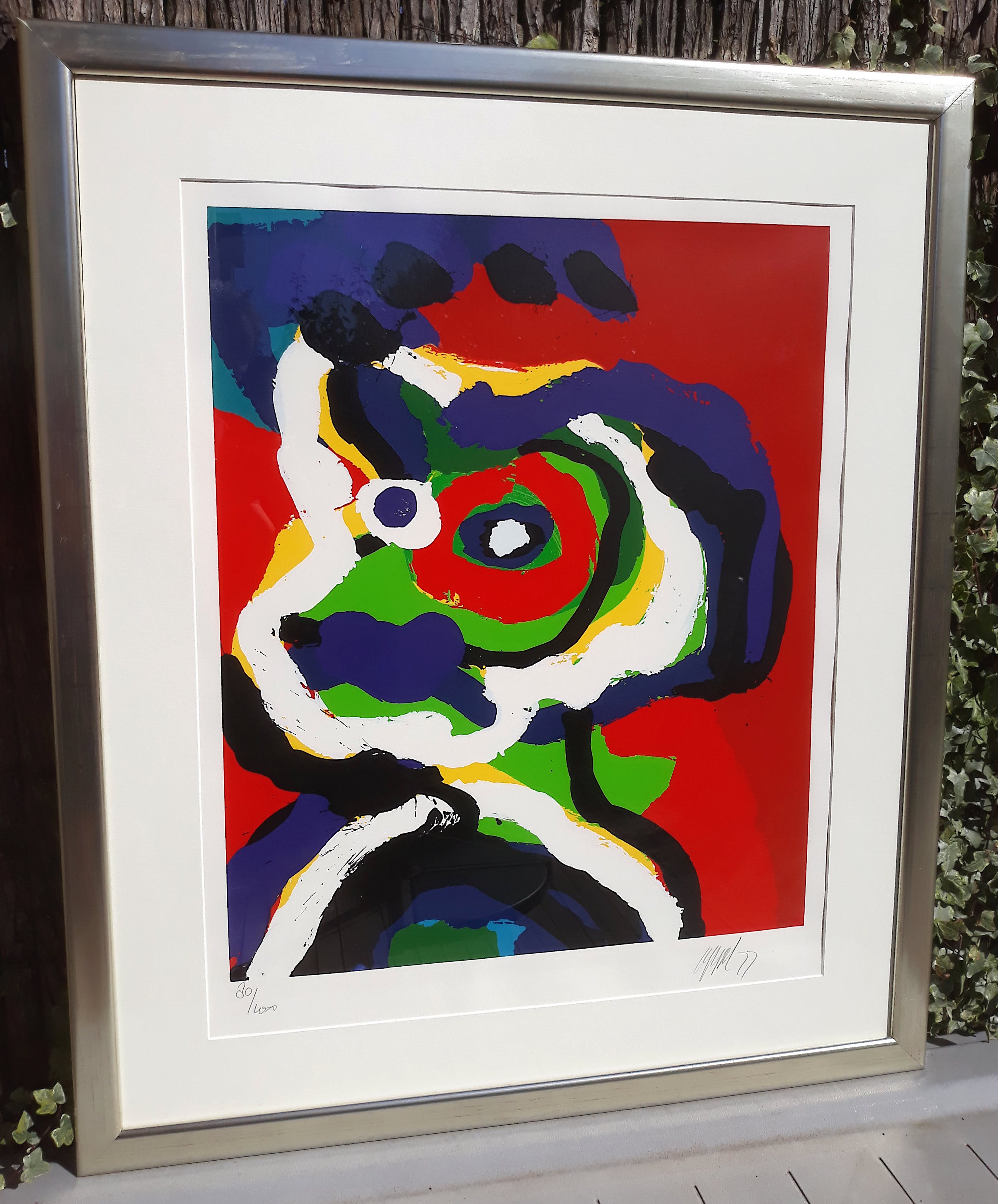 Prachtig werk van Karel Appel uit de serie Seven Summer Days, misschien wel zijn beste (en mooiste) serie werken na zijn “Paysages Humains” periode. Zeefdruk op 350 grams Economos-Etching papier, met potlood gesigneerd, gedateerd (’77) en genummerd (80/100). Het volledige blad in mooie lijst, achter glas en met smetteloos, zuurvrij passe-partout. In zeer goede conditie; zeefdruk in mint conditie, lijst mist op een tweetal plekjes wat vernis in de hoek rechtsboven (zie foto).