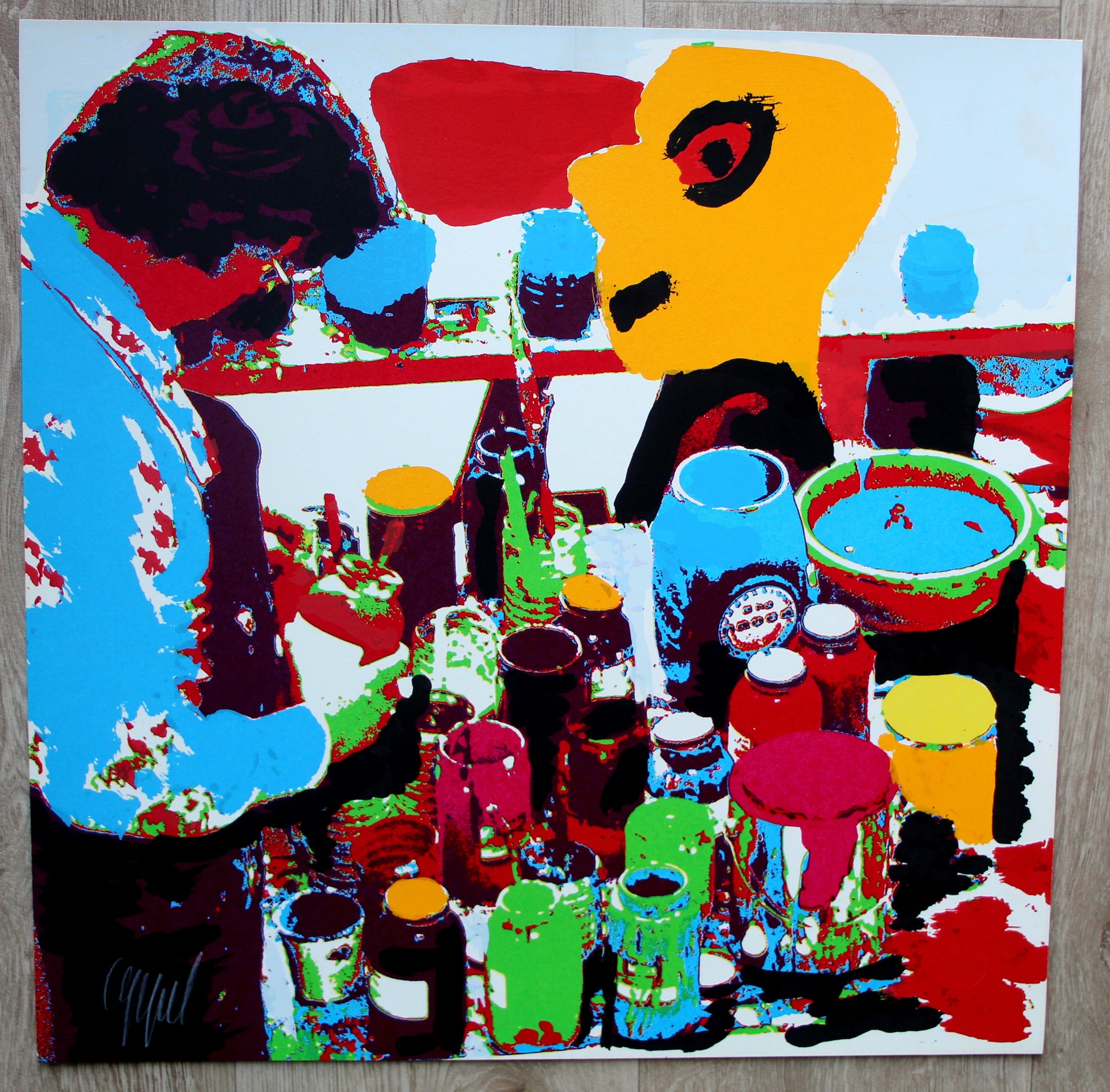 Bijzonder om te weten is dat deze zeefdruk afkomstig is uit de privé collectie van Henk van der Vet (Met Karel Appel maakte Henk van der Vet in 1977 onder andere het album Seven Summer Days, waarin zijn fotografieken door Appel zijn ingeschilderd).