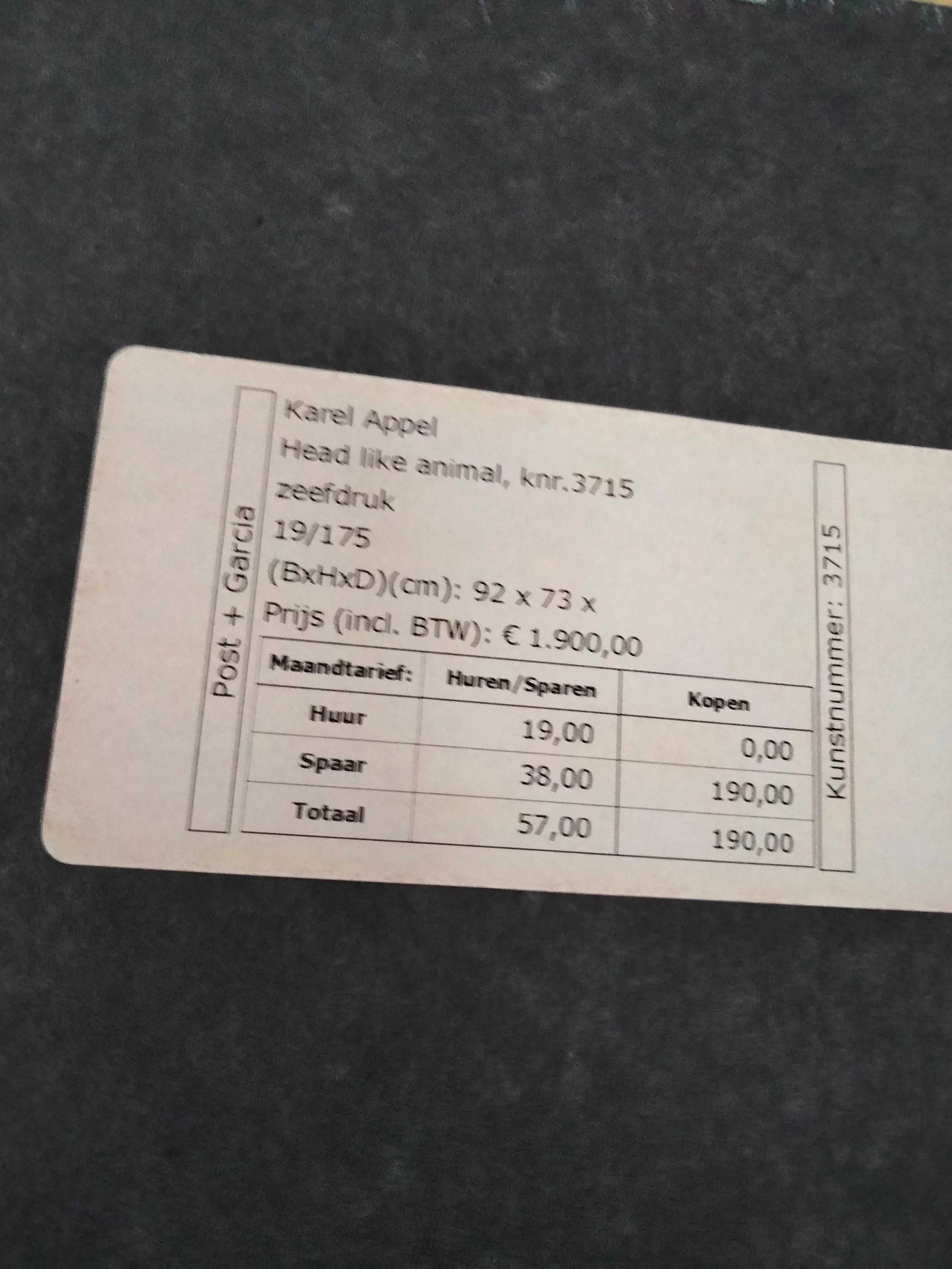 Het werk is af te halen op locatie. Als koper dient u zelf verpakkingsmateriaal mee te nemen. De locatie is: Eindhoven, Nederland