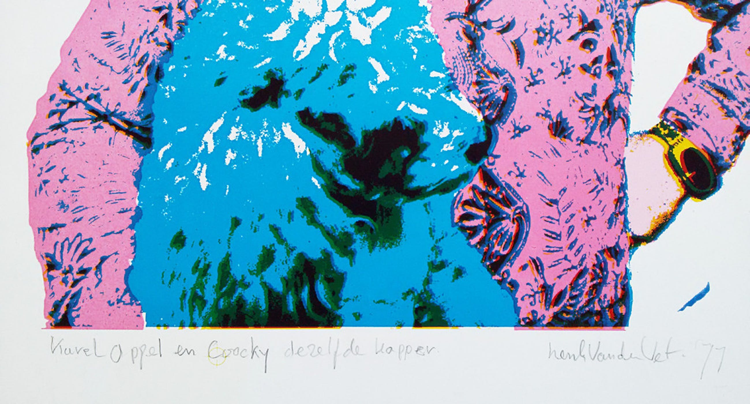 Zeefdruk op glad papier, door Henk van der Vet met potlood gesigneerd en gedateerd (‘77) rechtsonder. In redelijke conditie, her en der wel wat kreukjes in het blad.