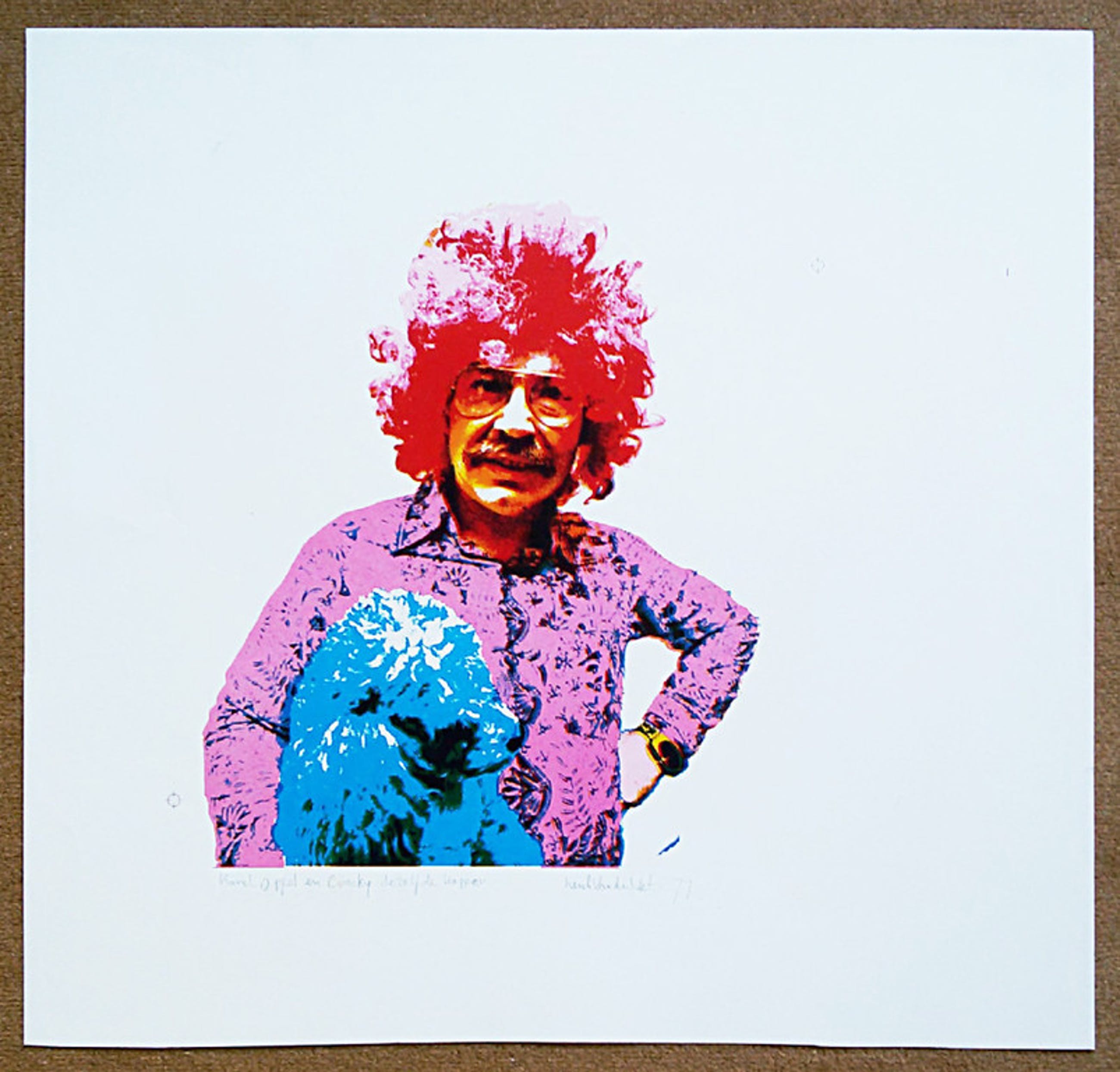 Zeldzame zeefdruk van Henk van der Vet, voorstellende Karel Appel en zijn poedel Coocky (of Coockie). Een must-have voor elke Karel Appel verzamelaar!