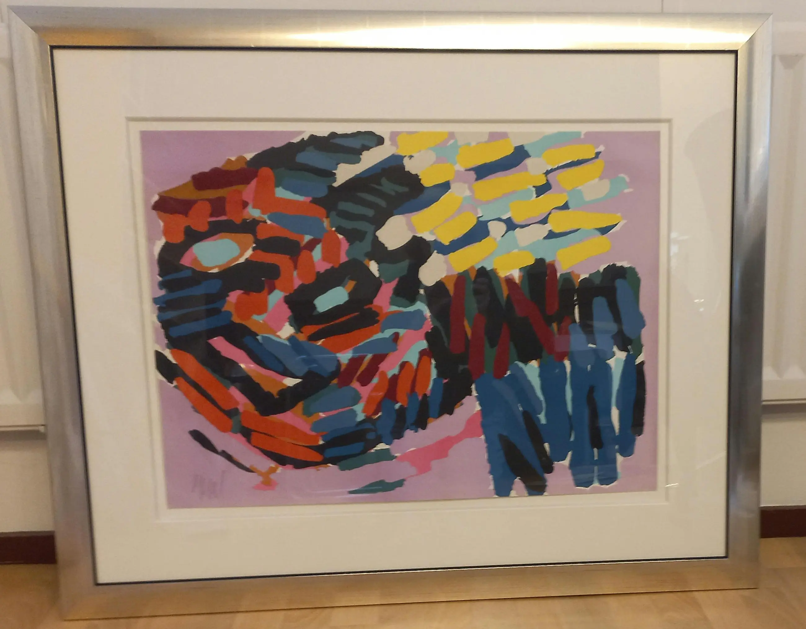 Titel: Here I am again Zeefdruk Formaat zeefdruk 54 x 75 cm Formaat lijst (gratis, zilverkleurig) 88 x 108 cm Oplage 70/175 1977 Certificaat van echtheid afgegeven door Famous, Amsterdam