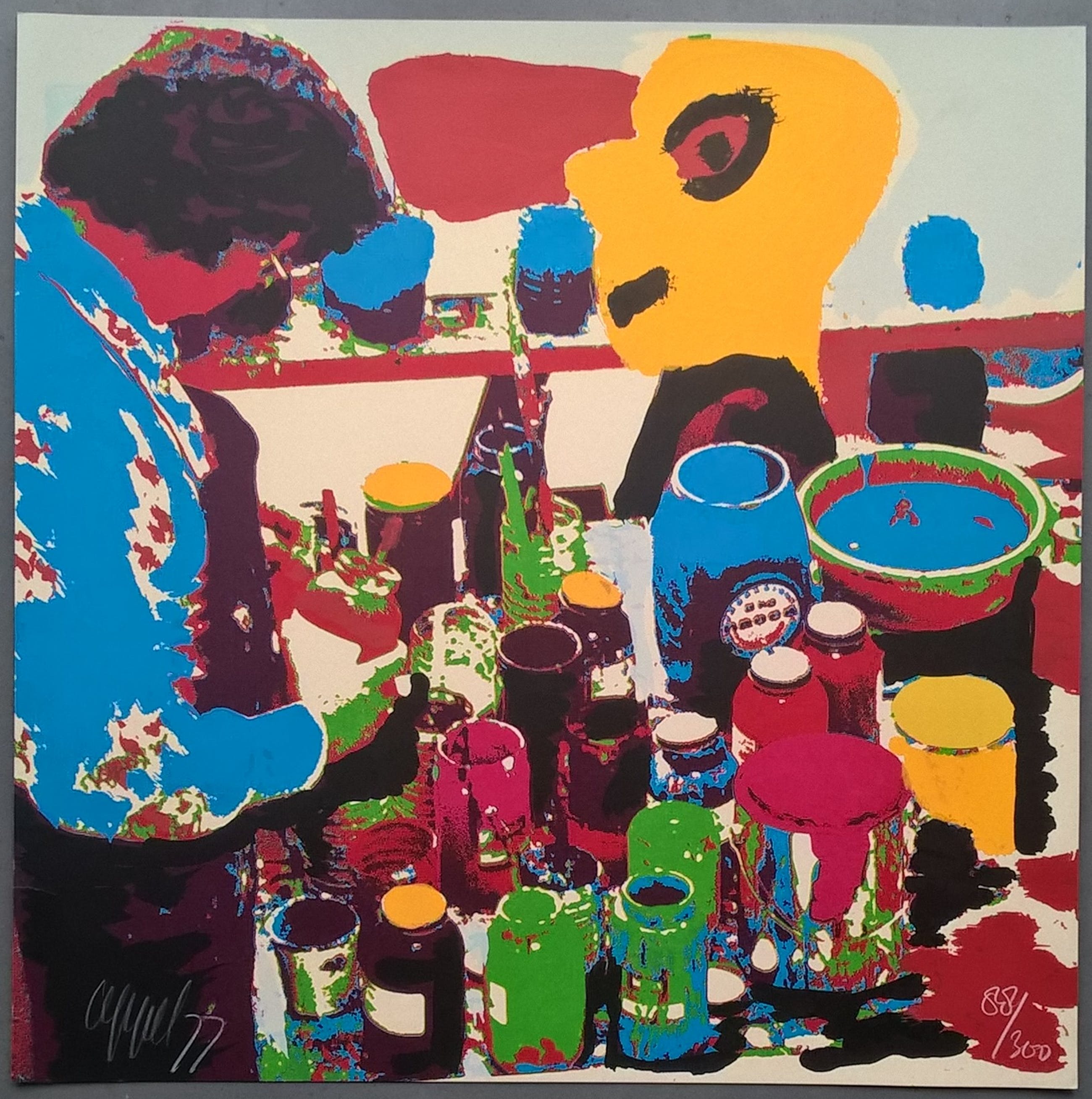 Gesigneerde zeefdruk van de kunstenaar Karel Appel uit de schilderskist. Linksonder is het werk gesigneerd met Appel 77, rechtsonder met 88/300. Afmeting 50 x 50 cm. In het papier zit links boven de handtekening een scheurtje van ca. 2cm, op de achterkant zitten lijmresten van eerdere inlijsting. Verder goed.