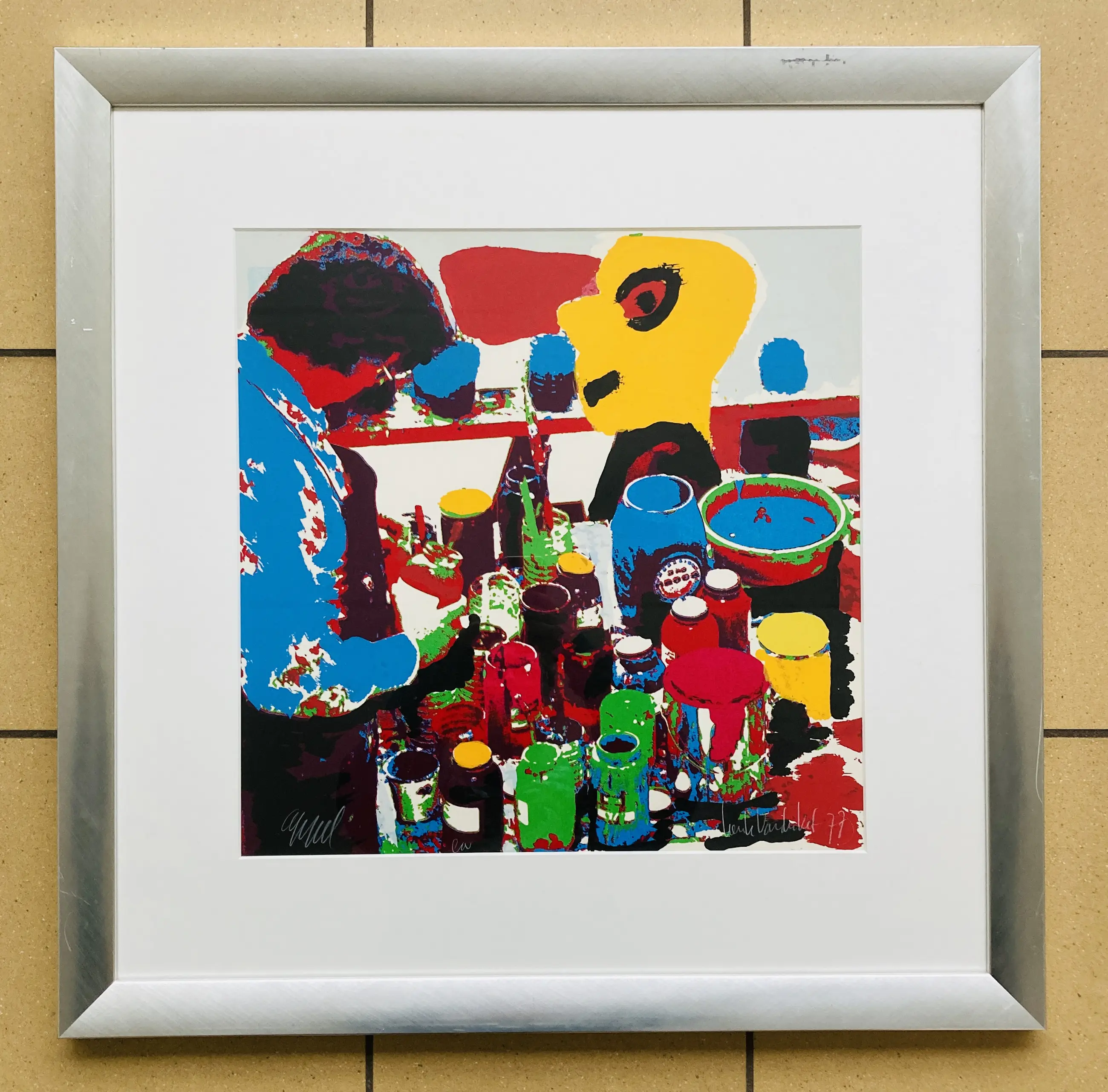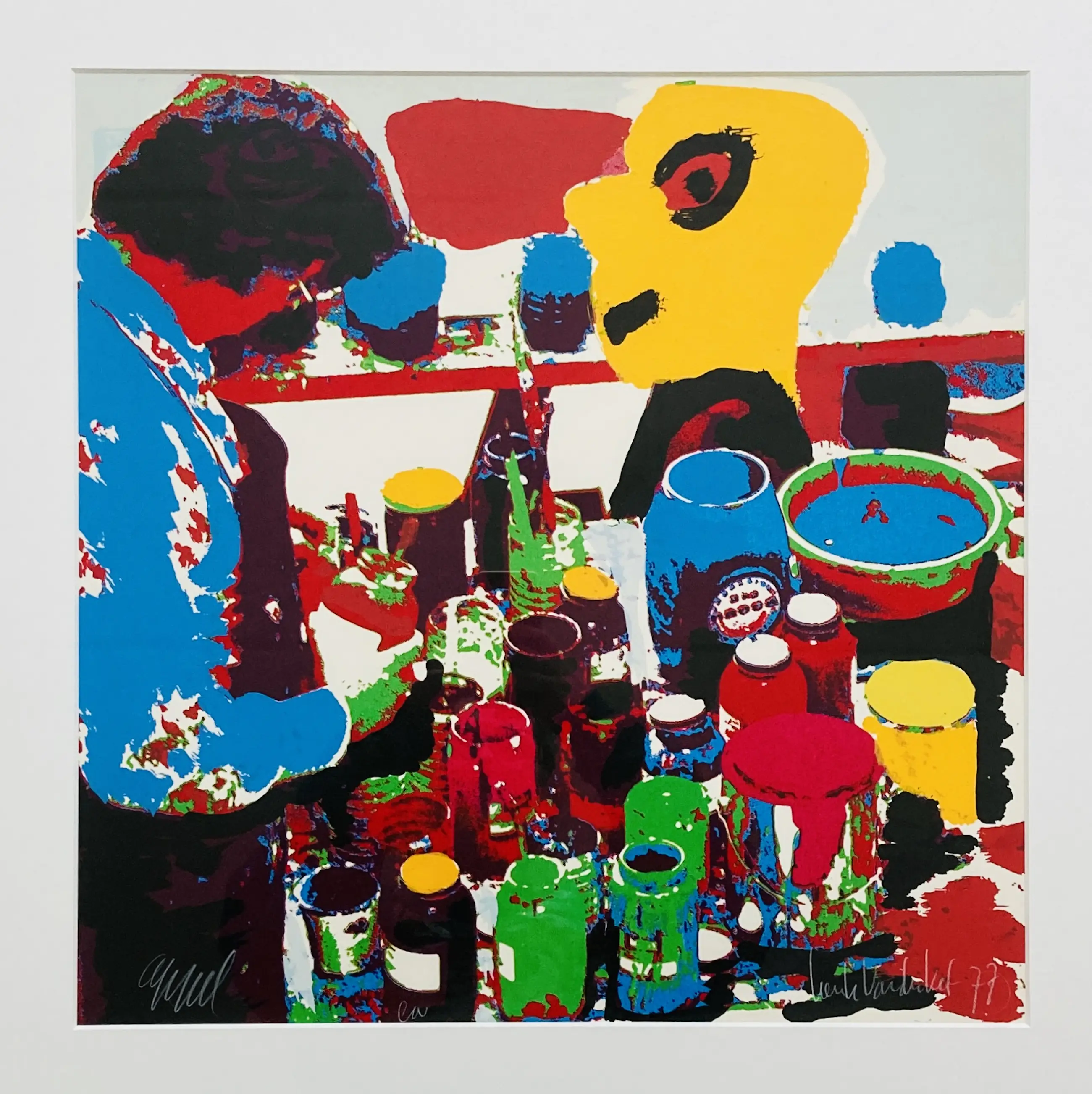 Een kleurrijke zeefdruk van de Nederlandse kunstenaar Karel Appel (1921 - 2006). Het werk is in samenwerking met drukker Henk van der Vet gemaakt, die het werk ook heeft gesigneerd. De zeefdruk verkeert in uitstekende conditie en komt met een gebruikte lijst met kleine beschadigingen.