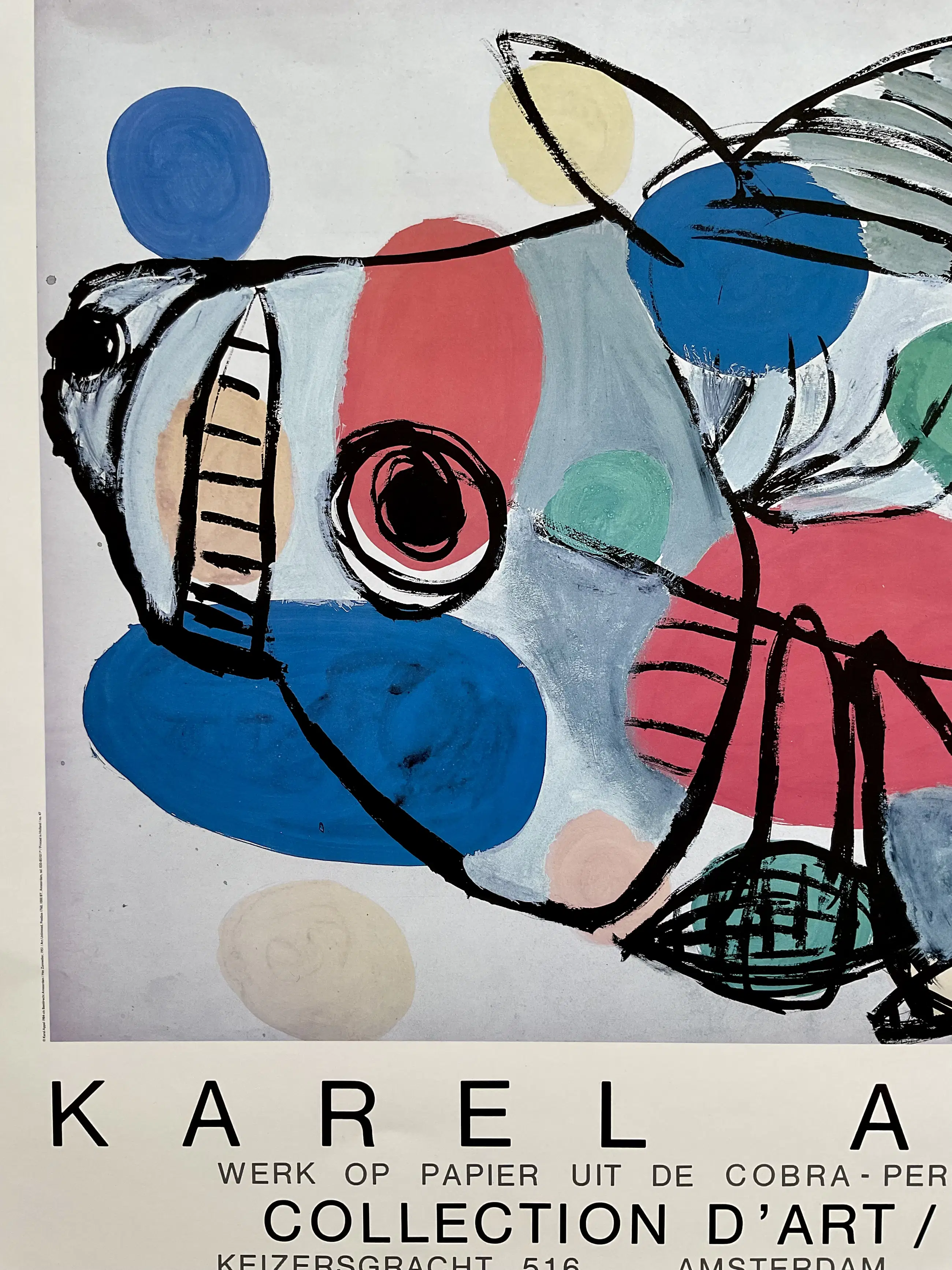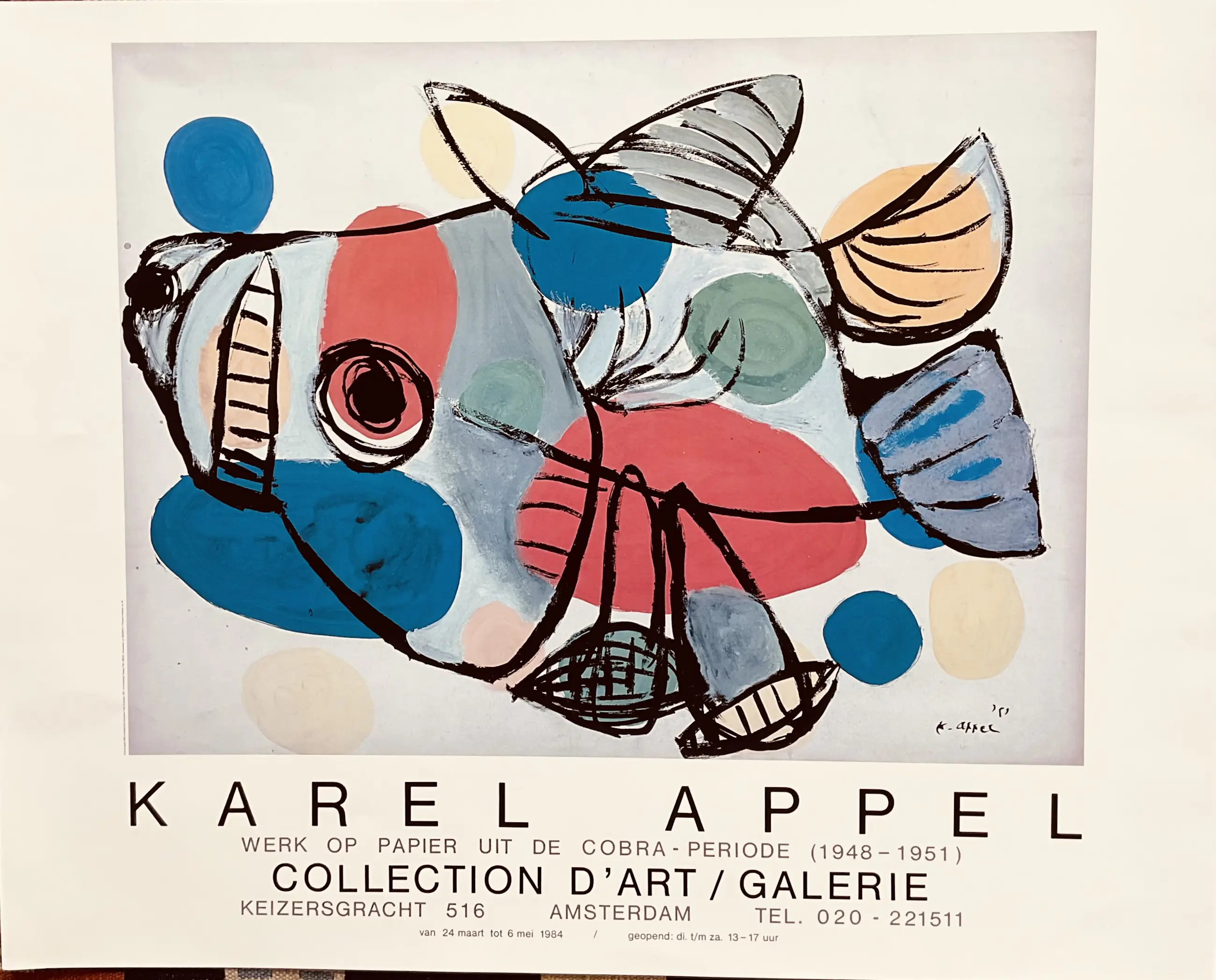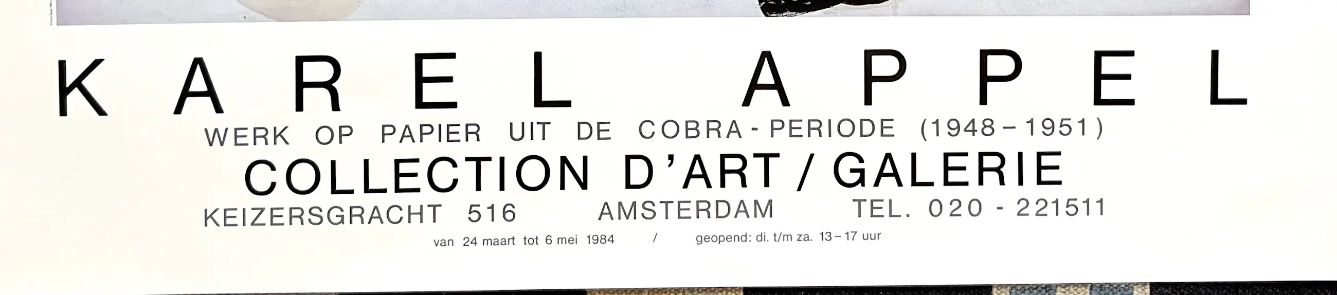 Karel Appel Tentoonstellingsaffiche Titel Het Zonnedier Afmetingen 60x75 cm offset litho , Cobra periode Uitgave Collection d’Art Galerie van destijds zeer bekende galerie van Cora de Vries in Amsterdam Collection d’Art richtte zich vooral op de nationale kunstmarkt. Zoals de meeste galeries in de jaren zeventig en tachtig bestond de klantenkring voornamelijk uit Nederlandse privéverzamelaars. Er werd weliswaar werk van buitenlandse kunstenaars verkocht, maar de galerie had geen internationale ambities, zoals Art & Project, Riekje Swart en Helen van der Meij in deze periode wel hadden. Een enkele keer kreeg De Vries het voor elkaar om een grote internationale naam te strikken. Een onverwacht bezoek van Jasper Johns aan de galerie in 1970 resulteerde een jaar later tot een paar bescheiden werken van de Amerikaanse kunstenaar in de galerie. In 1973 en 1976 vonden solotentoonstellingen van Willem de Kooning plaats. Gesigneerd in de druk Op stevig papier. Conditie prima Wordt aangetekend verzonden
