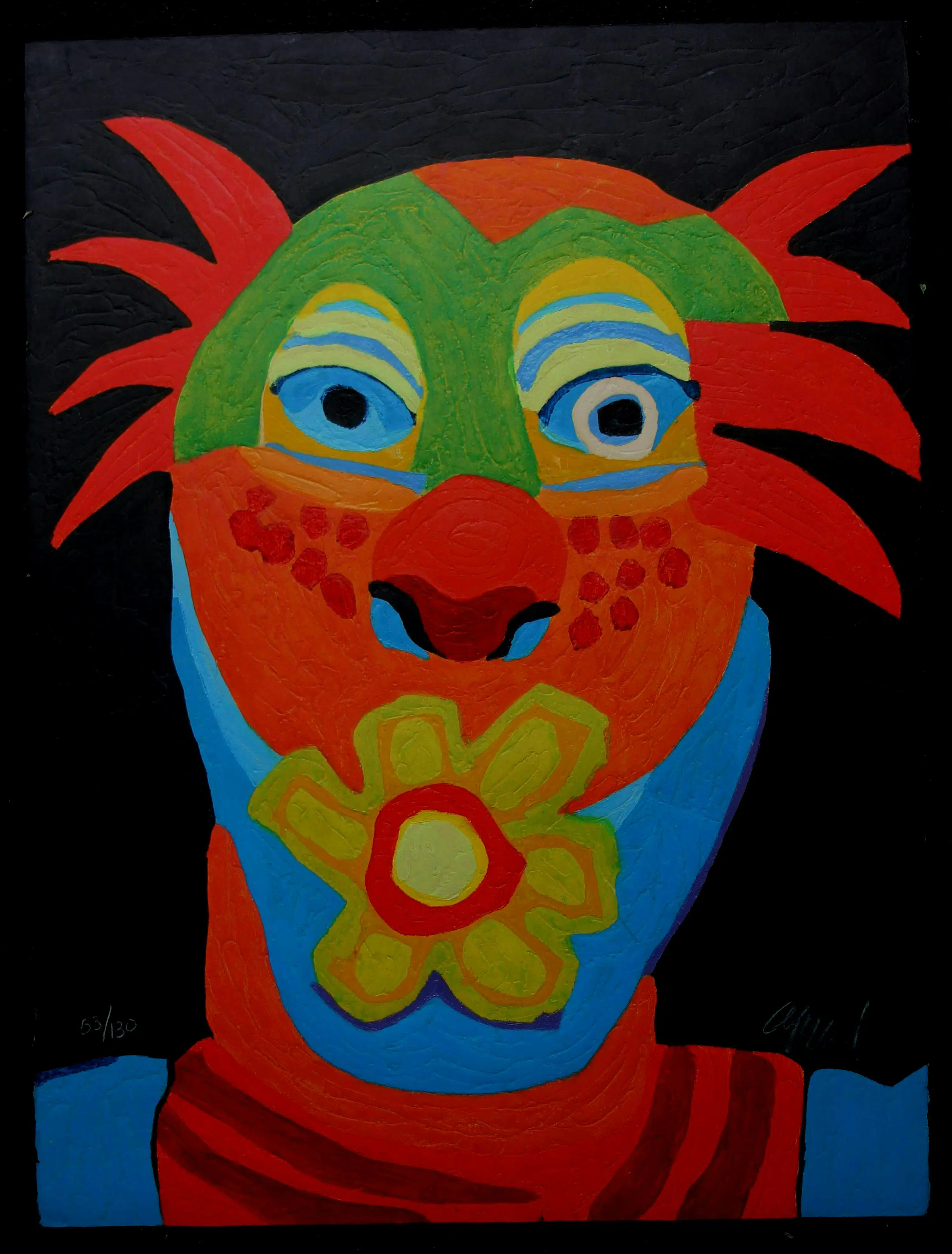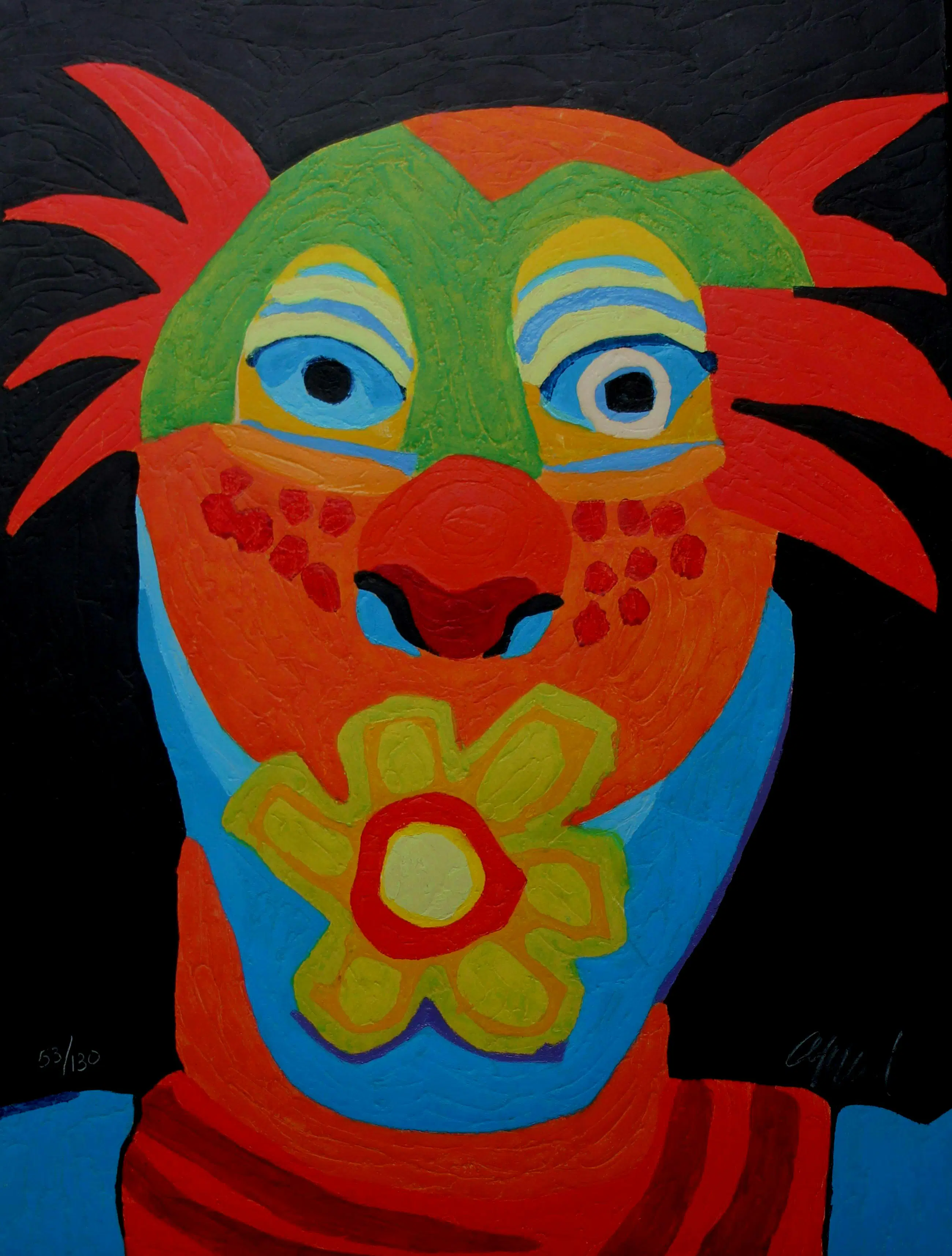 Houtgravure van Karel Appel. Titel: leeuwentemmer met een roosuit de Circus serie. Jaar: 1978. Oplage: 53/130. Afmetingen blad: H76 x b56cm. Het werk is rechtsonder gesigneerd door Karel Appel. De authenticiteit van het aangeboden werk wordt volledig gegarandeerd. Een certificaat van echtheid kan, op aanvraag, na aankoop worden gemaild.