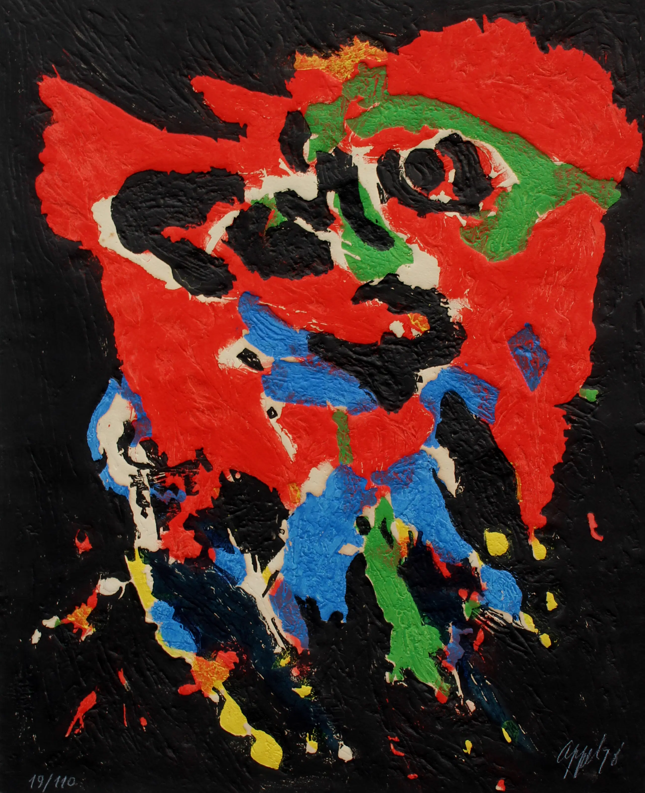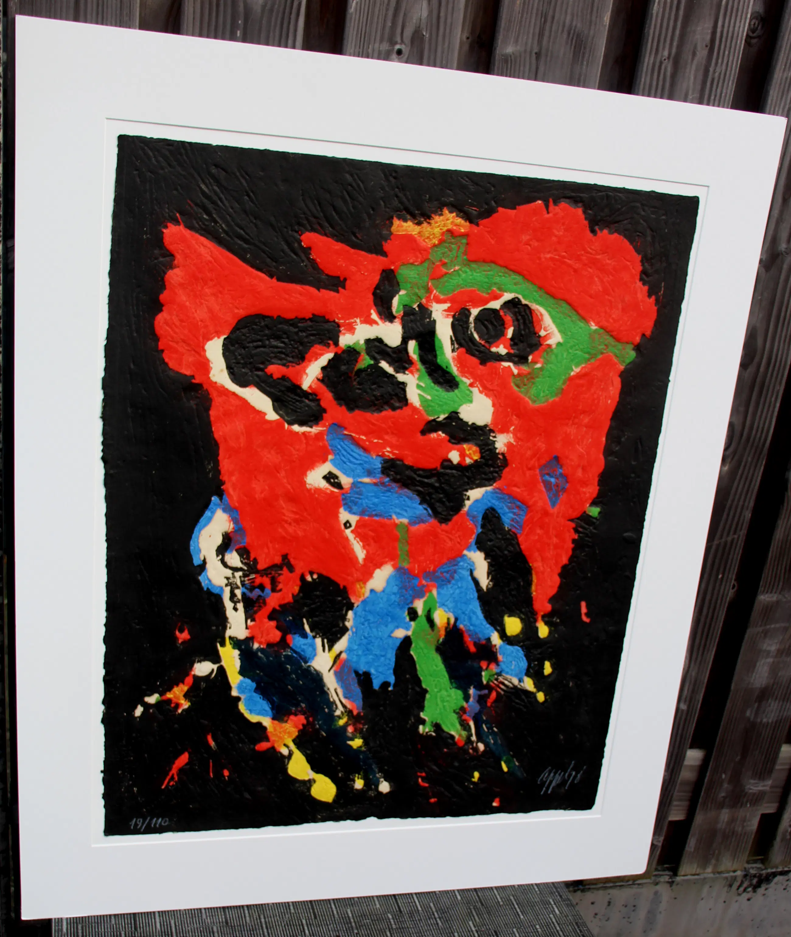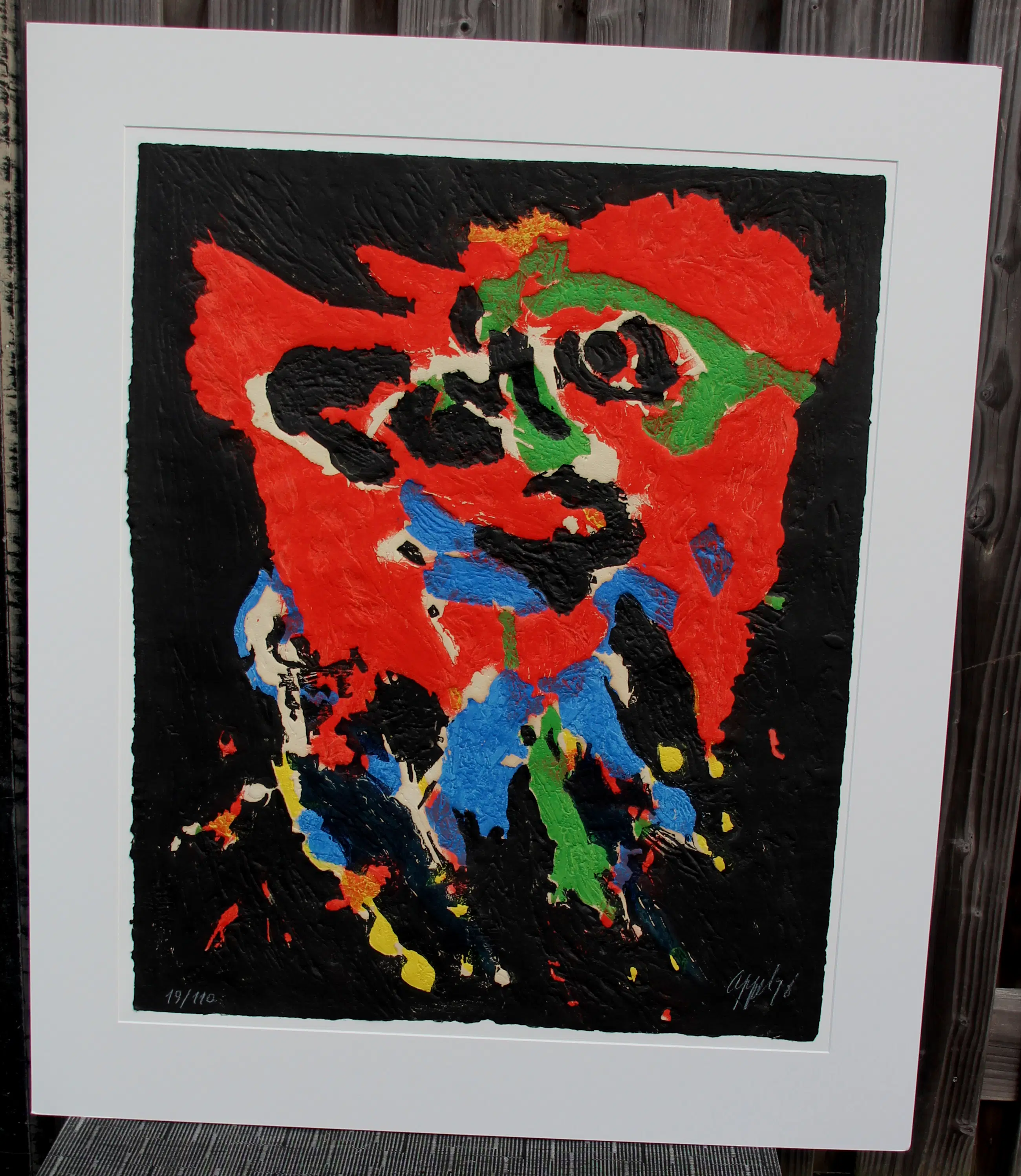 Ingelijste carborundum ets op papier, van Karel Appel(Carborundum, ook wel siliciumcarbide, is een extreem hard synthetisch materiaal dat bestaat uit silicium en koolstof en voornamelijk gebruikt wordt voor slijpen en polijsten). Titel: "Vliegende duivel". Jaar: 1976. Oplage: 19/110. Afmetingen incl passe-partout: H110 x b94cm. Afmetingen voorstelling: H88 x b73cm. Het werk is rechts onderaan, gesigneerd door de kunstenaar. De authenticiteit van het aangeboden werk wordt volledig gegarandeerd. Een certificaat van echtheid kan, op aanvraag, worden gemaild.
