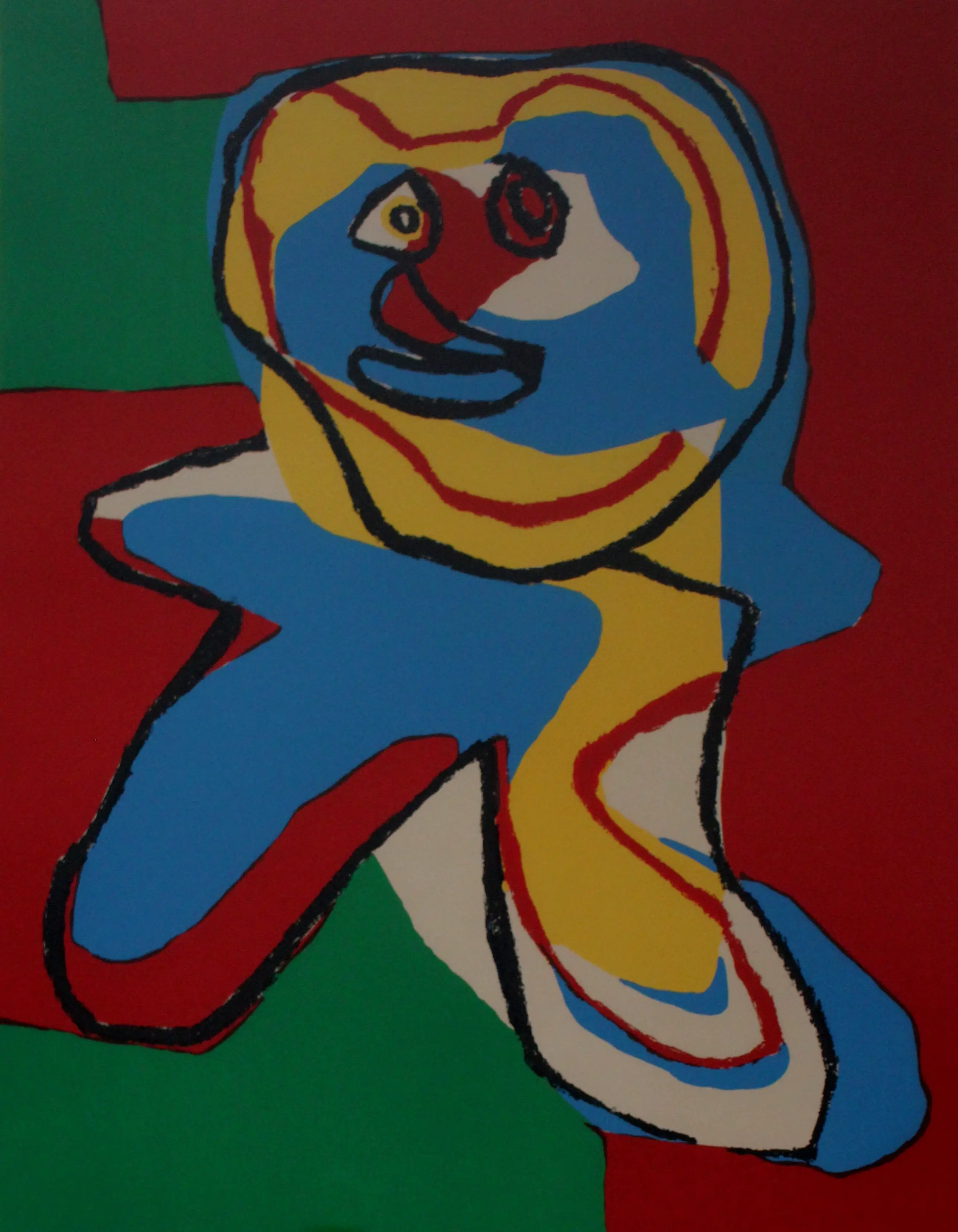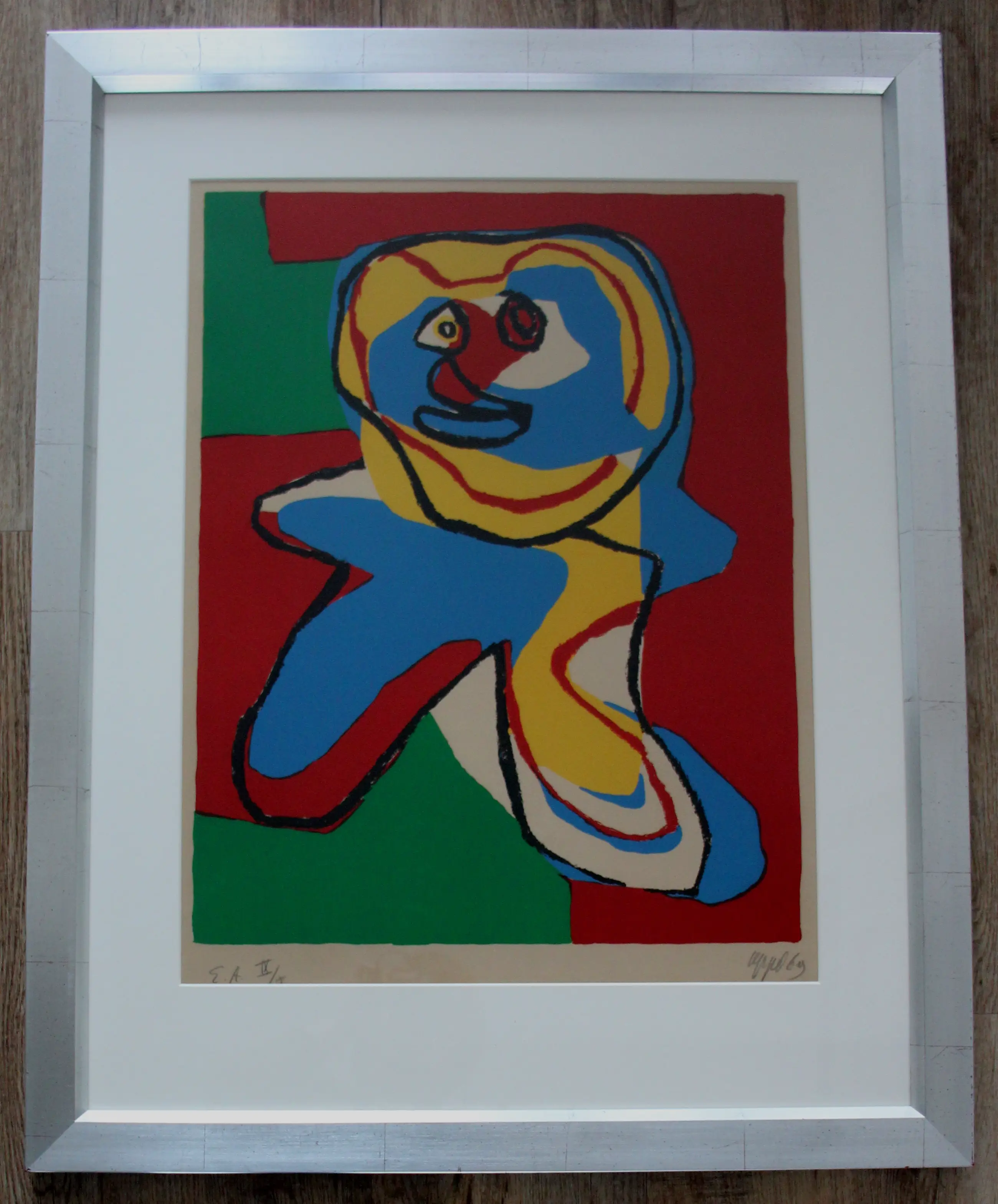 Ingelijste litho van Karel Appel. Titel: L'homme souriant. Jaar: 1969. Oplage: E.A, IV/V. Afmetingen incl lijst: H99 x b78.5cm. Afmetingen voorstelling: H65 x b50cm. Het werk is rechts onderaan gesigneerd door de kunstenaar. De authenticiteit van het aangeboden werk wordt volledig gegarandeerd. Een certificaat van echtheid wordt, op aanvraag, gemaild.