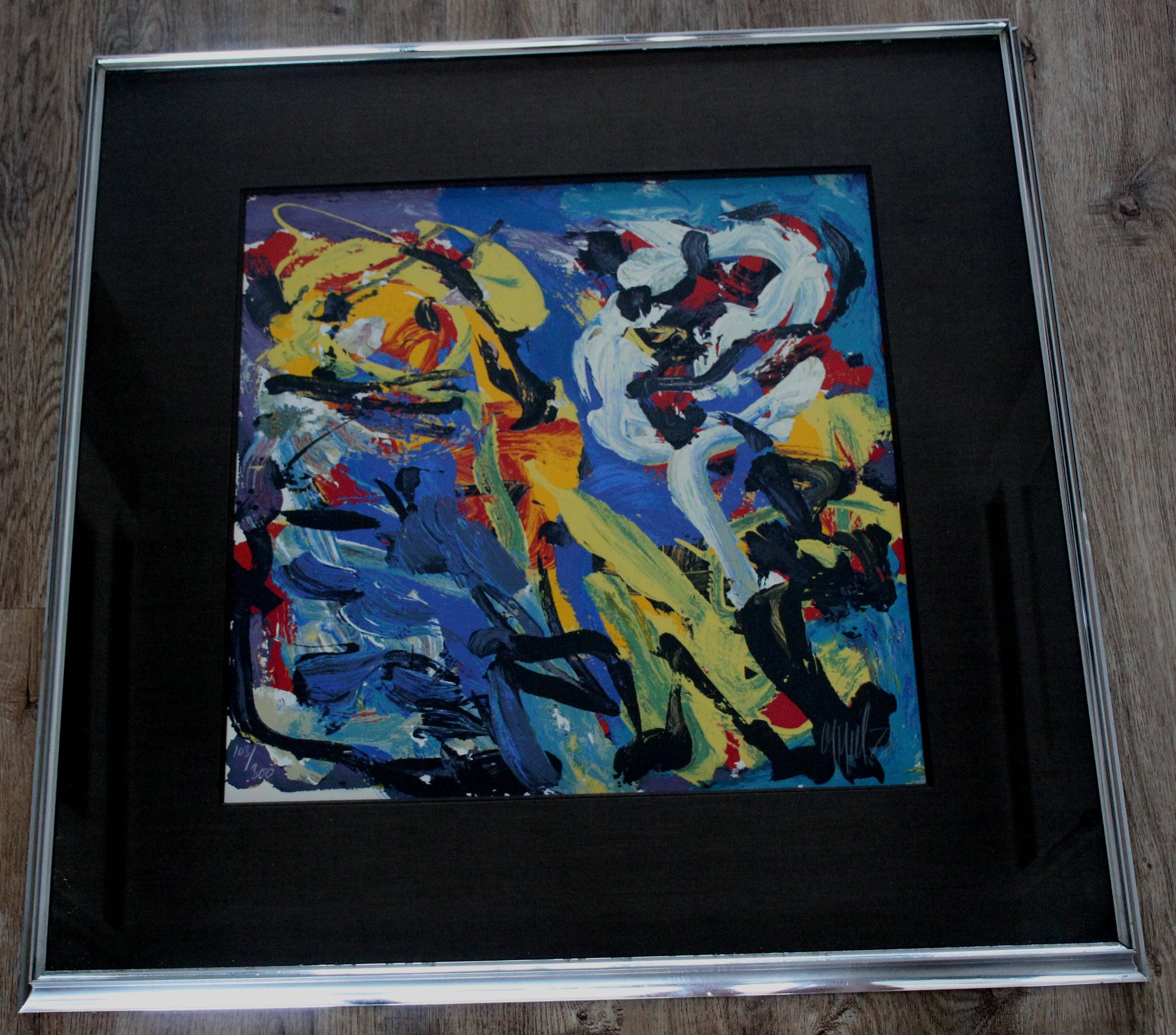 Ingelijste zeefdruk van Karel Appel. Nummer: 103/300. Jaar: 1977. Afmetingen incl lijst: H78 x b78cm. Afmetingen voorstelling: H49 x b49cm. Het werk is rechts onderaan, met potlood, gesigneerd door de kunstenaar. De authenticiteit van het, aangeboden werk, wordt volledig gegarandeerd. Een certificaat van echtheid zal worden gemaild.